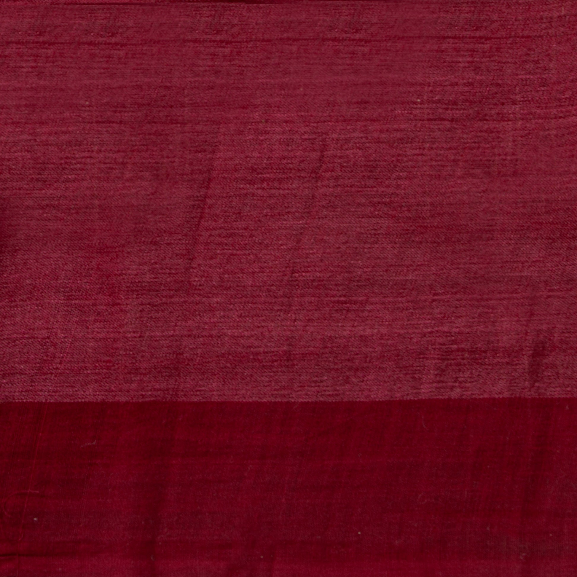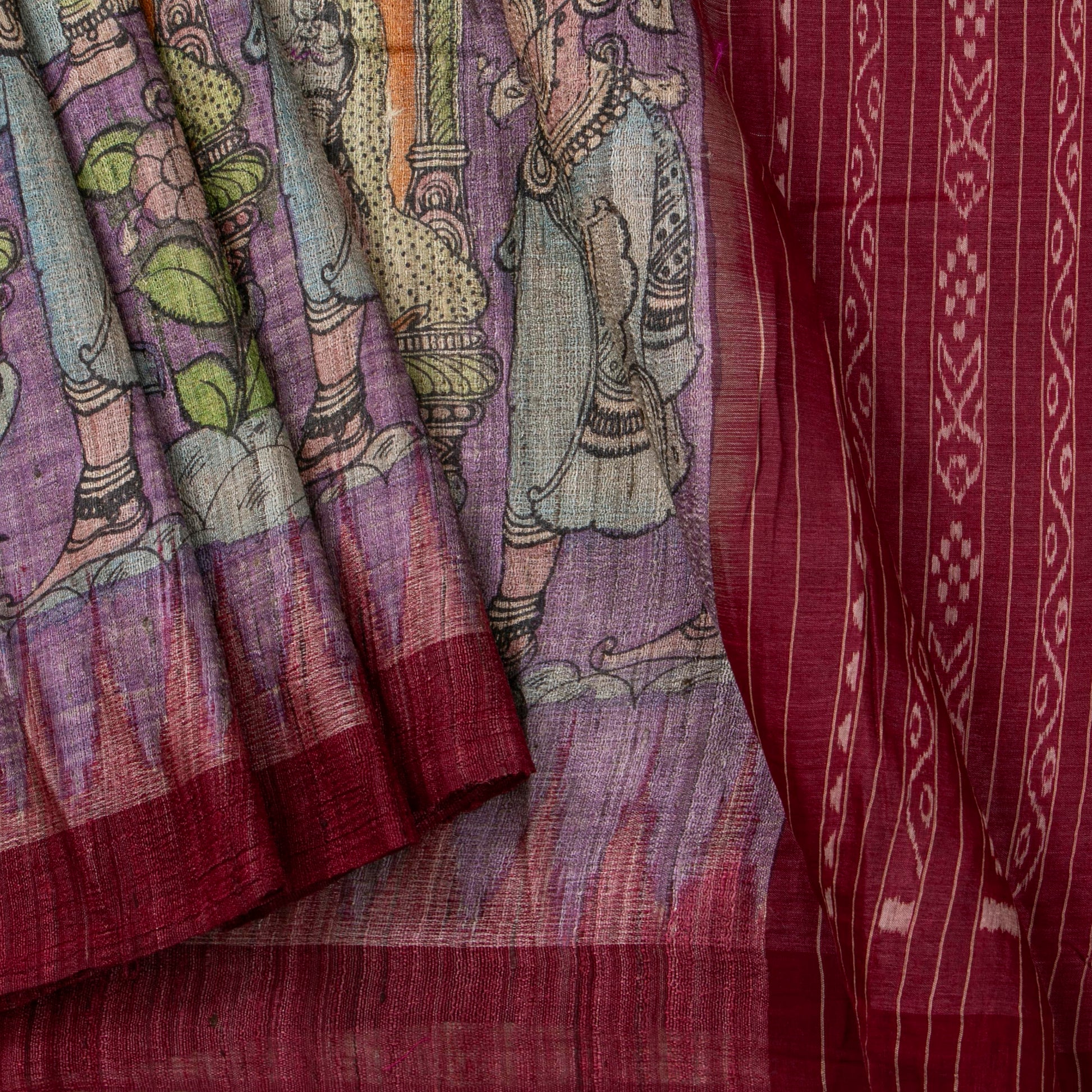 Mauve handpainted kalamkari on gicha tussar silk saree using vegetable organic dyes in a wedding theme based design. The borders and pallu are in maroon with a sambalpuri ikkat pallu and attached blouse.