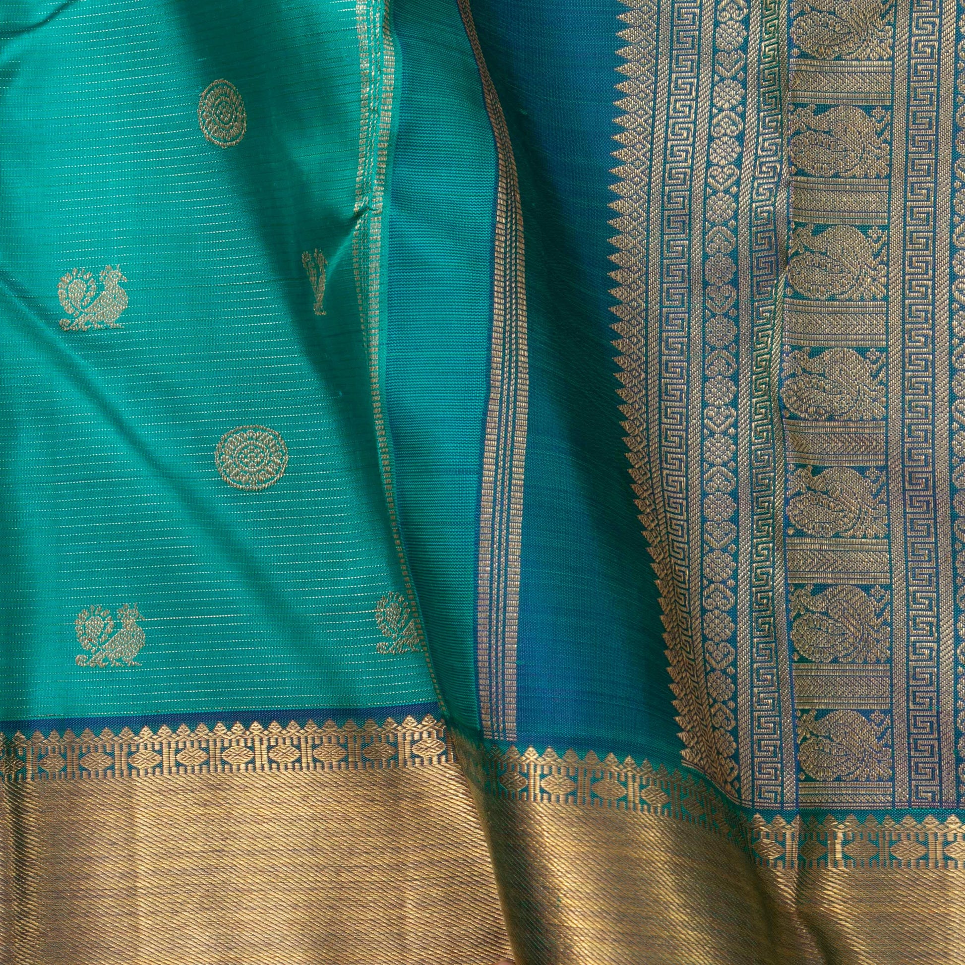 A mayilkazhuthu green and blue original kanchipuram silk saree handwoven in pure silk and pure zari. The body is in mayilkazhuthu green with vaira oosi stripes and annam and chakram motifs in gold zari. The blue border has banarasi patterns in gold zari. The blue pallu has peacock, paisley and diamond patterns in gold zari. The attached blouse is in blue with a zari armband matching the sari border.