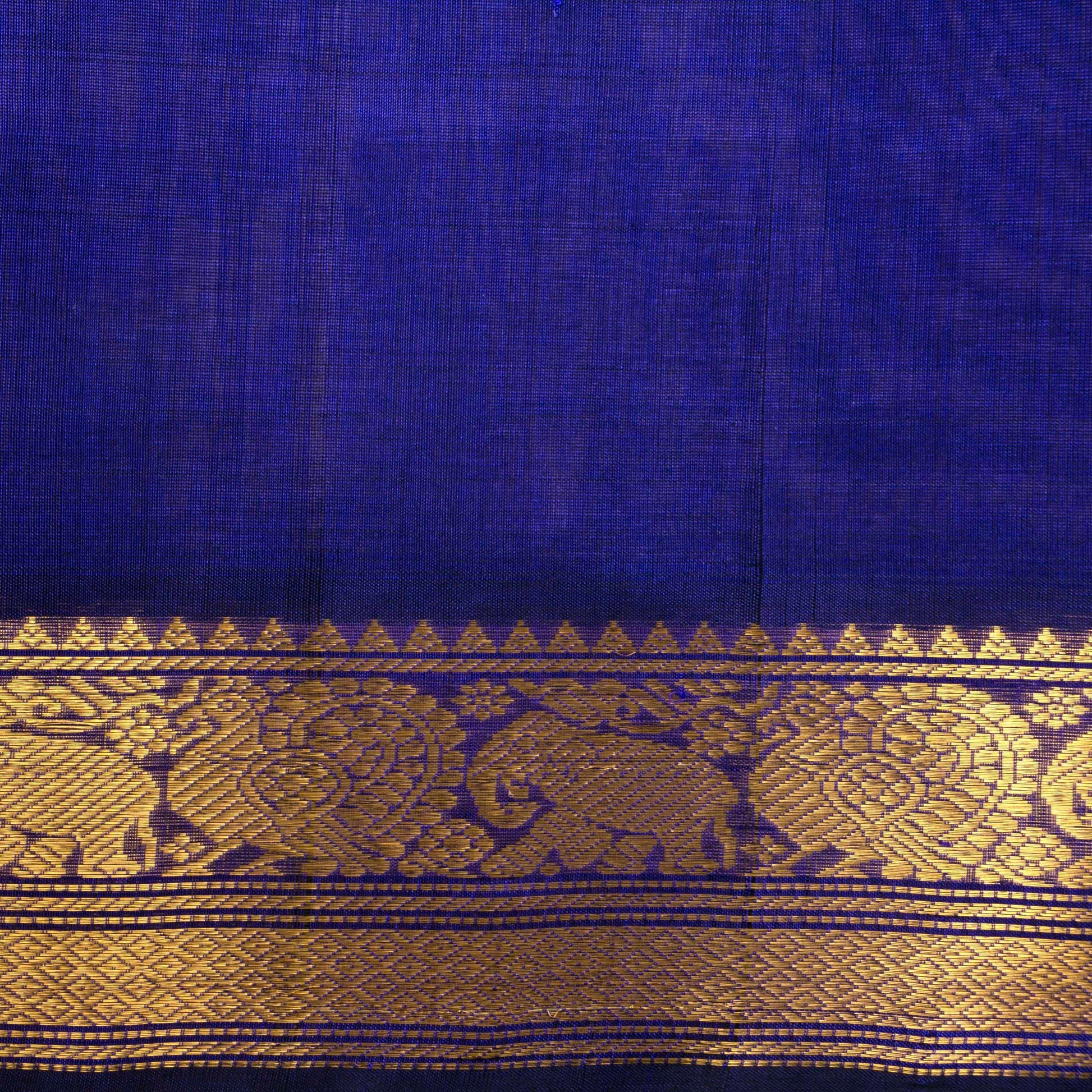 Multicolour checks kanchi silk cotton sari with greem blue and orange multi colour checked body and a blue korvai border with rich gold zari work in traditional designs. The blue pallu has columns of muthu kattam vari checks and traditional motifs in gold zari. The blue blouse has a zari arm band matching the saree border.