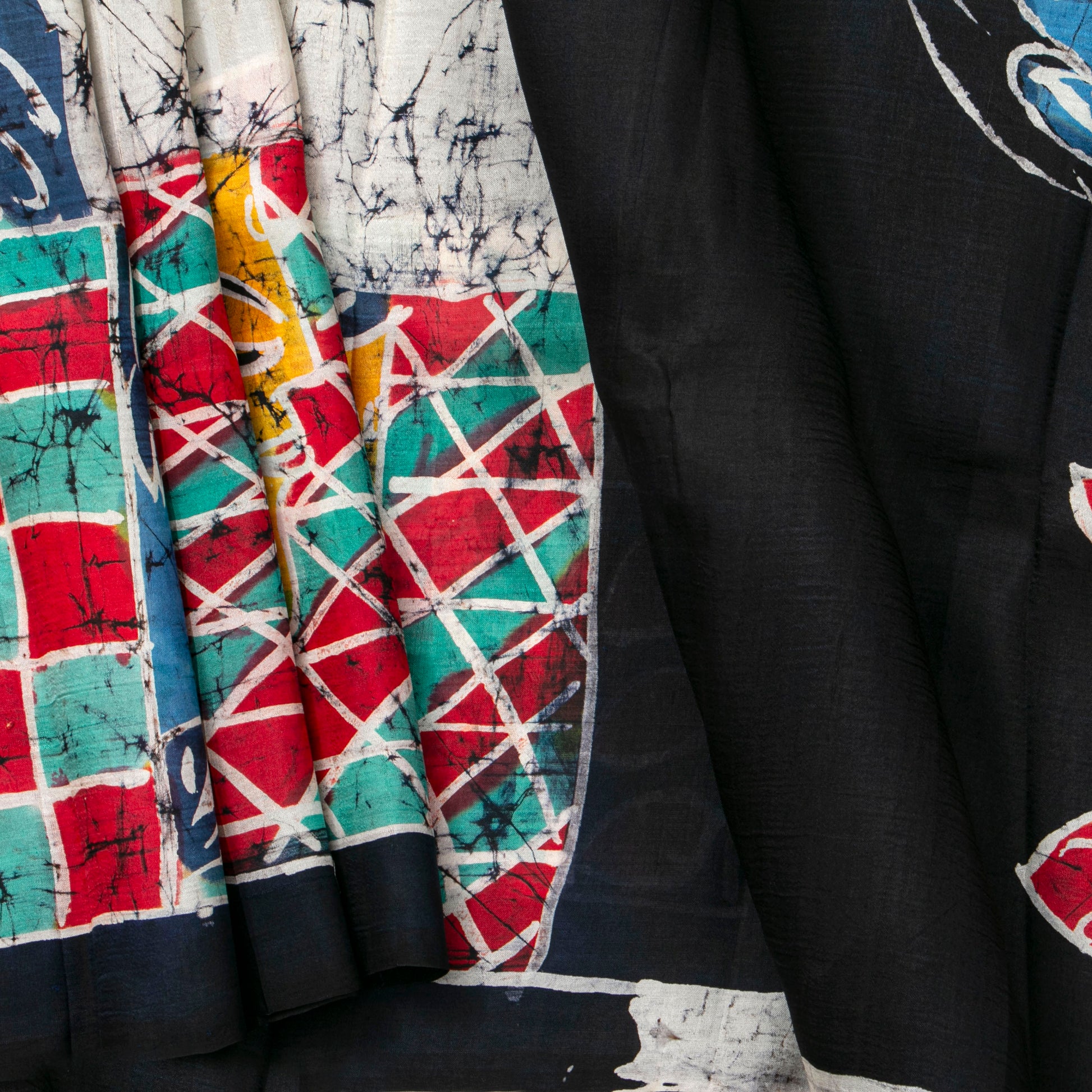Off White And Black Batik Silk Saree Borderless And Lightweight For Office Wear PB 335