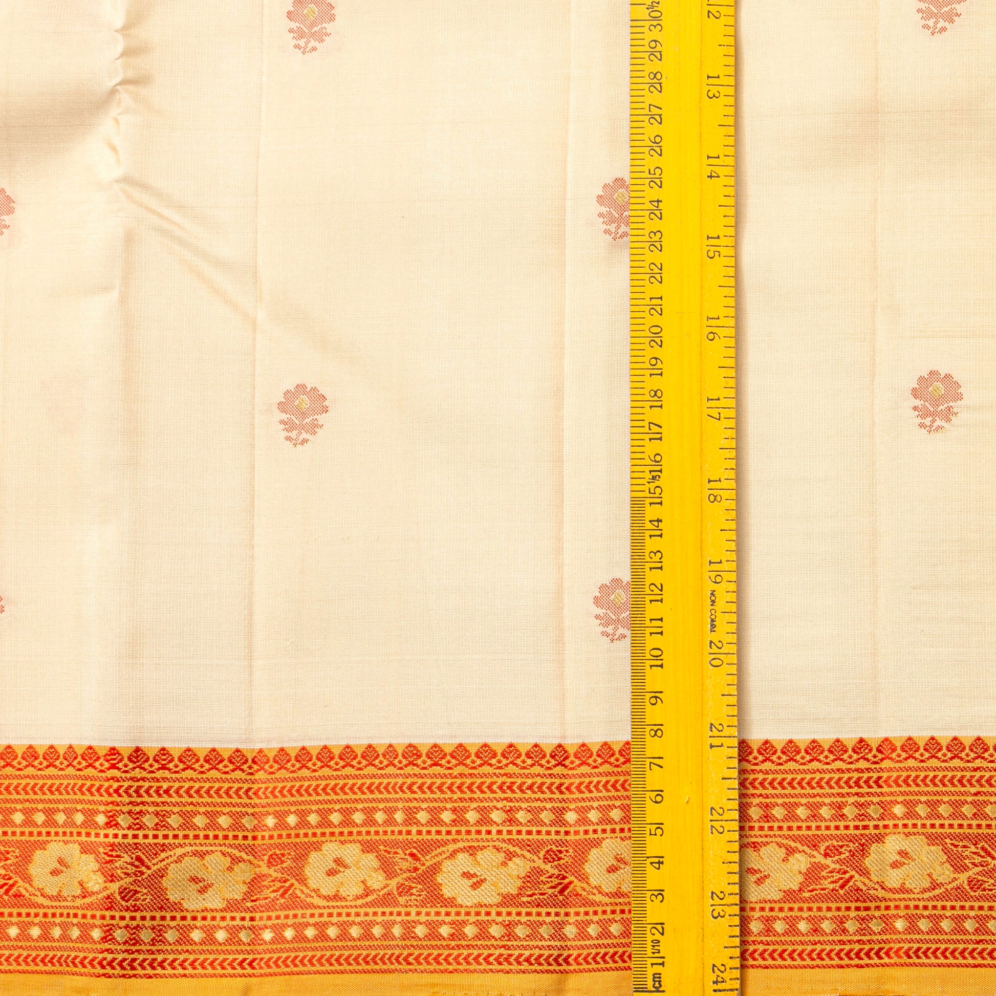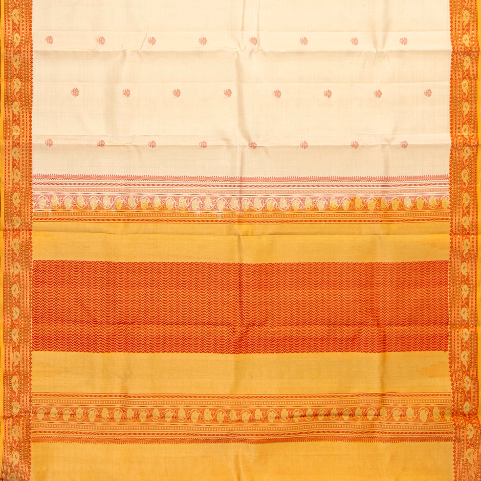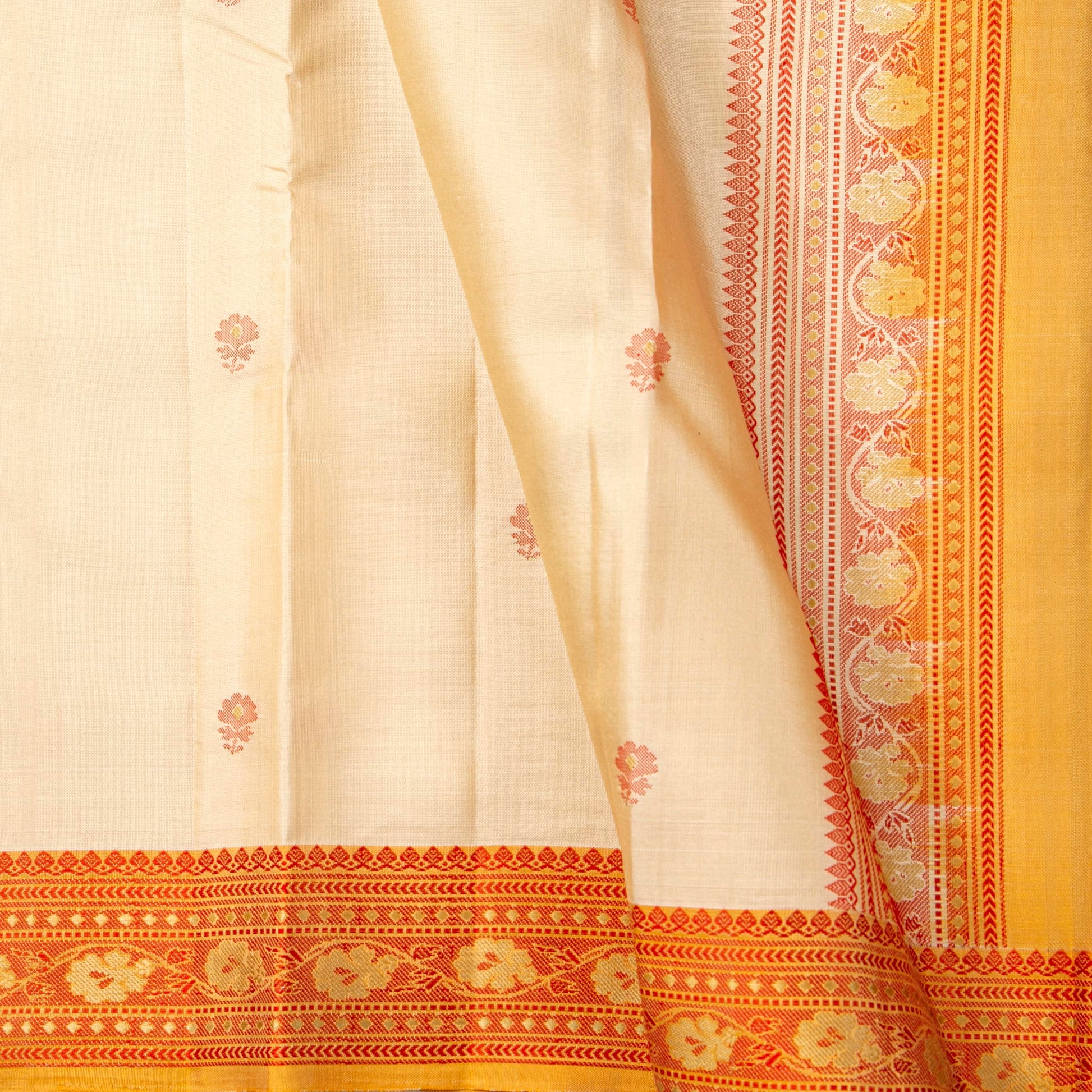 An off white original kanchipuram no zari silk saree handwoven in pure silk. The body is in off white with floral motifs in silk thread. The mustard border has floral pettu in red silk thread. The mustard pallu has traditional patterns in silk thread. The attached blouse in mustard has an arm band matching the saree borders.