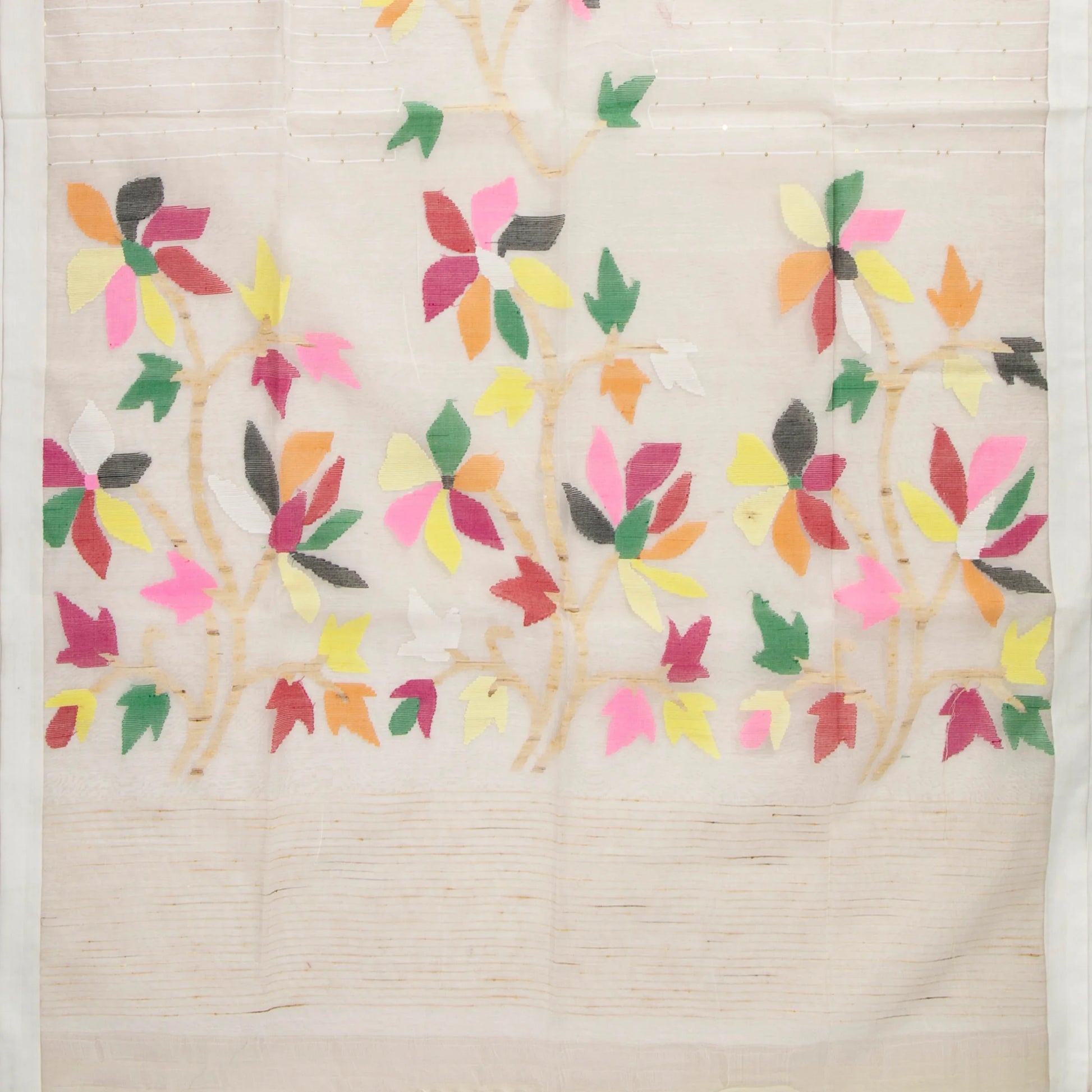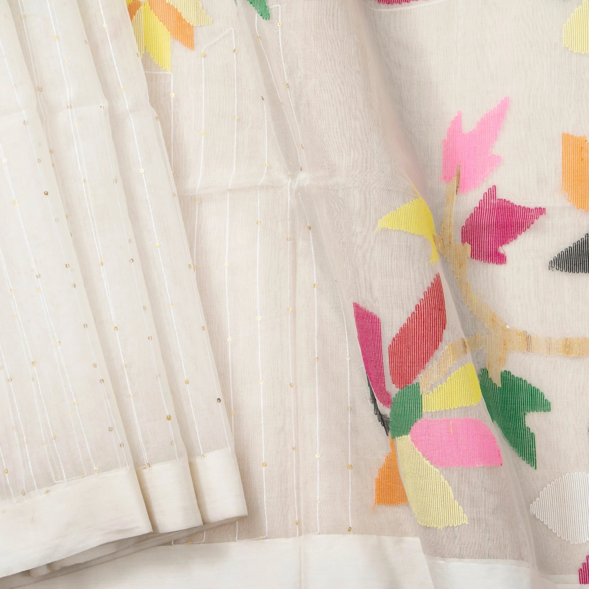 Off white tissue sequins dhakai jamdani mulmul silk saree with multicolour resham floral work and attached blouse