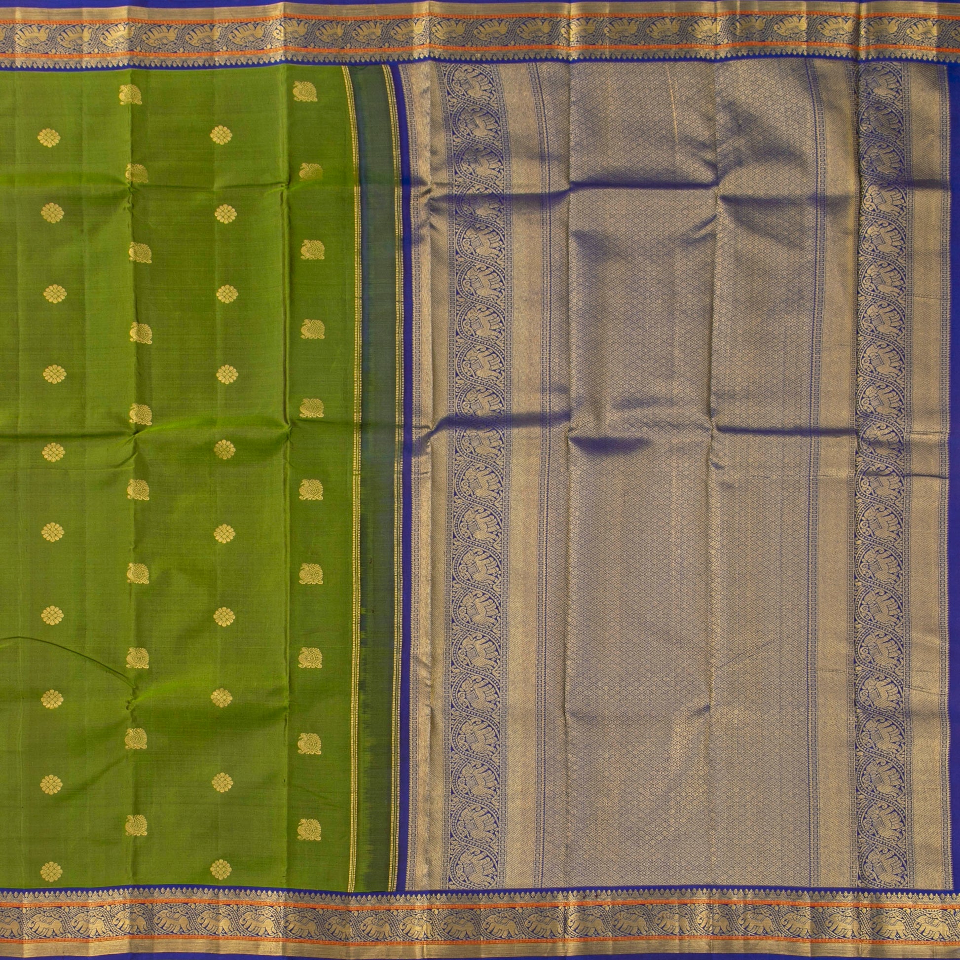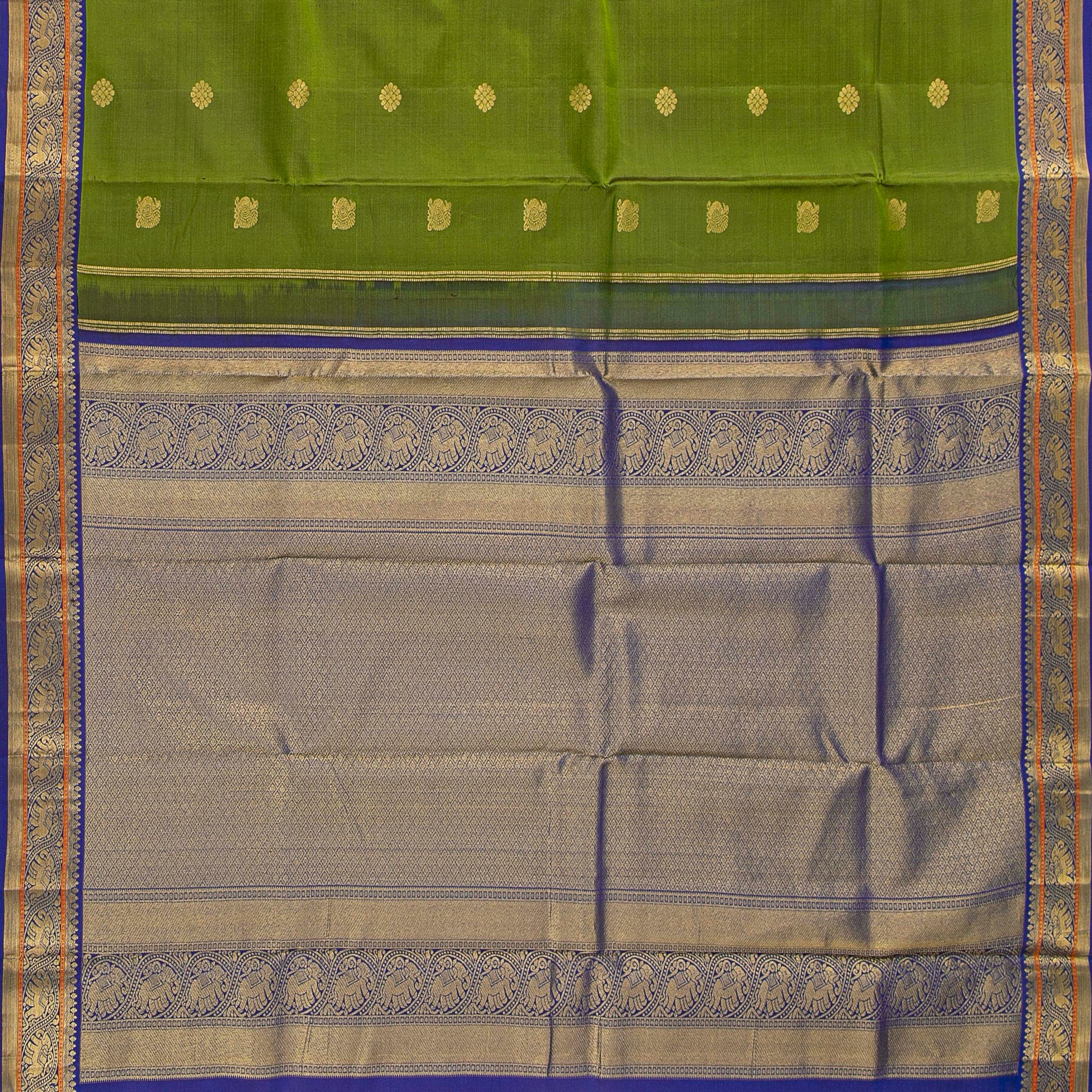 An olive green kanchipuram silk saree with a royal blue border and pallu handwoven in pure silk and pure zari. The olive green body has annapakshi and kamalam motifs in gold zari and the contrast royal blue borders and pallu have rich gold zari and silk thread work in traditional elephant and diamond motifs in gold zari. The royal blue blouse has a zari arm band matching the saree border for the blouse sleeve.