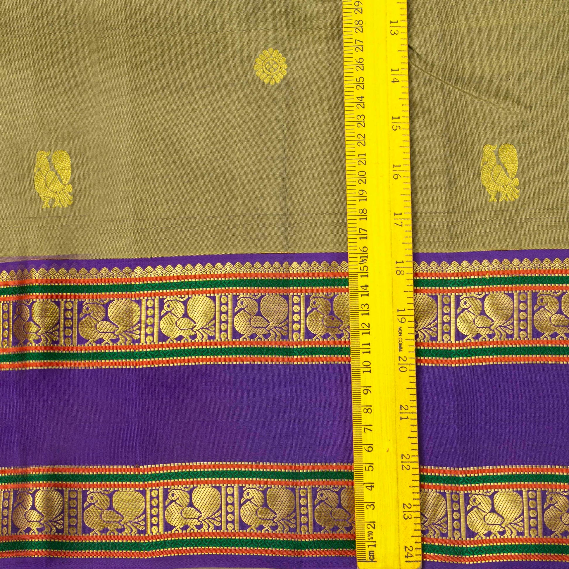 An olive green and violet kanchipuram silk saree handwoven in pure silk and pure zari. The body of the saree is in olive green with chakram and annapakshi motifs in gold zari all over the body. The contrast korvai rettai pettu borders are in violet with gold zari bands having annapakshi motifs and the korvai pallu in violet has rich gold zari work with annapakshi motifs in gold zari. The attached violet blouse has a rettai pettu band matching the saree border for the sleeve of the blouse.