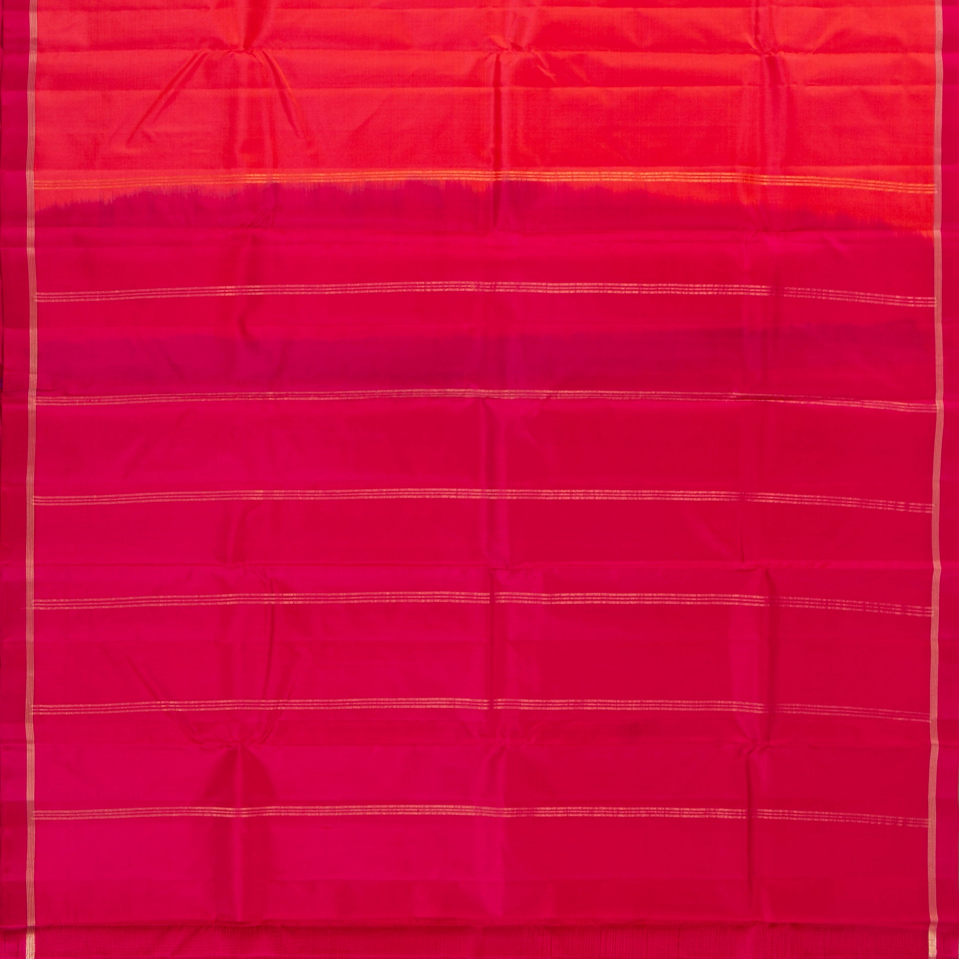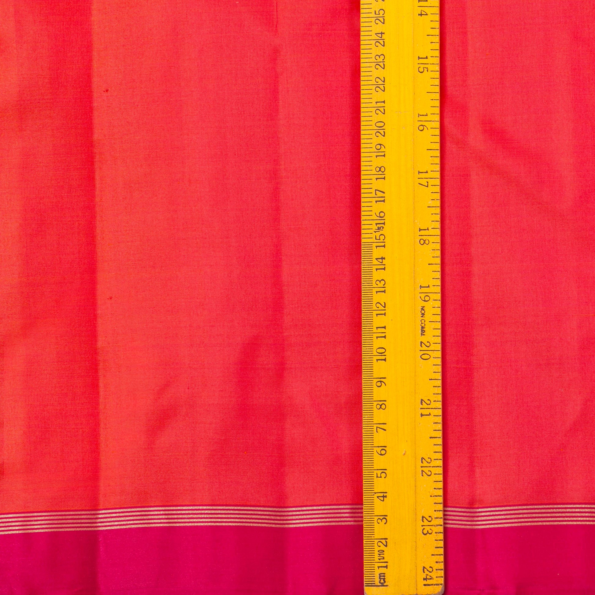 Light weight kanchipuram silk saree handwoven in pure silk. The body is in orange shot pink witha. pink border having zari stripes and a pink pallu with zari stripes. The attached blouse is in pink.