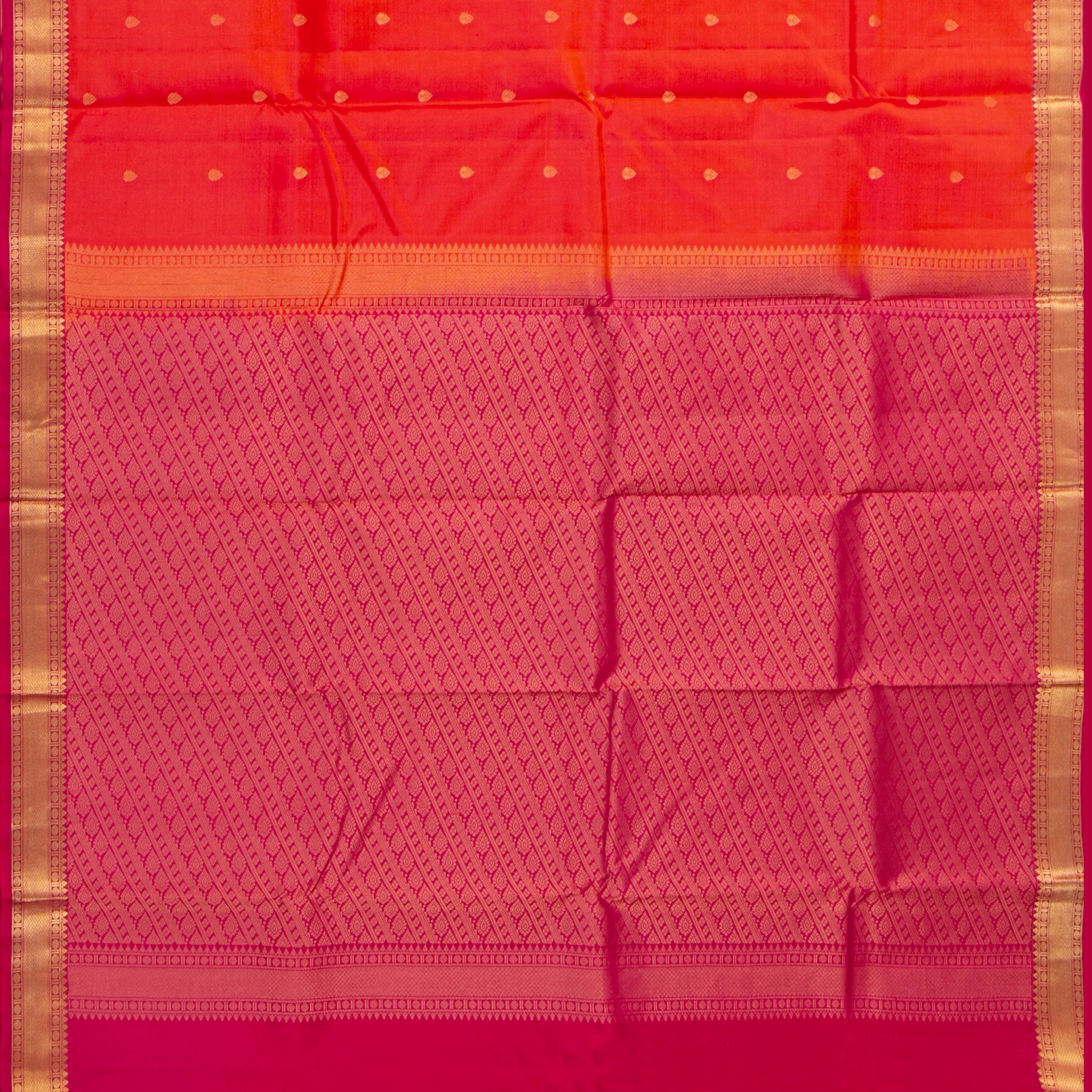 Orange and pink kanchipuram silk saree handwoven in pure silk. The body is in orange with floral patterns in gold zari. The pink border has rudraksham and mayilkann pettu in gold zari. The pink pallu has traditional patterns in gold zari. The attached blouse is in pink with an armband matching the saree border.