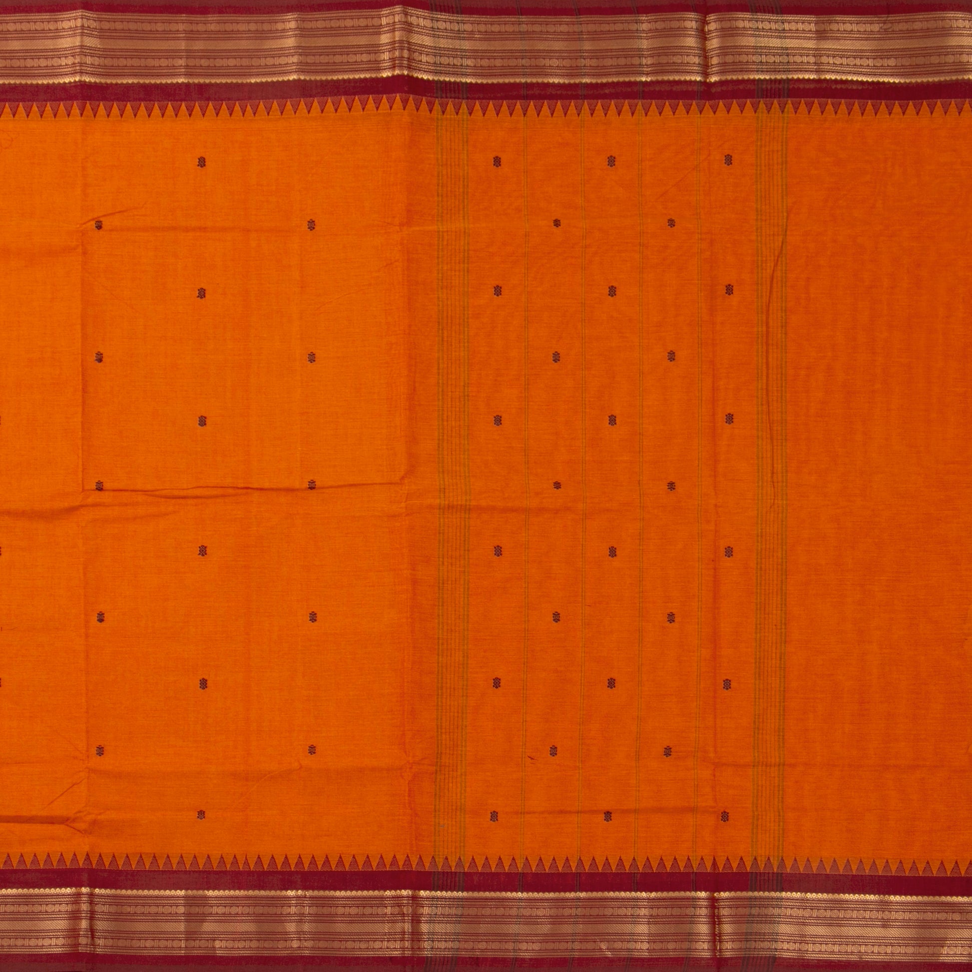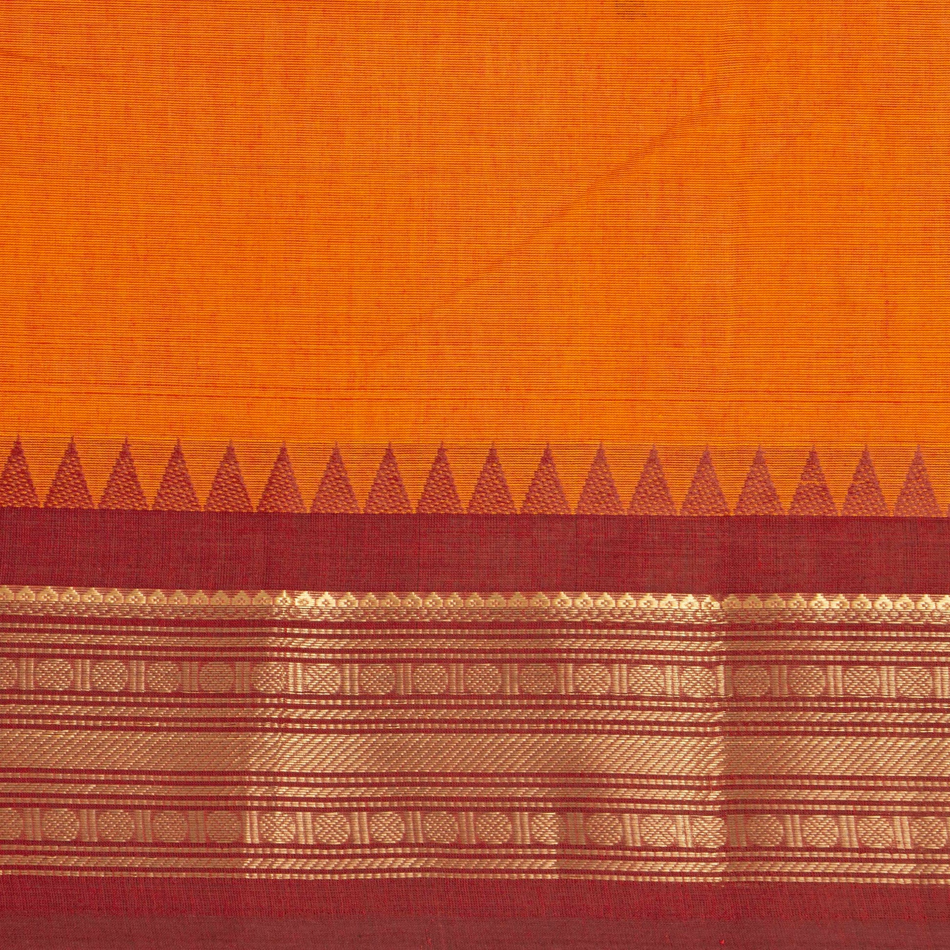 Orange kanchi cotton saree with a red border with gold zari work and attached blouse.