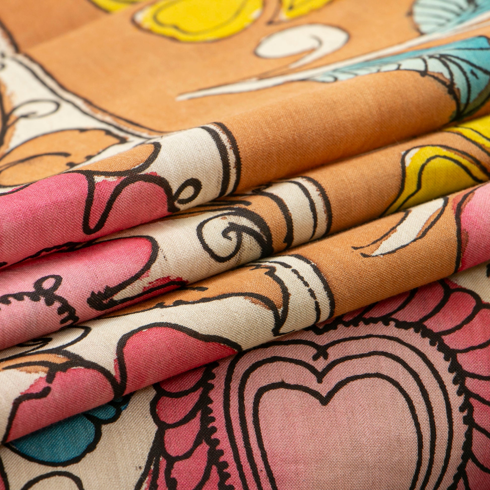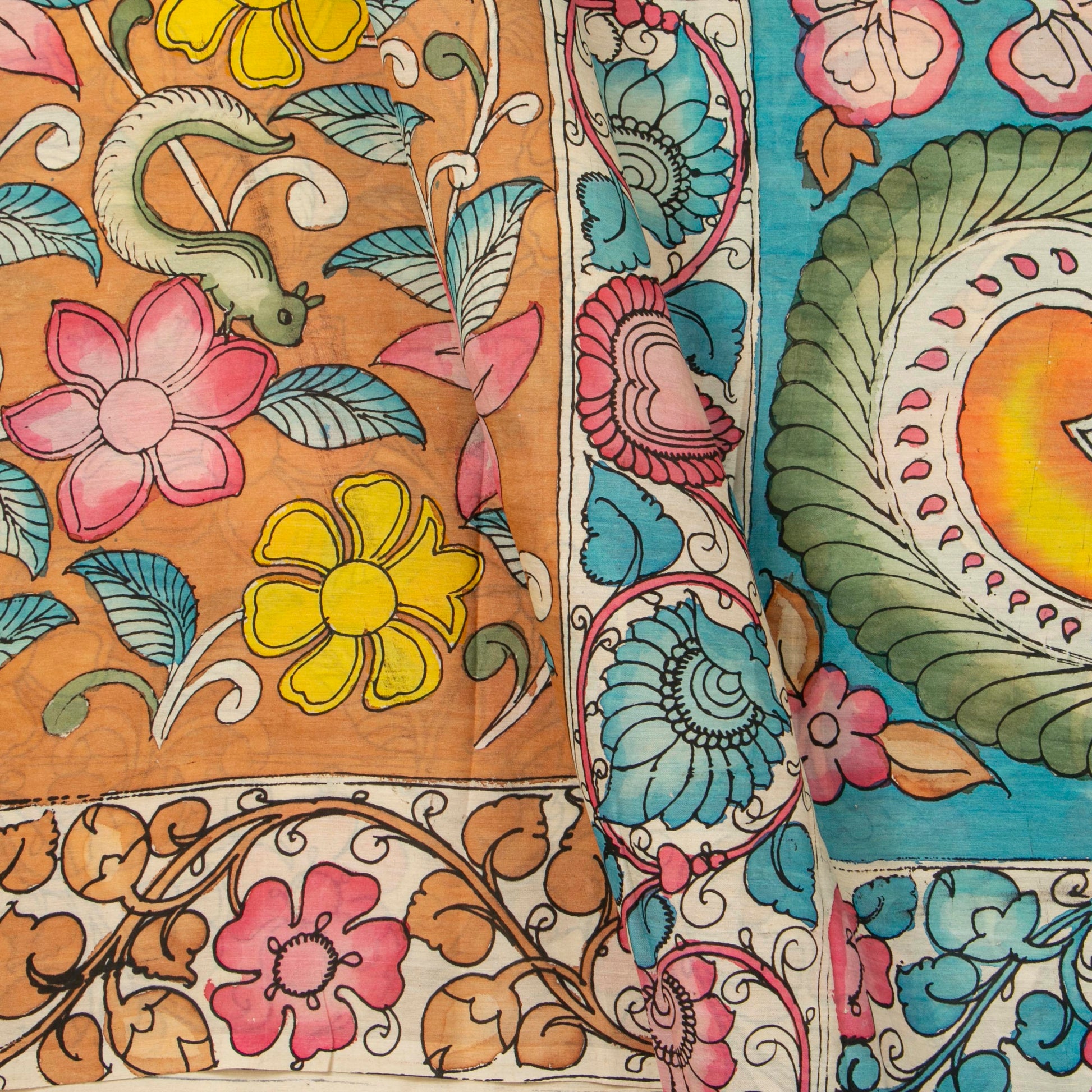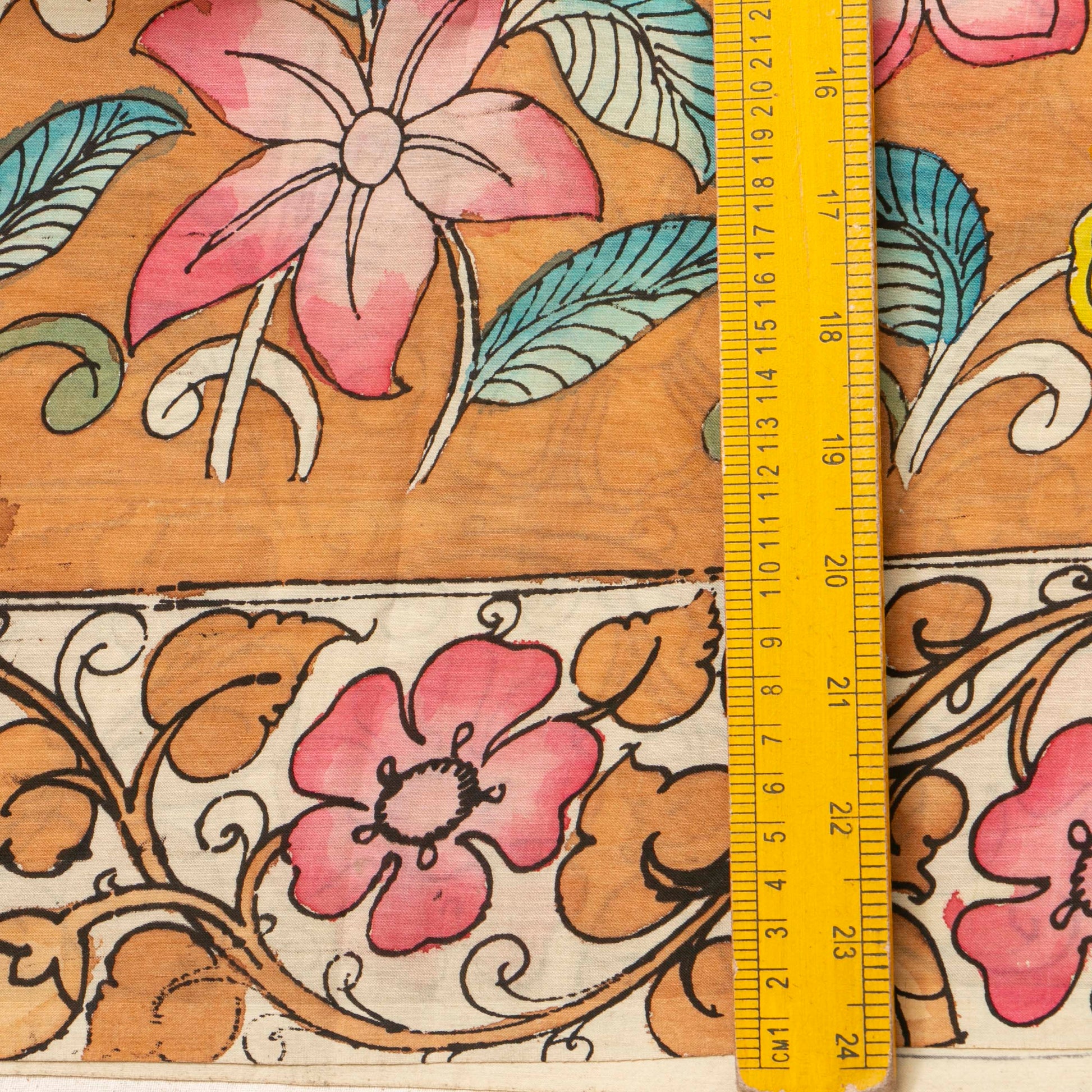 Orange handpainted kalamkari silk saree on bangalore silk handpainted with organic vegetable dyes with attached blouse