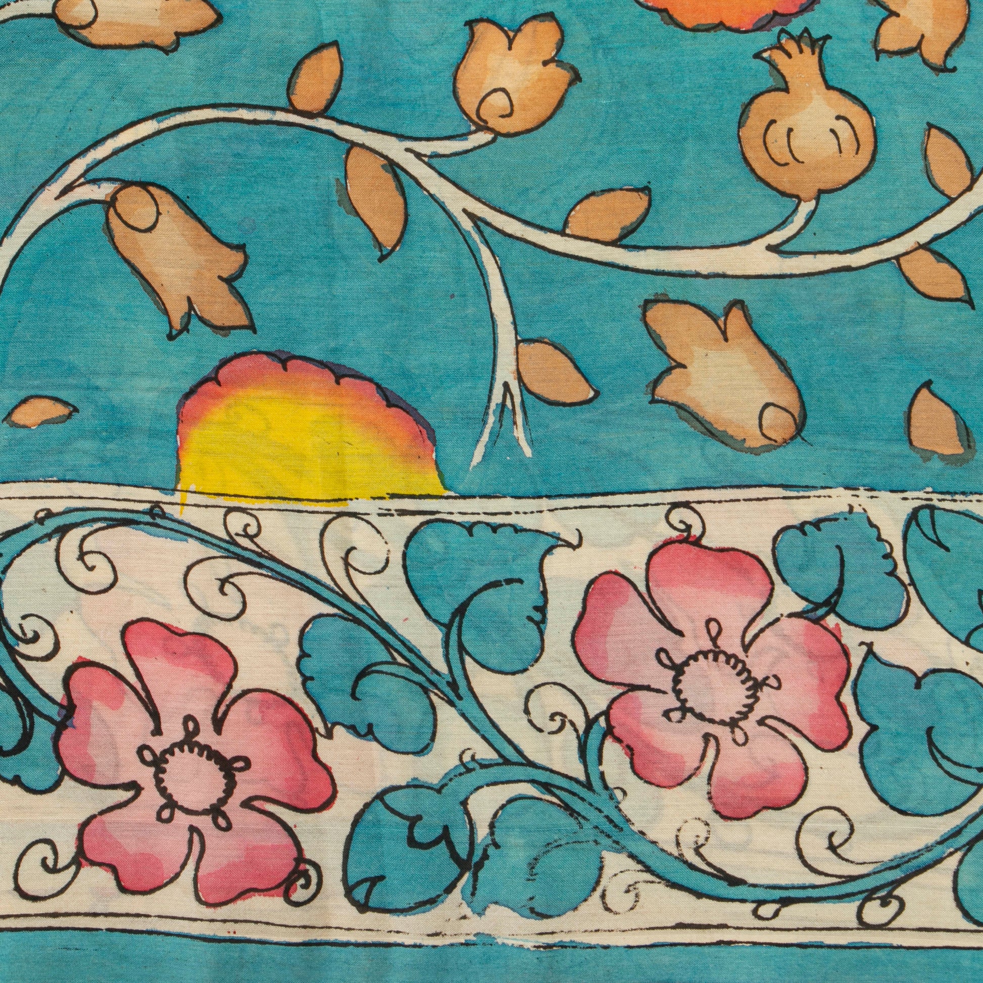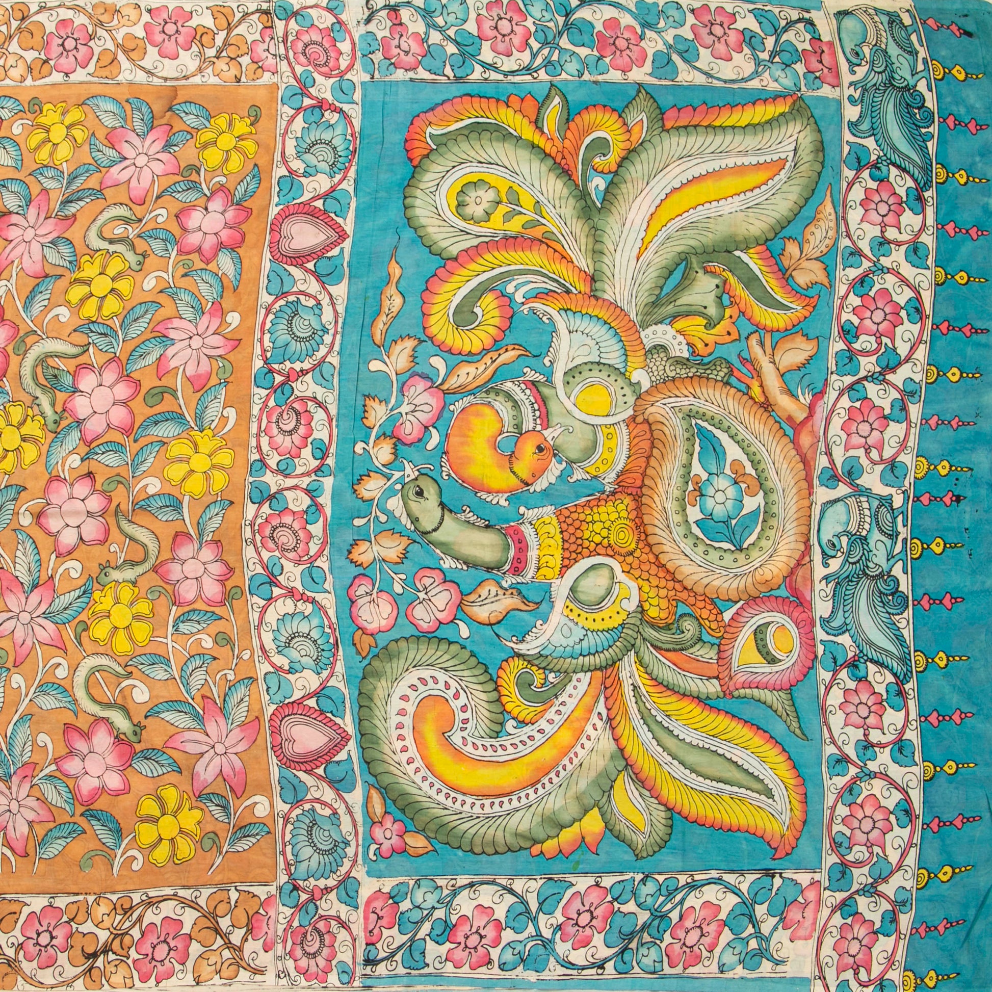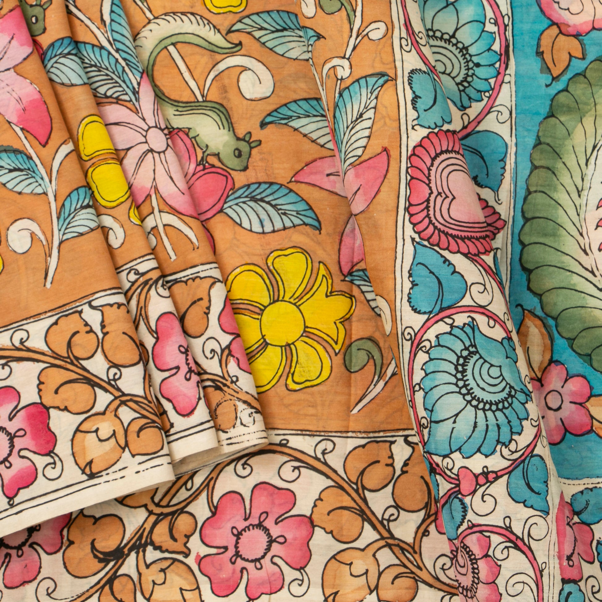 Orange handpainted kalamkari silk saree on bangalore silk handpainted with organic vegetable dyes with attached blouse