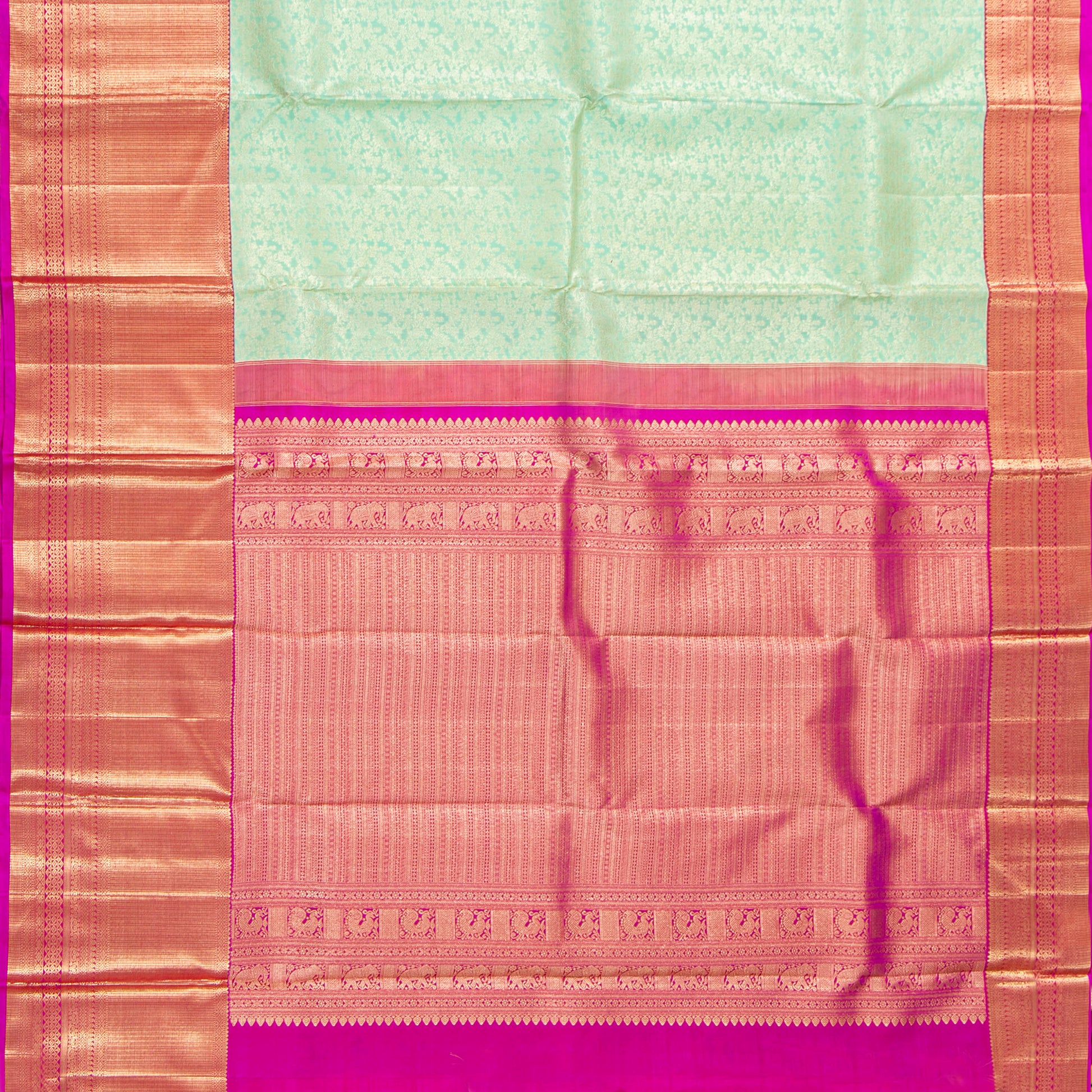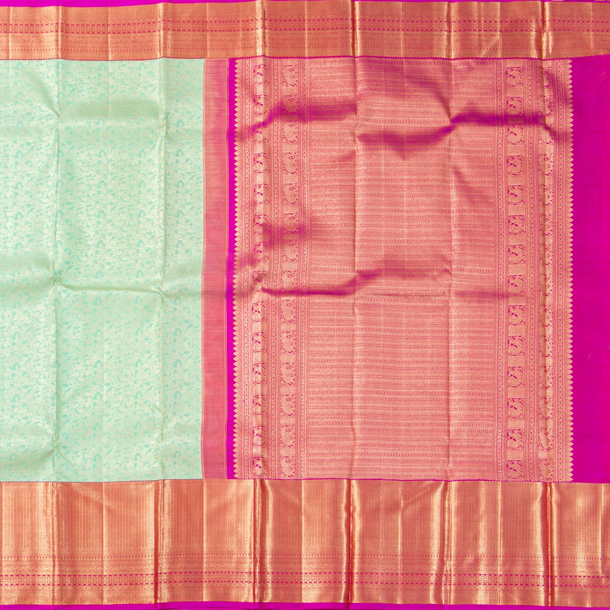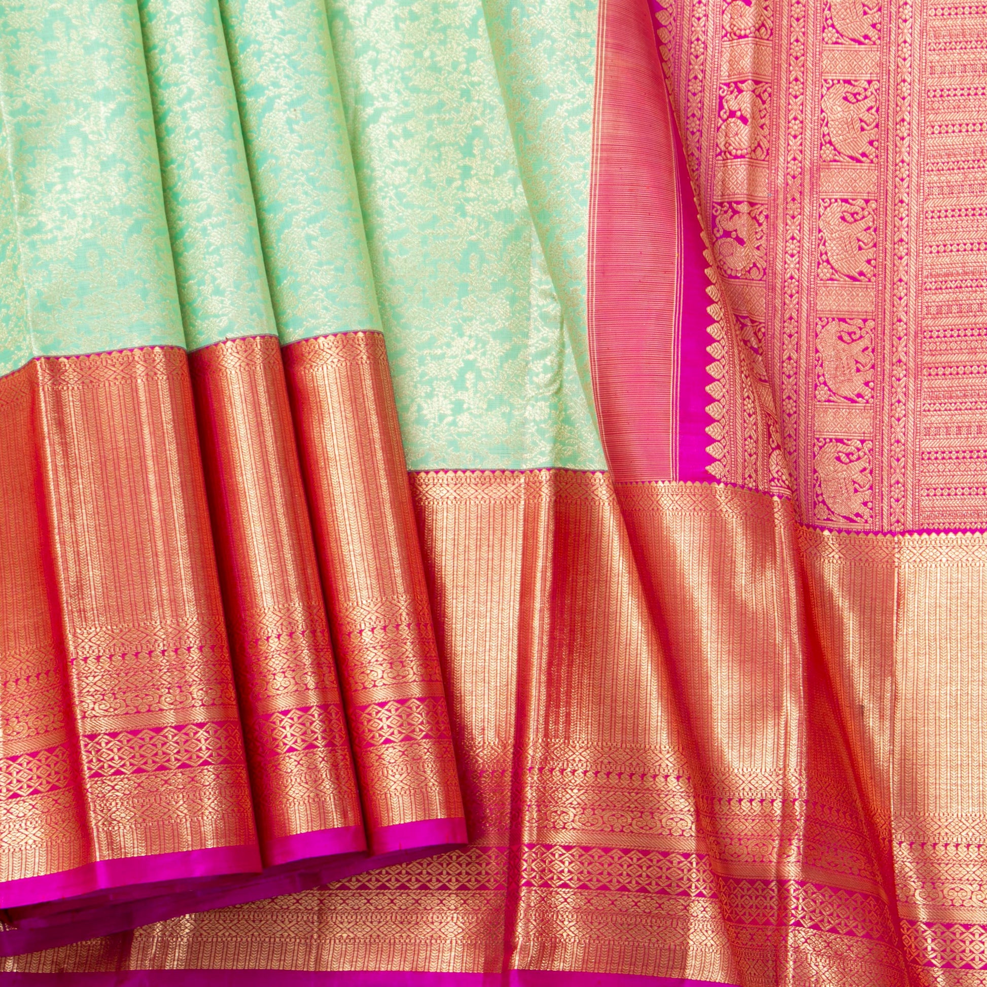 A pastel green. and pink kanchipuram silk saree handwoven in pure silk and pure zari. The body of the saree is in pastel green with floral designs all over in silver zari. The morning eveing korvai borders are in pink with zari stripe san geometric patterns in gold zari.The pink korvai pallu has rich gold zari work featuring elephants and annapakshi motifs in gold zari. The attachedf blouse in pink has a zari arm band matching the saree border for the blouse sleeve.