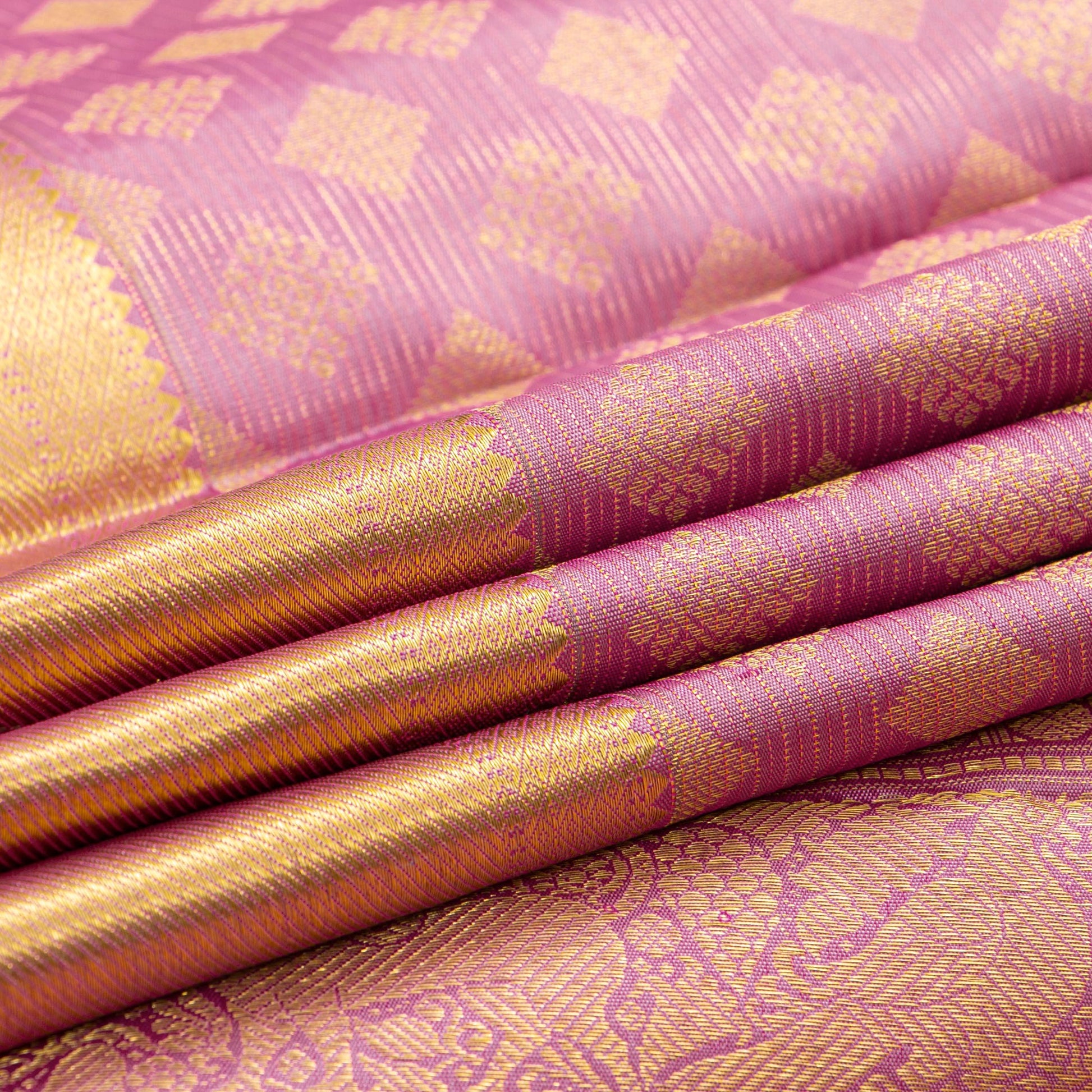 A pastel mauve kanchipuram silk saree handwoven in pure silk and pure zari . The body is in pastel pink with vaira oosi checks and diamond patterns in gold zari with a bavanchi border. The pallu has traditional patterns in gold zari. The attached blouse in pastel mauve has a zari band matching the saree border.