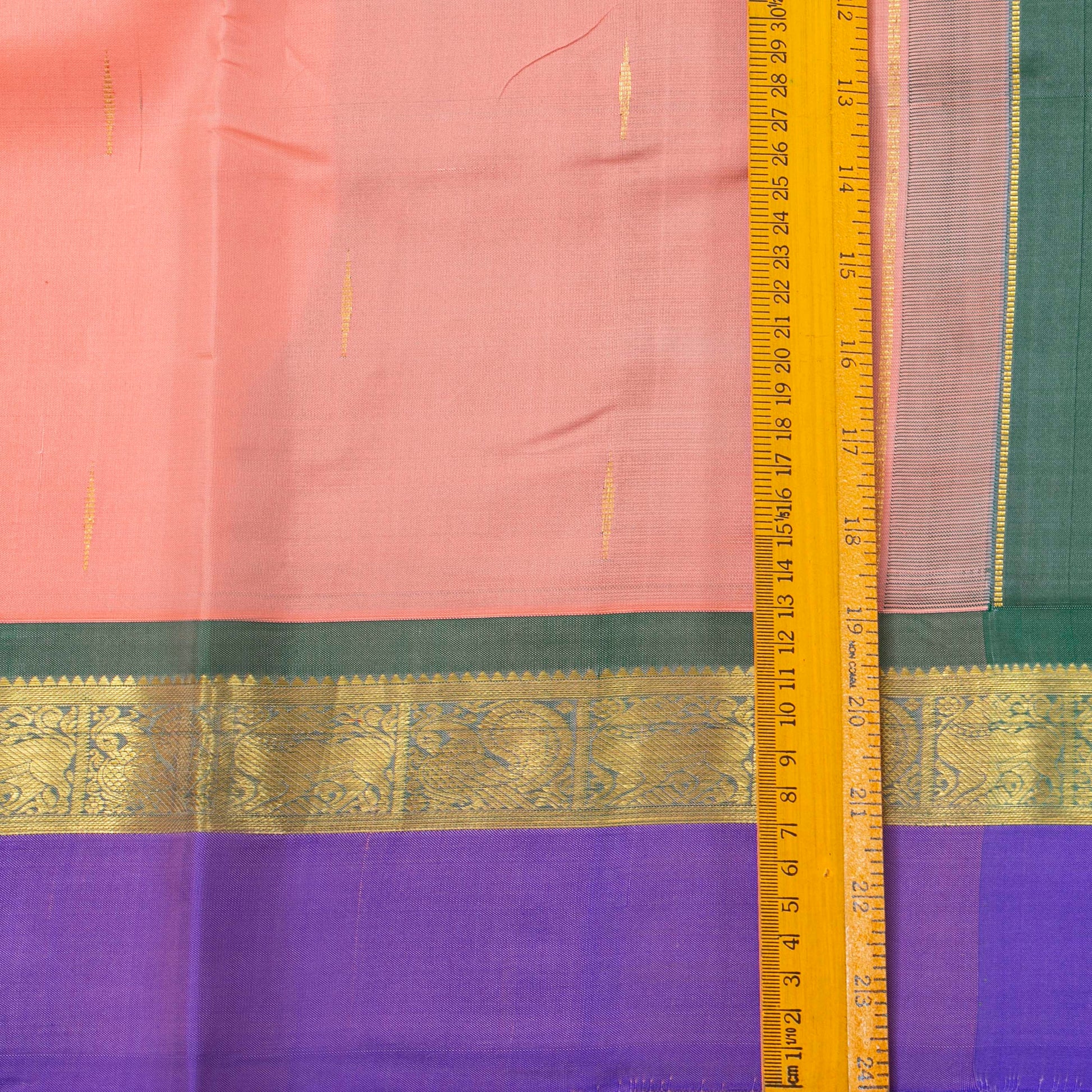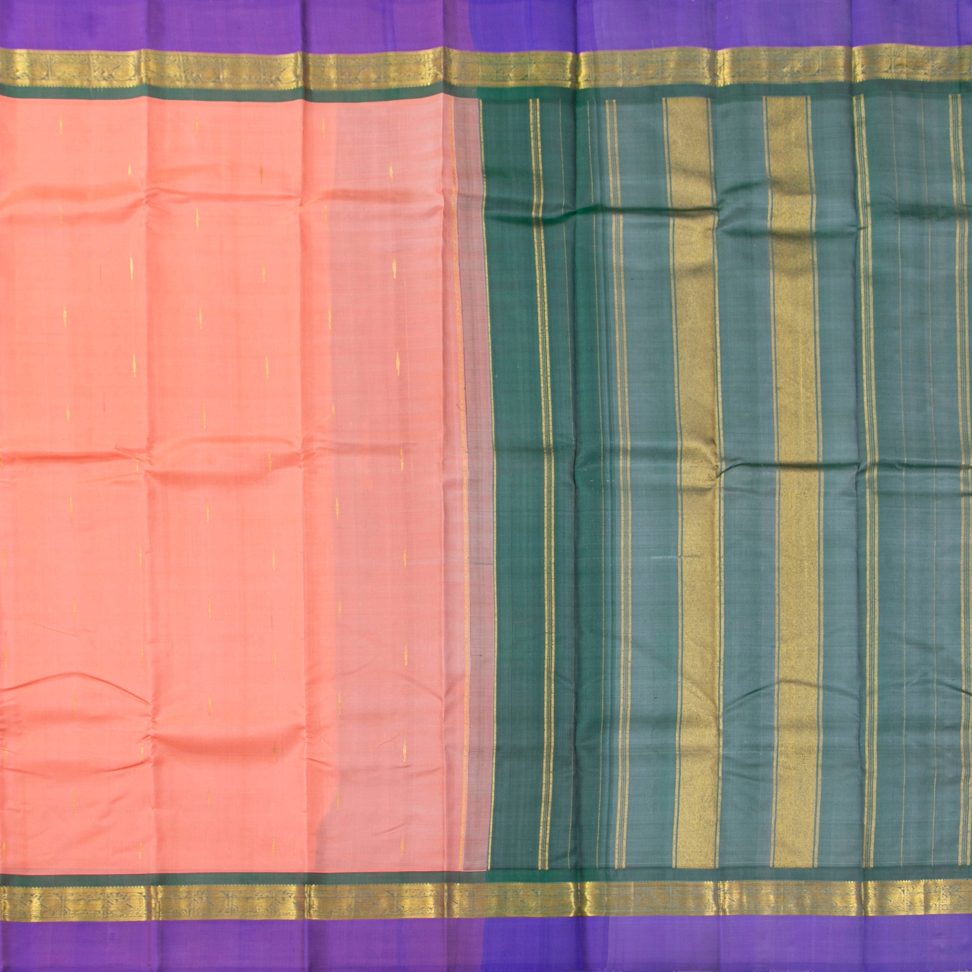 A pastel peach and lilac kanchipuram silk saree handwoven in pure silk and pure zari. The body is in pastel peach with malli moggu motifs in gold zari all over. The borders are in lilac with a band of gold zari annapakshi motifs with an inner band of jade green. THe pallu. isin jade green with traditional gold zari rekku and the attached bluse is in jade green with a lilac and zari band matching the border for the blouse sleeve.