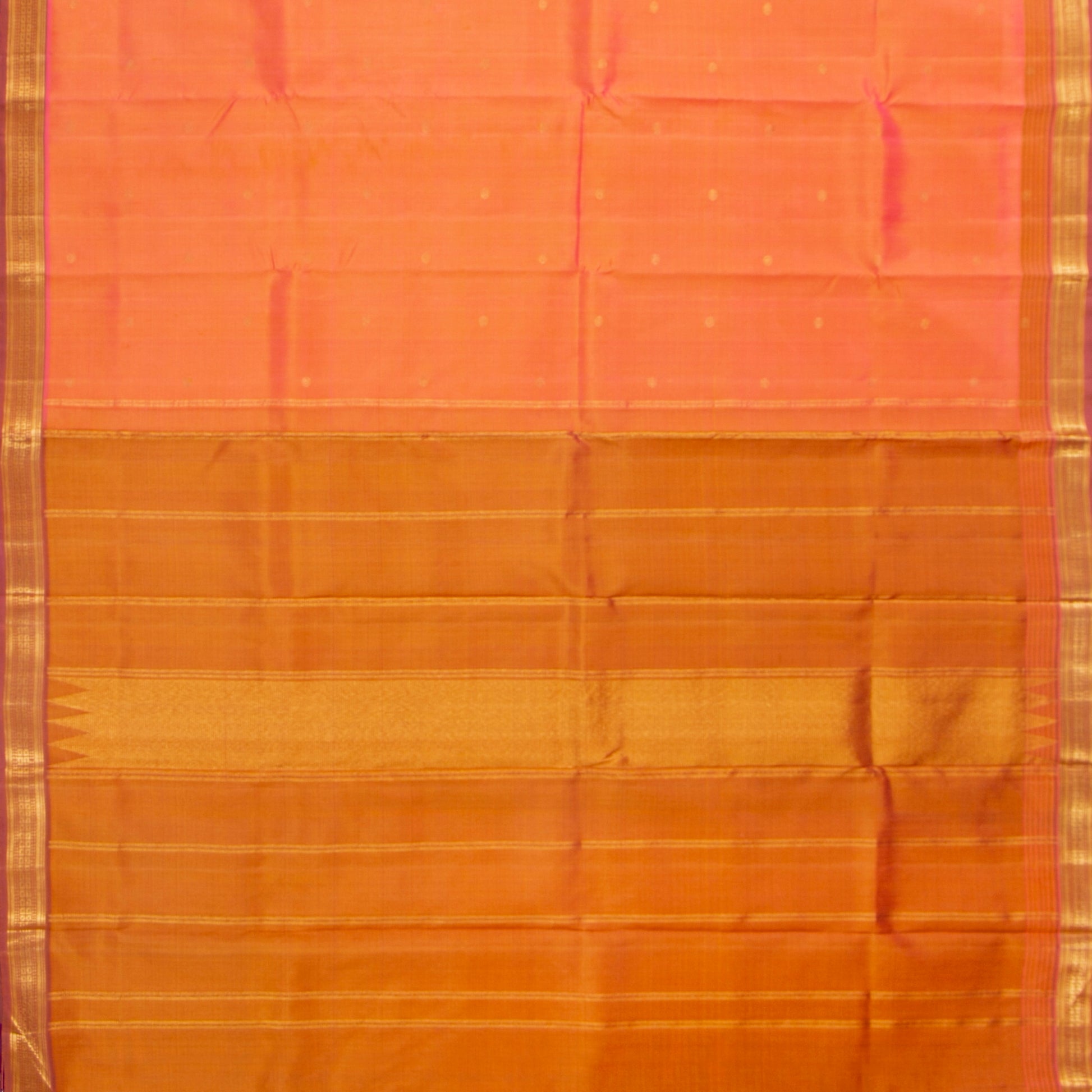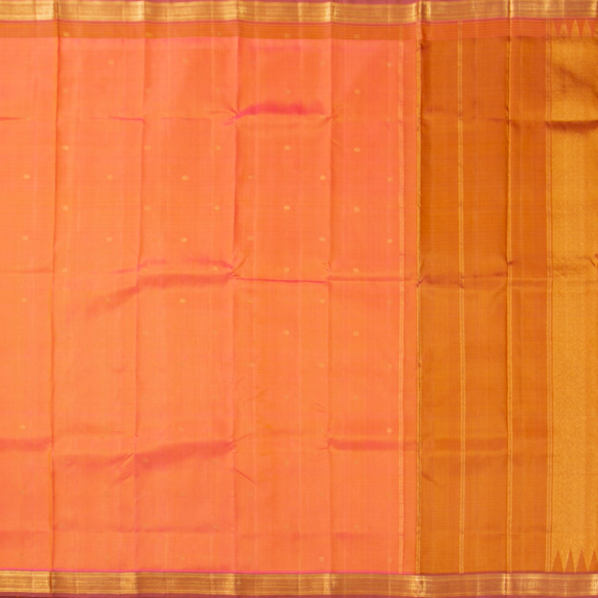 Pastel peach kanchipuram silk saree with a pink border with gold zari on both sides with an attached blouse.