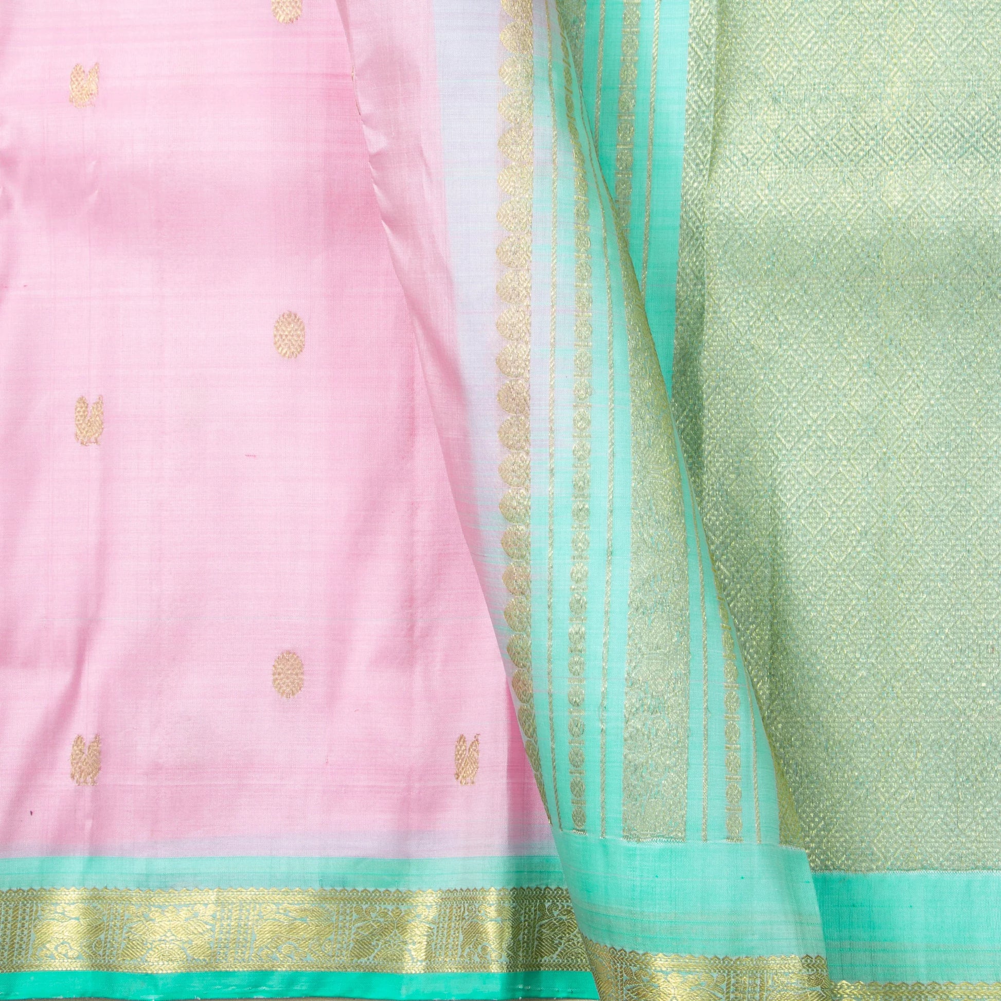 A pastel pink and green original kanchipuram silk saree handwoven in pure silk and pure zari. The body is in pastel pink with annam and chakram motifs in gold zari. The contrast green border has peacock and floral patterns in gold zari. The pallu has diamond patterns in gold zari. The attached blouse is in green with a zari armband matching the sari border.