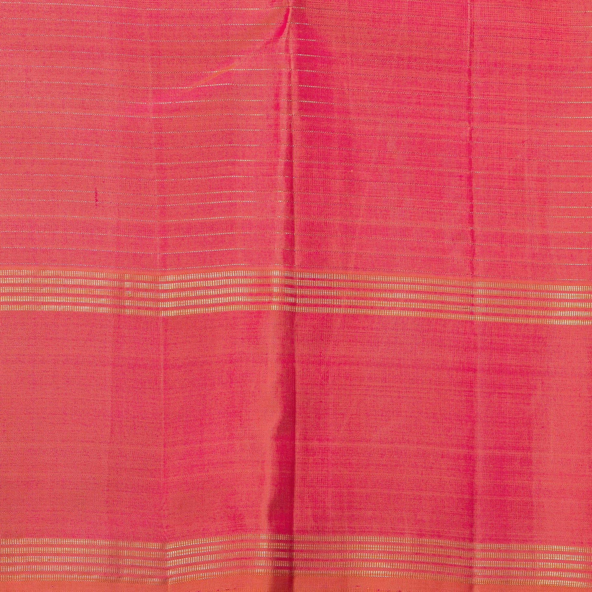 Handwoven kanchipuram siok saree in pure silk and pure zari wth a pastel pink body having zari checks and a peach border and pallu with gold zari work. The attached blouse in peach has a zari arm band for the sleeve.