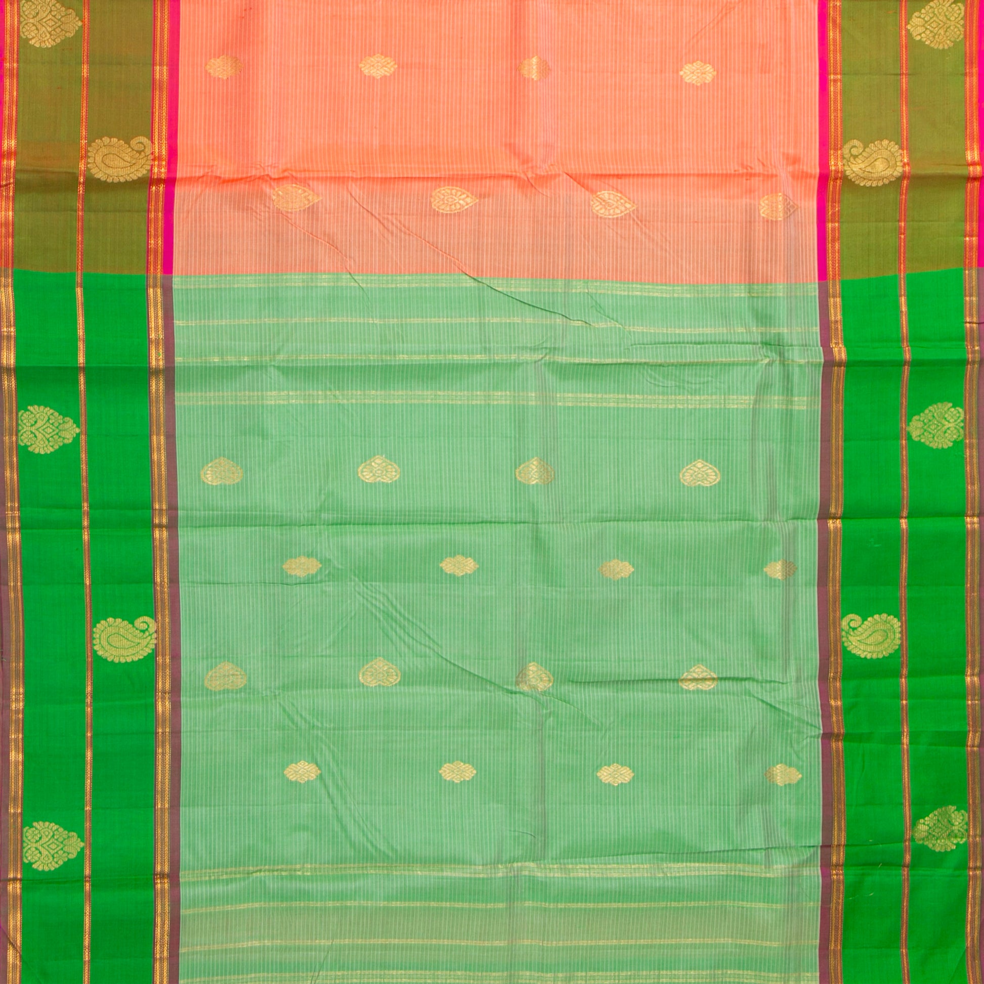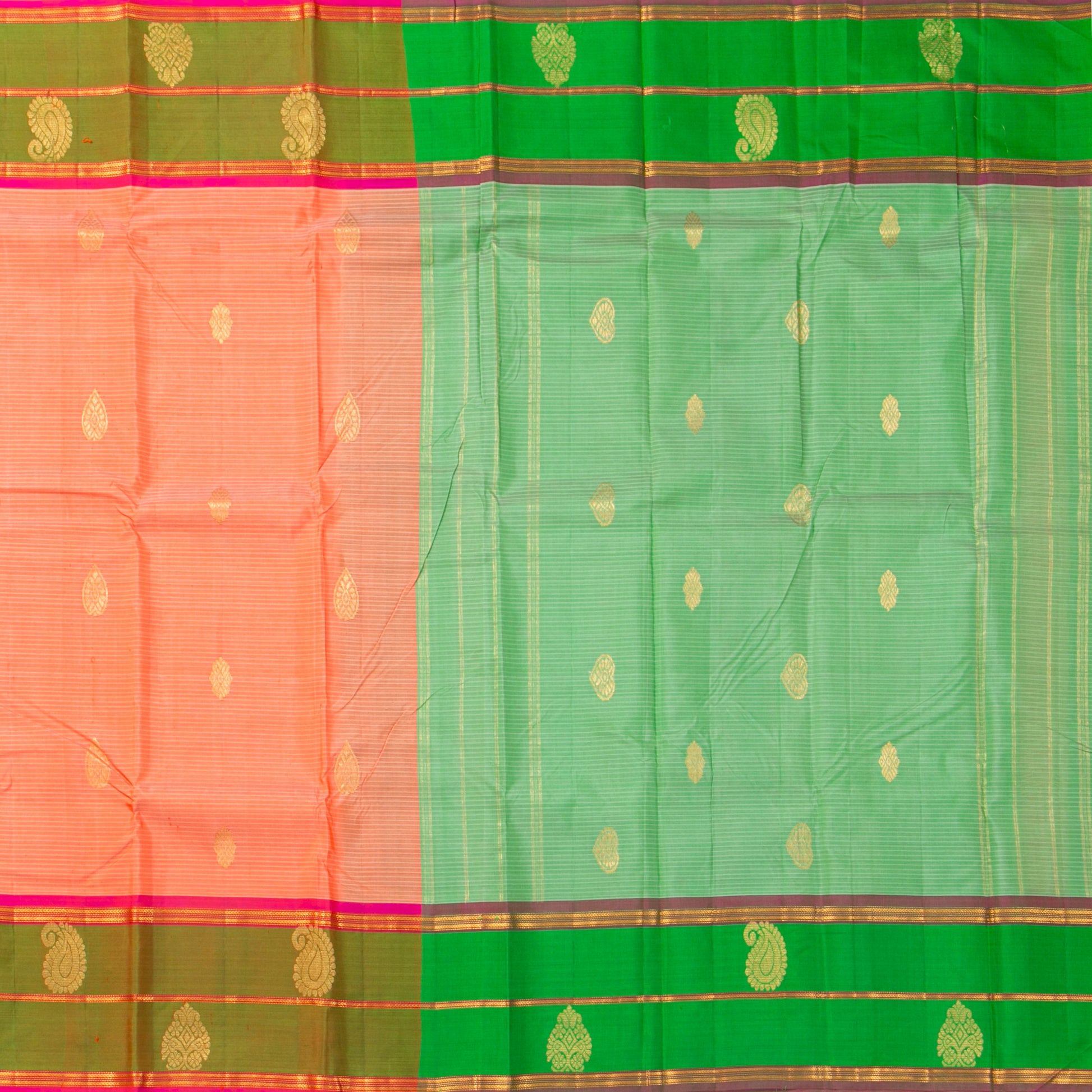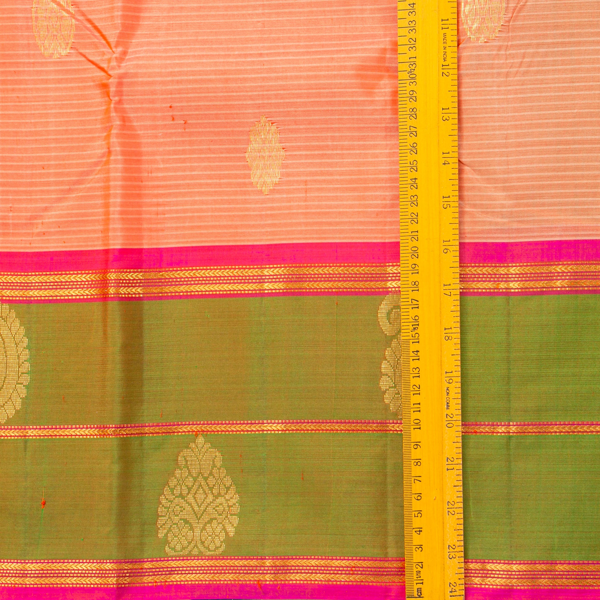 A peach and green kanchipuram silk saree handwoven in pure silk and pure zari. The body.is in peach with self stripes and floral motifs in gold zari.with self stripes and a green border with paisley motifs in gold zari. The green pallu has floral motifs in gold zari and the blouse has a arm band design to match the border.