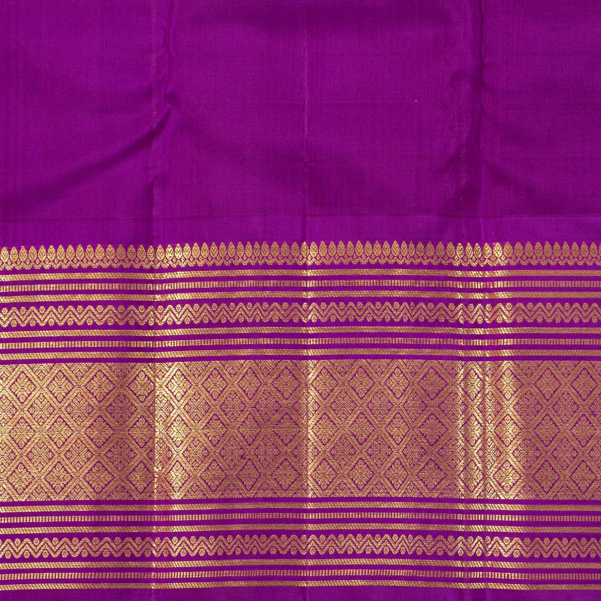 A handwoven kanchipuram silk saree in pure 4 ply mulberry silk on both weft and warp with pure zari. The body is in peach with muthu kattam vari checks in gold zari enclosing kamalam and kolam motifs in gold zari. The contrast borders are in purple with traditional diamond designs in gold zari and the pallu in purple has rich gold zari with a central column of chevron patterns flanked by columns of diamond designs in gold zari. The attached blouse in purple has a zari arm band for the sleeve matching the saree border.