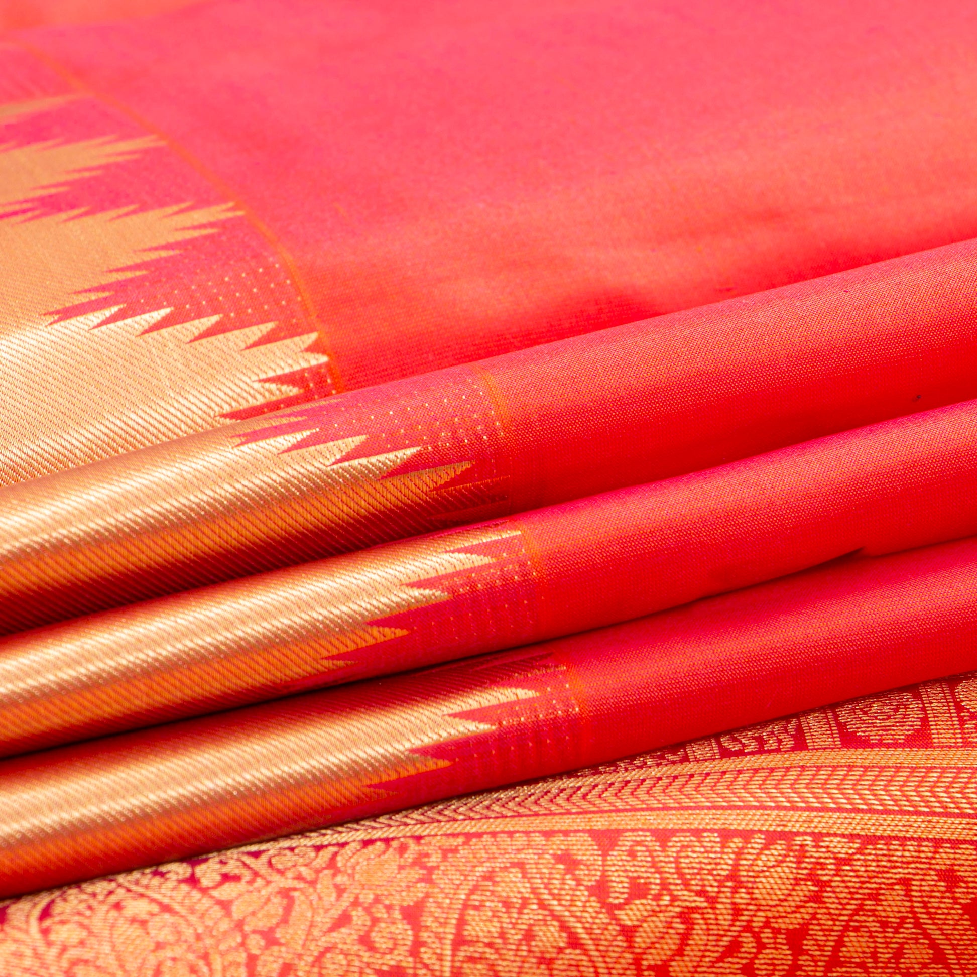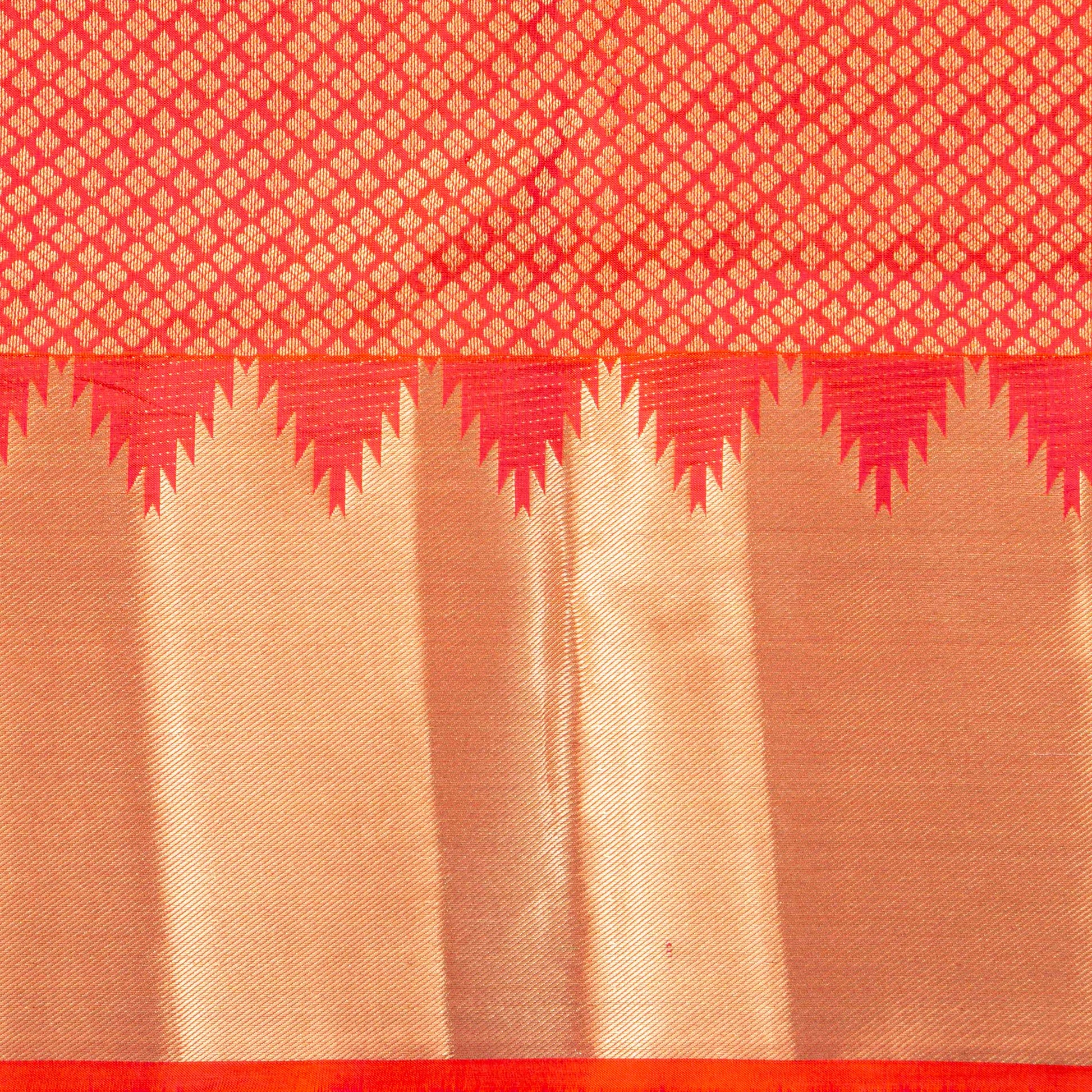 Light weight kanchipuram silk saree handwoven in pure silk. The body is in orange with temple border in the bottom and banarasi pattern at the top of the saree. The pallu has floral and diamond patterns in gold zari. The attached blouse is in orange with armband matching the saree border.