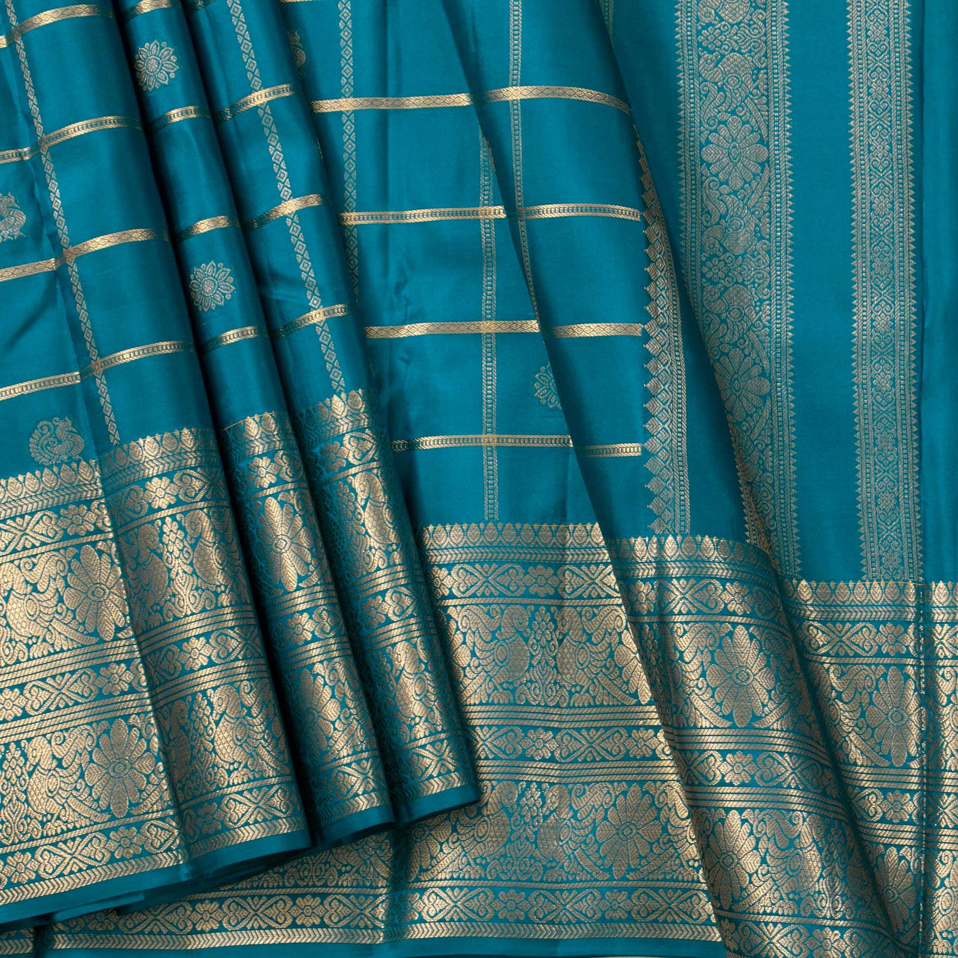 Peacock blue kanchipuram silk saree handwoven in pure silk. The body is in peacock blue with checks, annam and chakram in gold zari. The border has peacock pettu in gold zari. The pallu has floral bands in gold zari. The attached blouse is in blue with an armband matching the saree border.