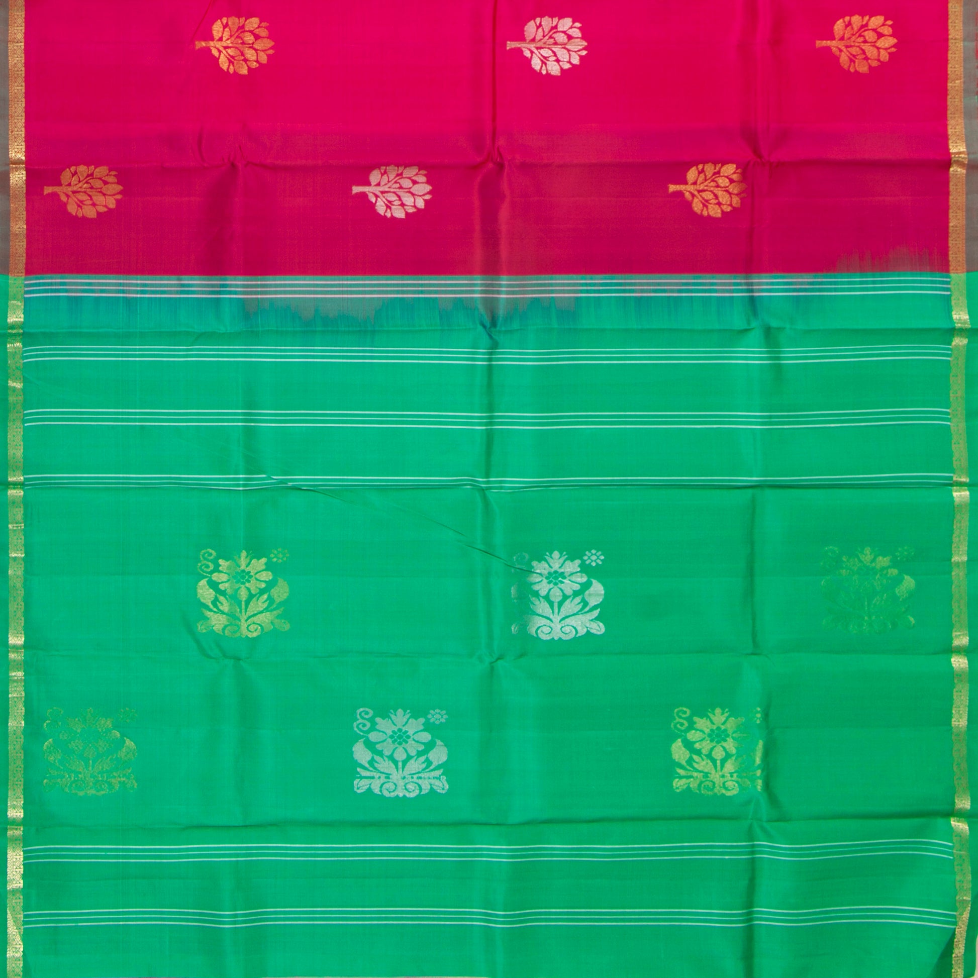 A pink and green kanchipuram silk saree handwoven in pure silk and pure zari. The saree body is in pink with gold and silver zari floral motifs and the pallu is in green with a green attached blouse.