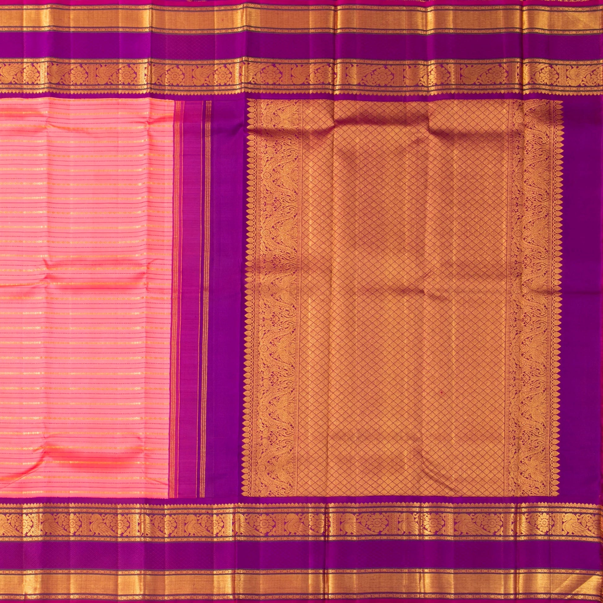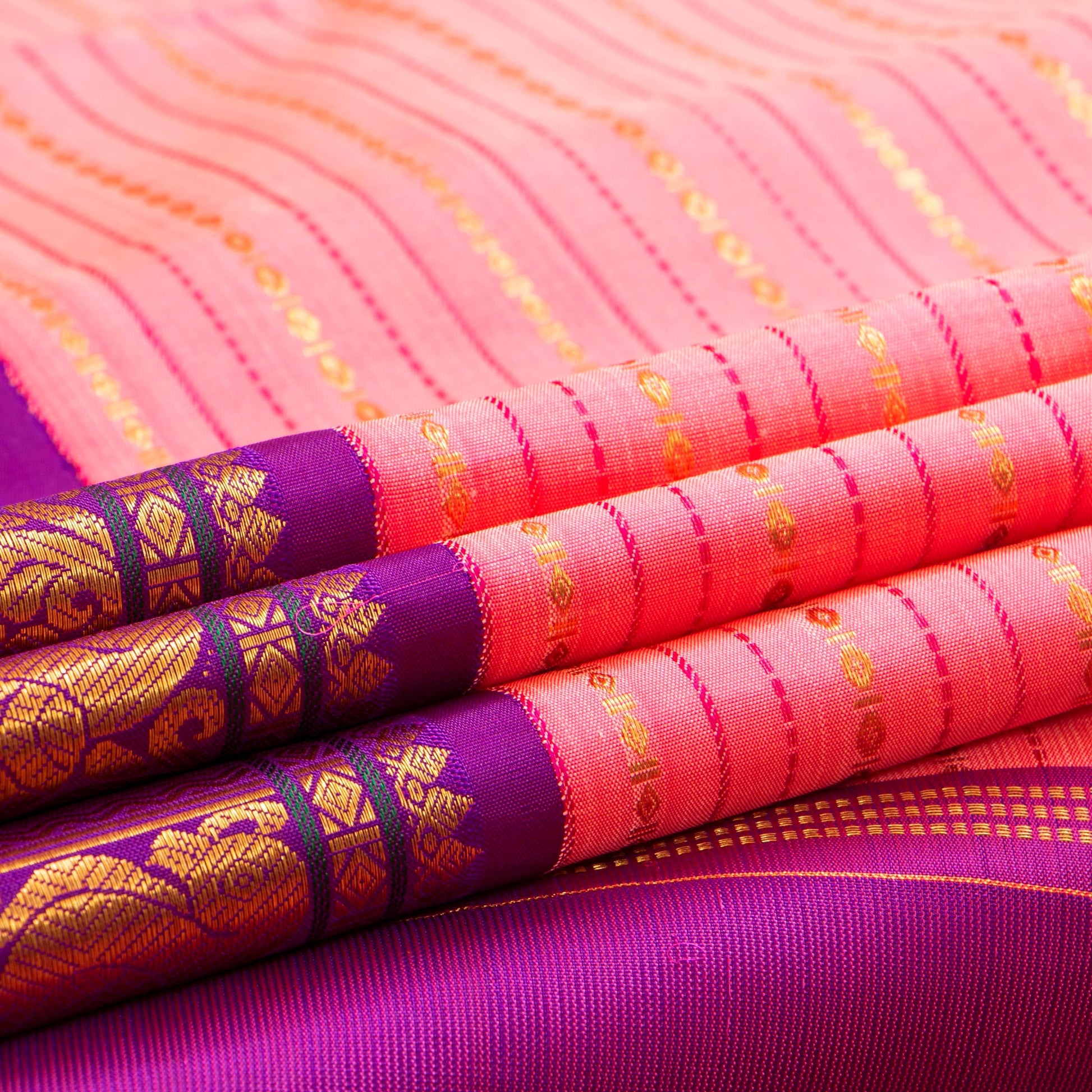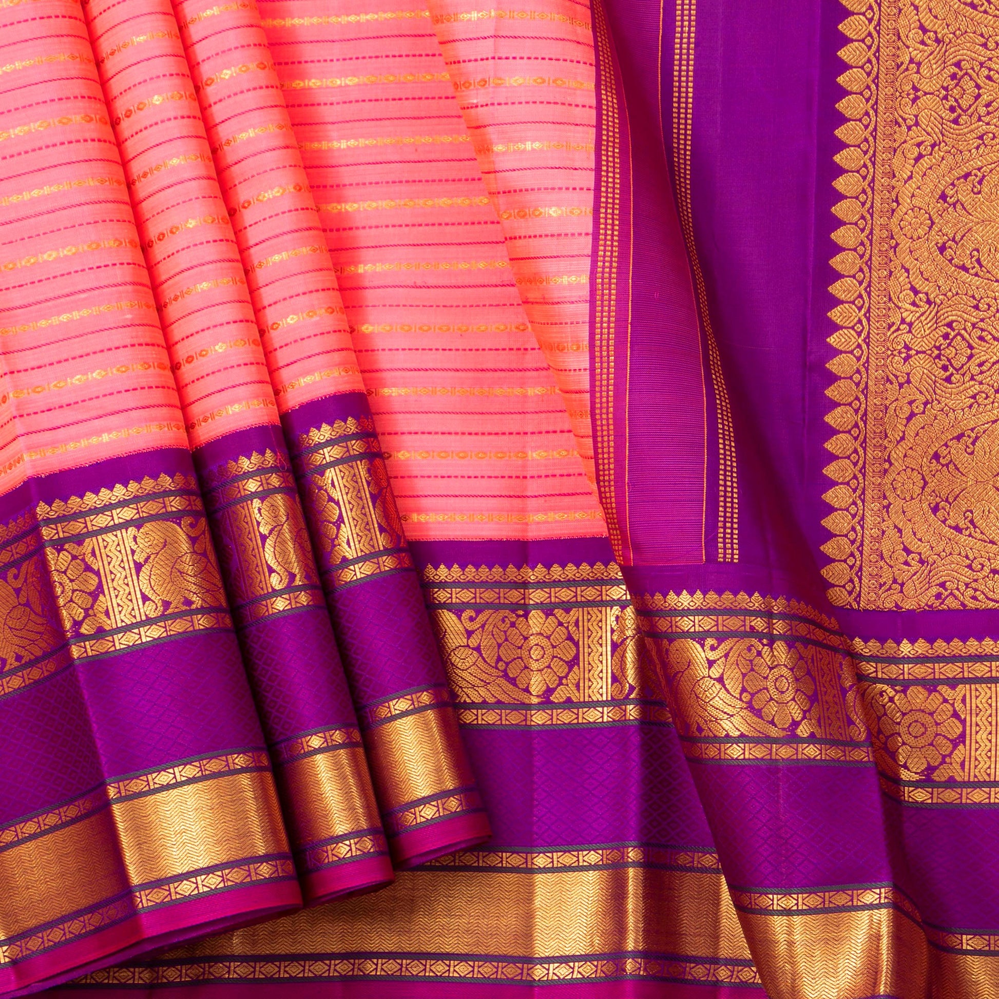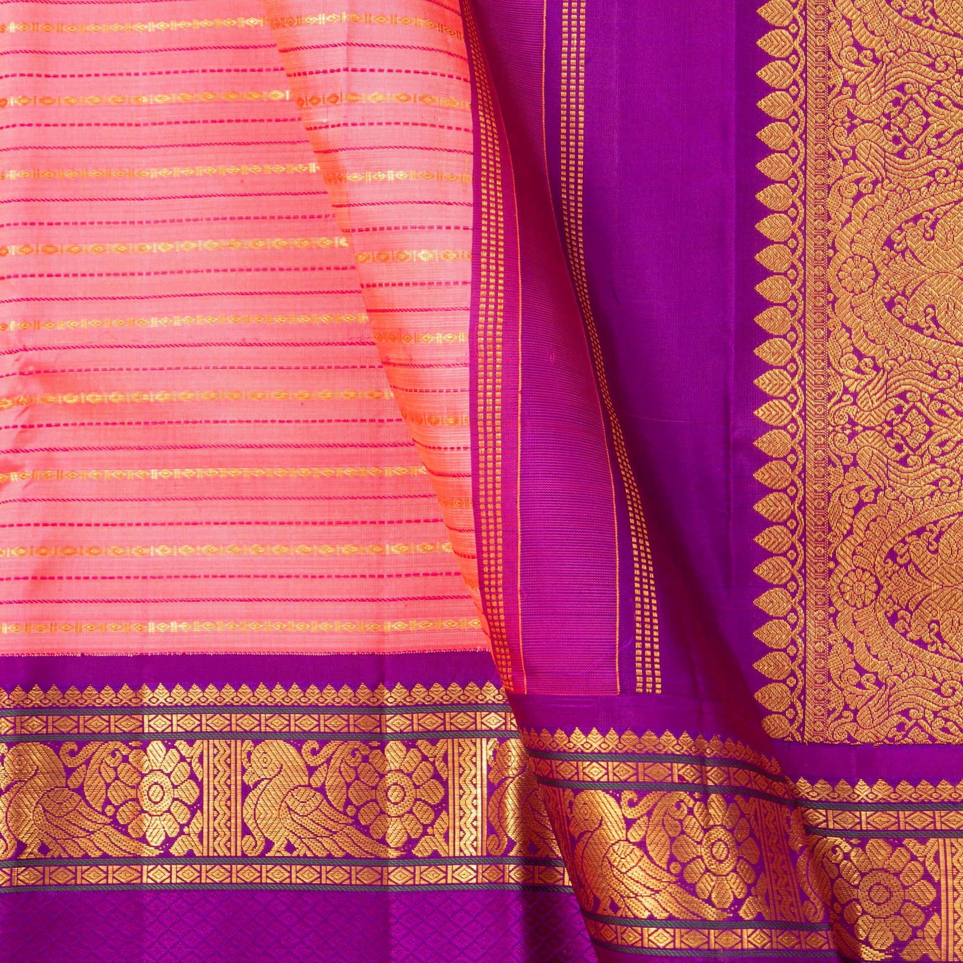 A pink and magenta kanchipuram silk saree handwoven in pure silk and pure zari for bridal wedding wear. The body is in pink with veldhari stripes in gold zari and muthu stripes in magenta silk thread. The korvai magenta border has floral, peacock and banarasi patterns in gold zari. The magenta pallu has peacock and diamond patterns in gold zari. The attached blouse in magenta has an arm band matching the saree border.