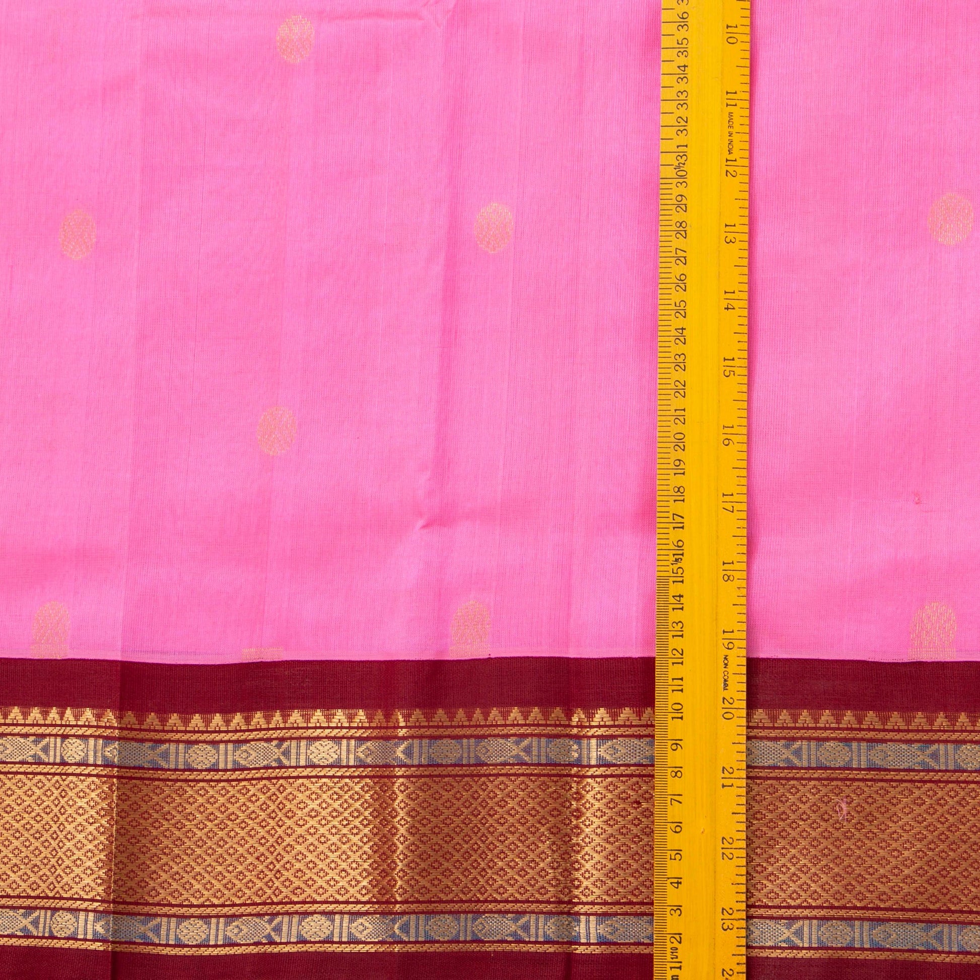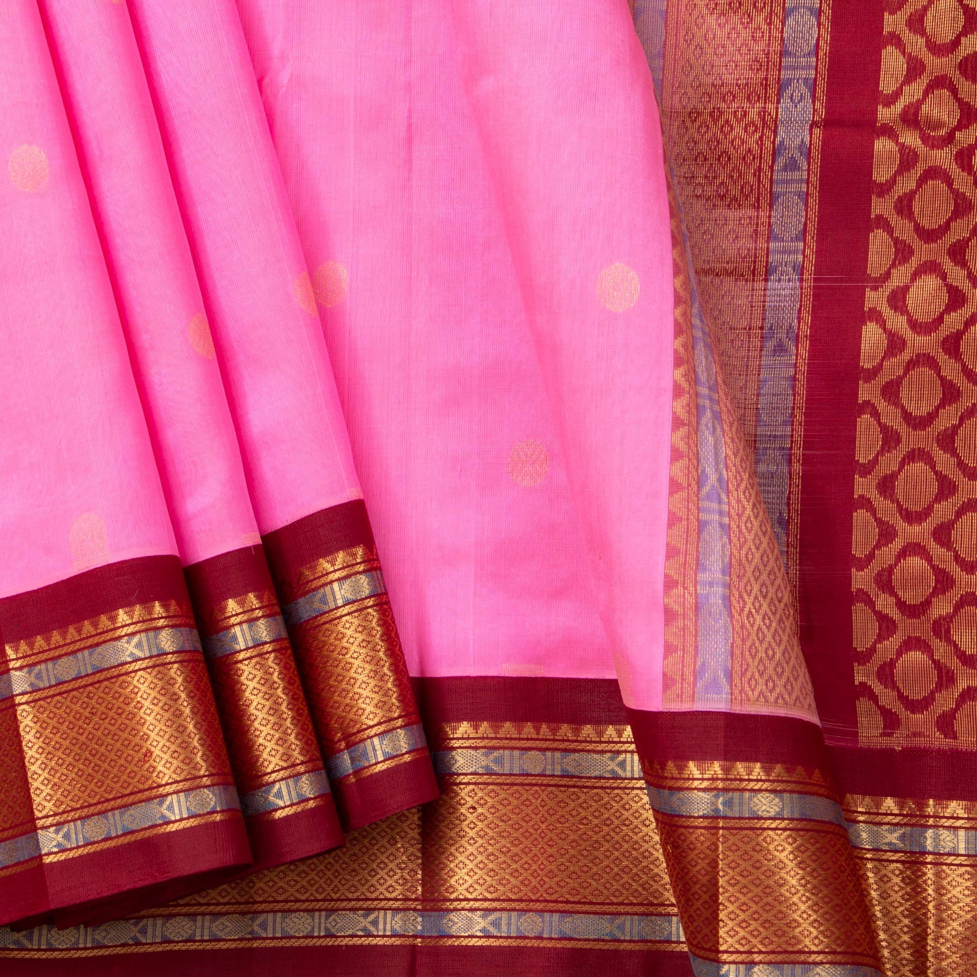 Pink and maroon kanchi silk cotton sari with a pink body having rudraksha motifs in gold zari all over. The maroon korvai borders have rich gold zari work with maiyil kan motifs in gold zari. The pallu in maroon has bands of arai maadam and paisleys in gold zari. The maroon blouse has a zari arm band matching the saree border.