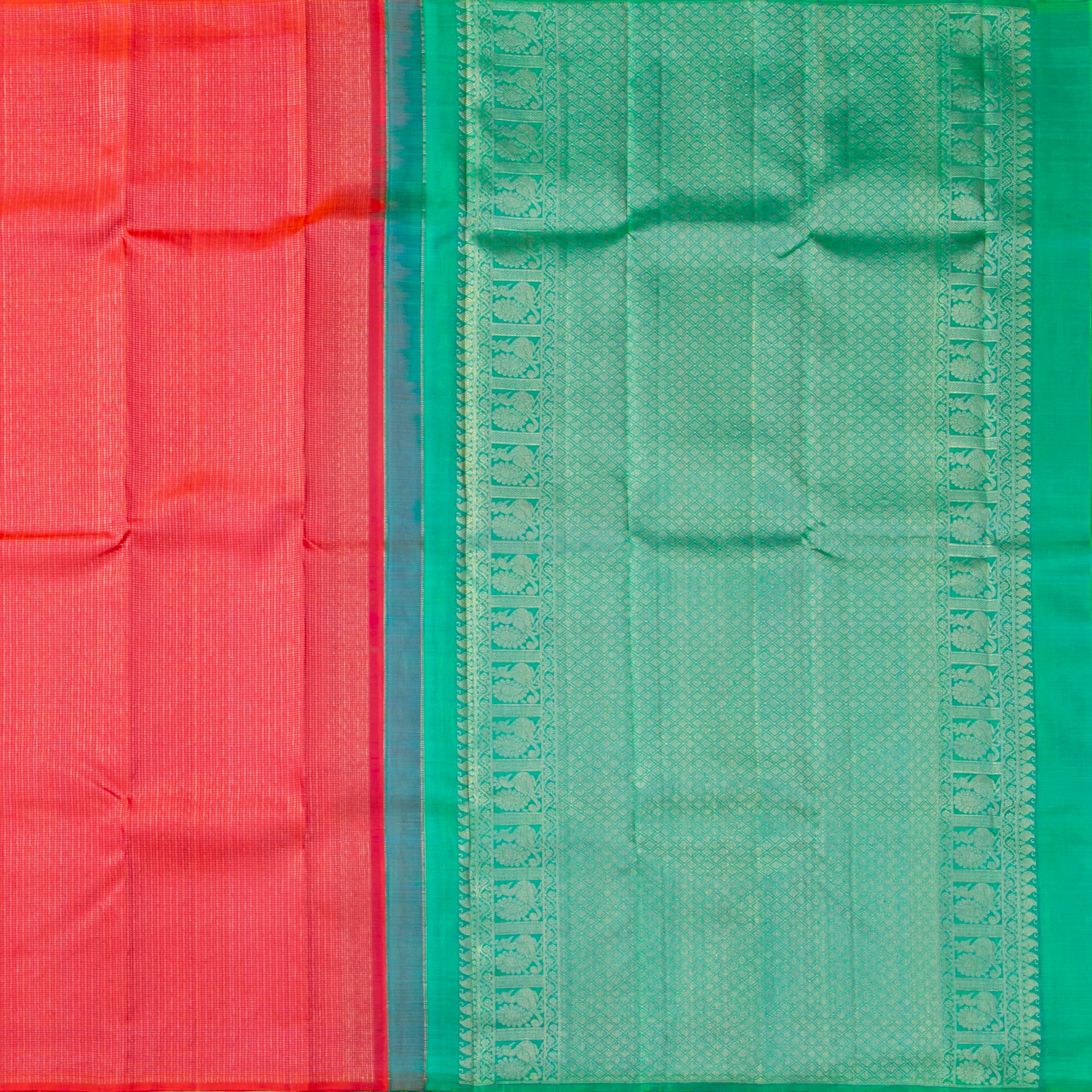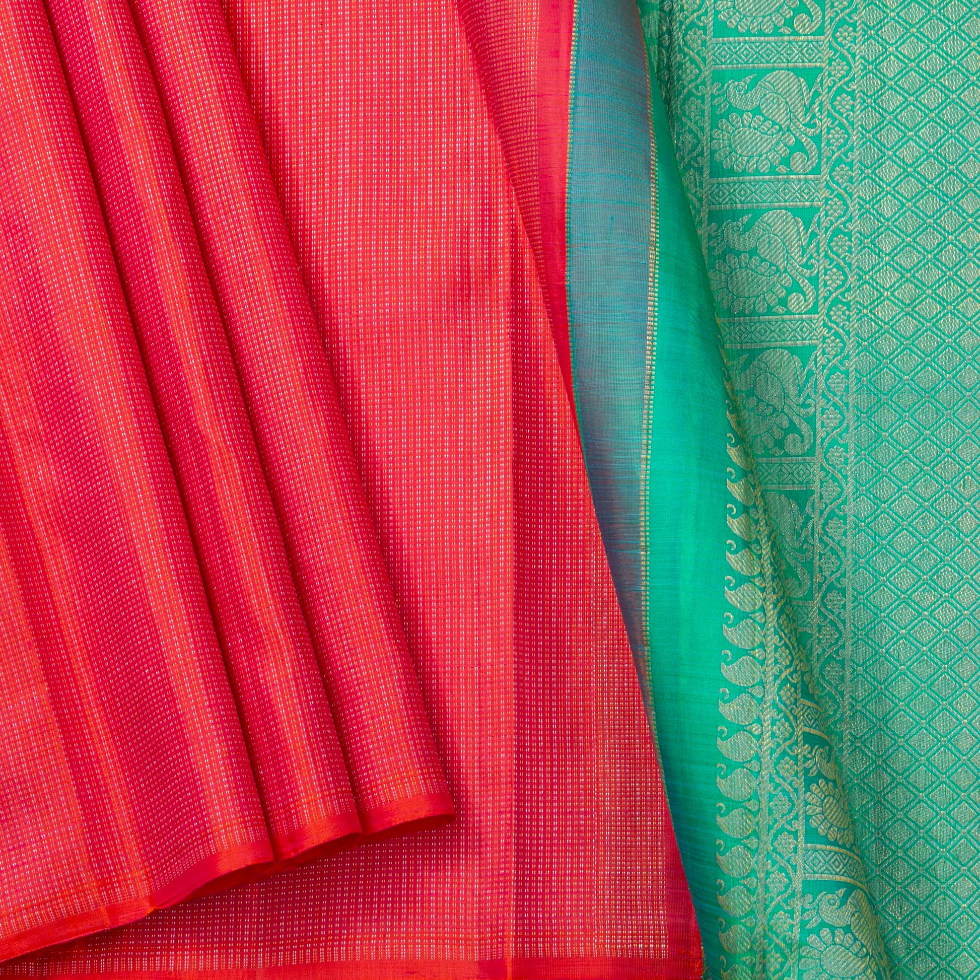 A pink kanchipuram silk saree handwoven in pure silk and pure zari. The body in pink has close stripes of muthu kattam vari in gold and silver zari alternating stipes without borders. The contrast pallu in turquoise green has rich gold zari work in traditional designs featuring annapakshi and floral motifs.
