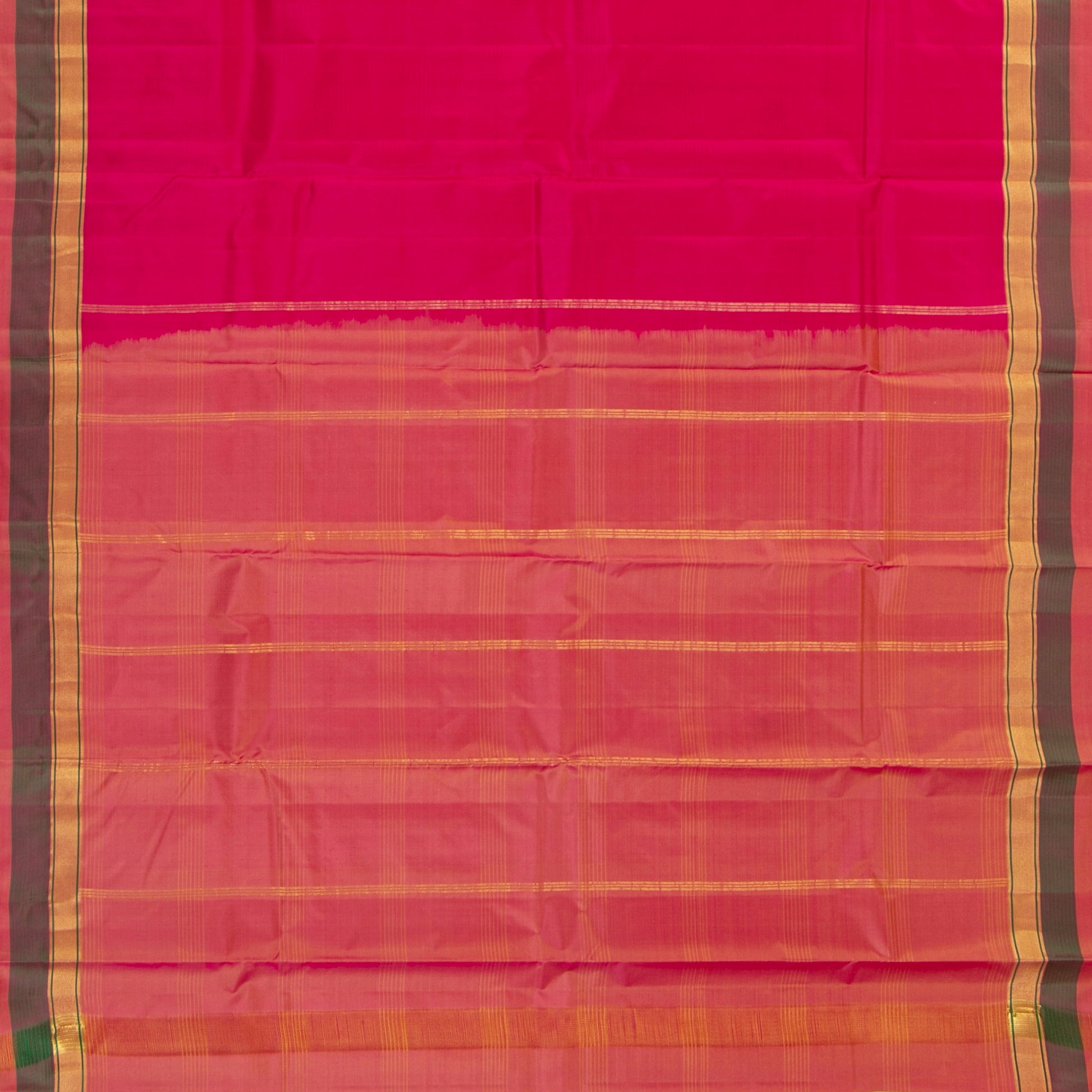 Light weight kanchipuram silk saree handwoven in pure silk. The body is in pink with gold zari, green and peach bands in the border. The peach pallu has stripes in gold zari. The attached blouse is in peach with armband matching the saree border.