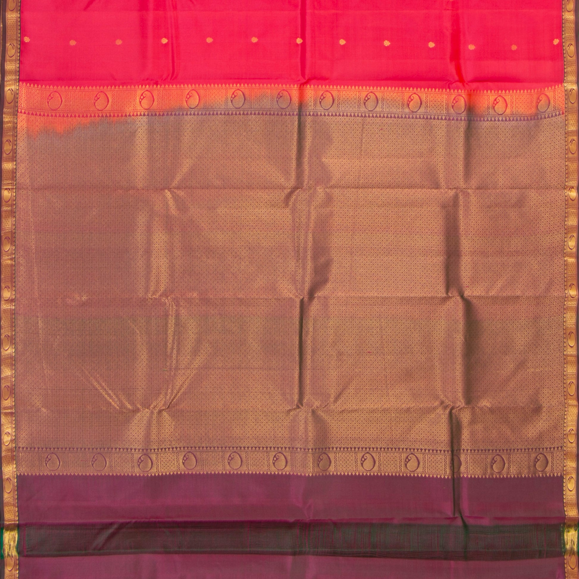 Pink kanchipuram silk saree handwoven in pure silk. The body is in pink with floral motifs in gold zari. The green shot with pink border has paisley and chevron patterns in gold zari. The green shot with pink pallu has floral and diamond patterns in gold zari. The attached blouse is in green shot with pink with an armband matching the saree border.