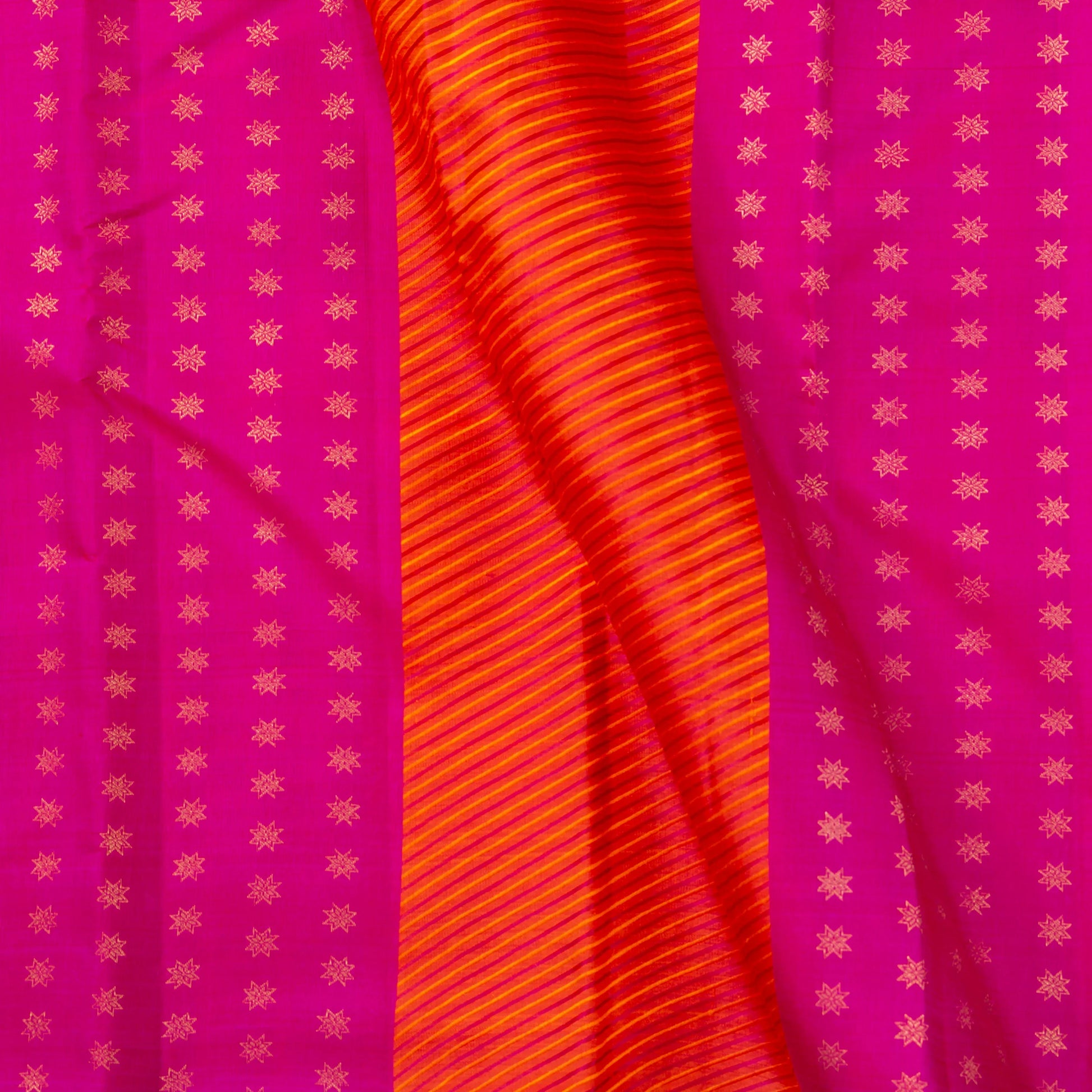 A pink, orange and mustard borderless kanchipuram silk saree handwoven in pure silk and pure zari for festive and wedding wear. The body is in panels of pink with kolam motifs in gold zari alternating with columns of mustard and orange in diagonal stripes. The pink pallu has kolam motifs in gold zari all over and the attached blouse is in pink with kolam motifs matching the pallu.