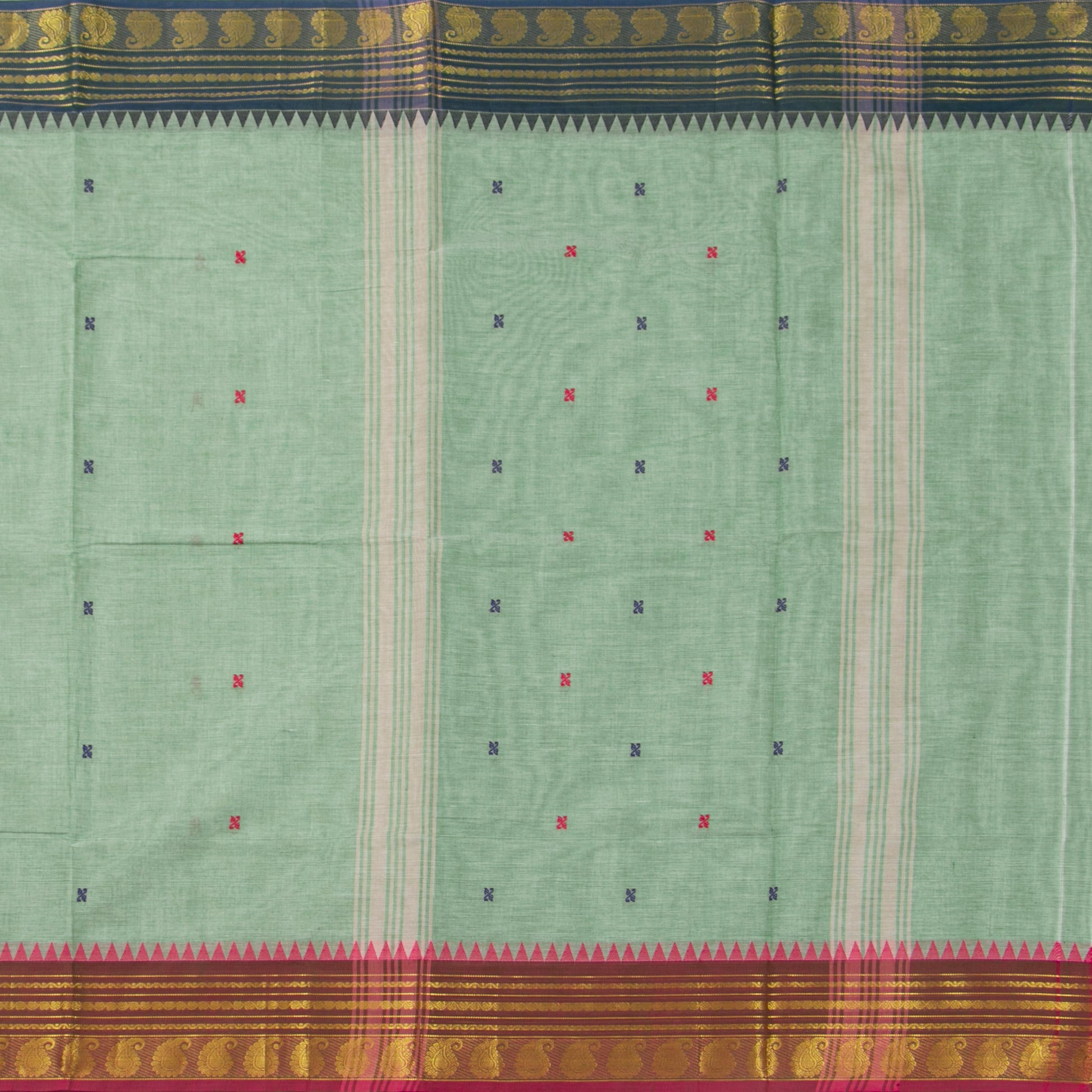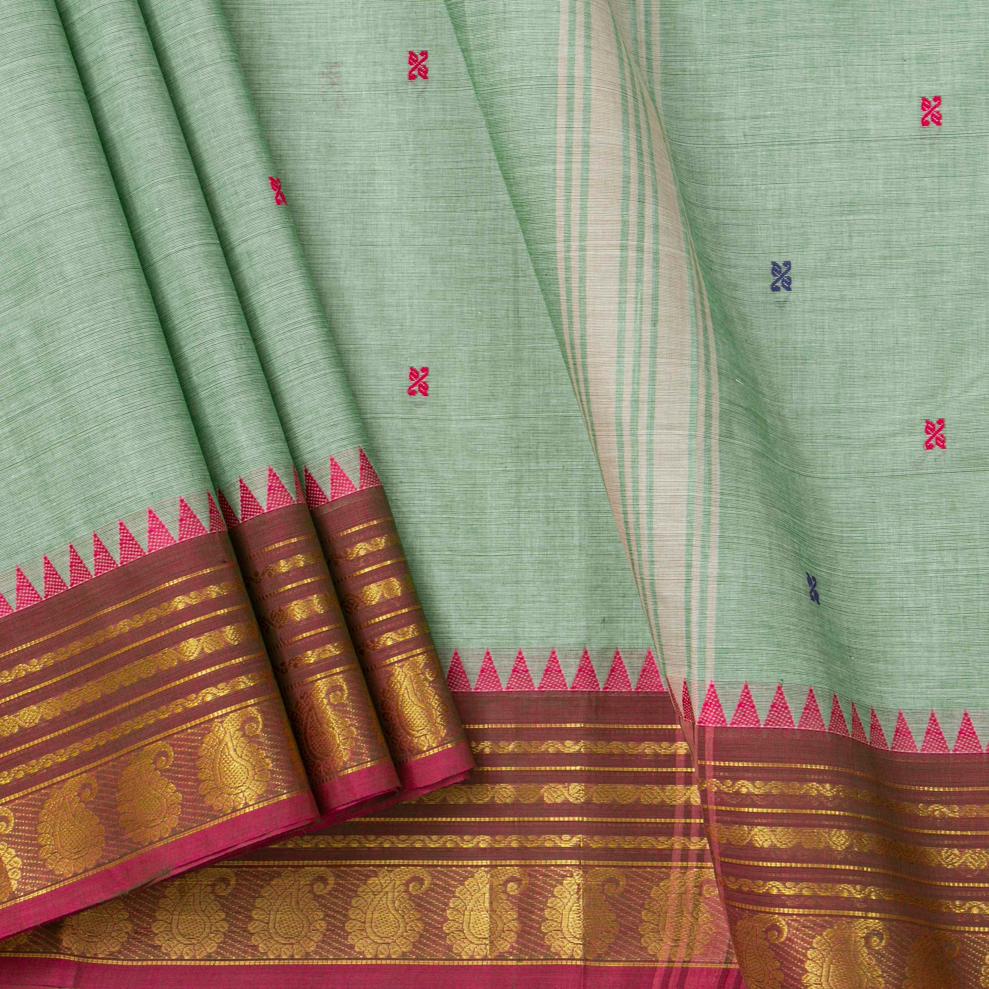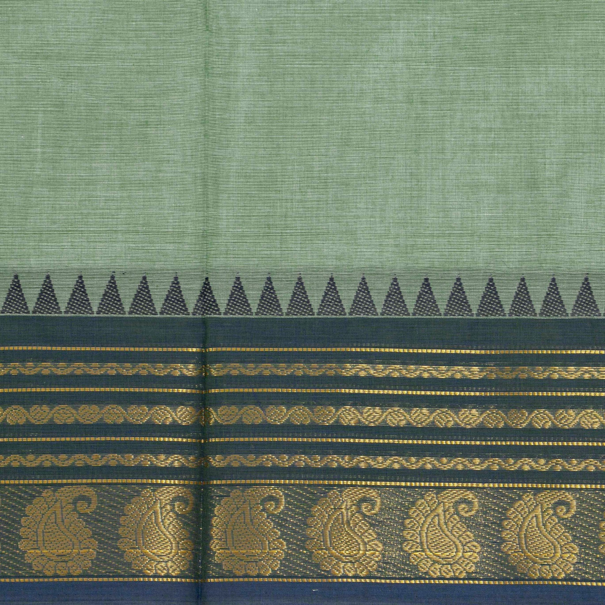 Pista green kanchi cotton saree with a green and brown ganga jamuna border having rich gold zari work with attached blouse.