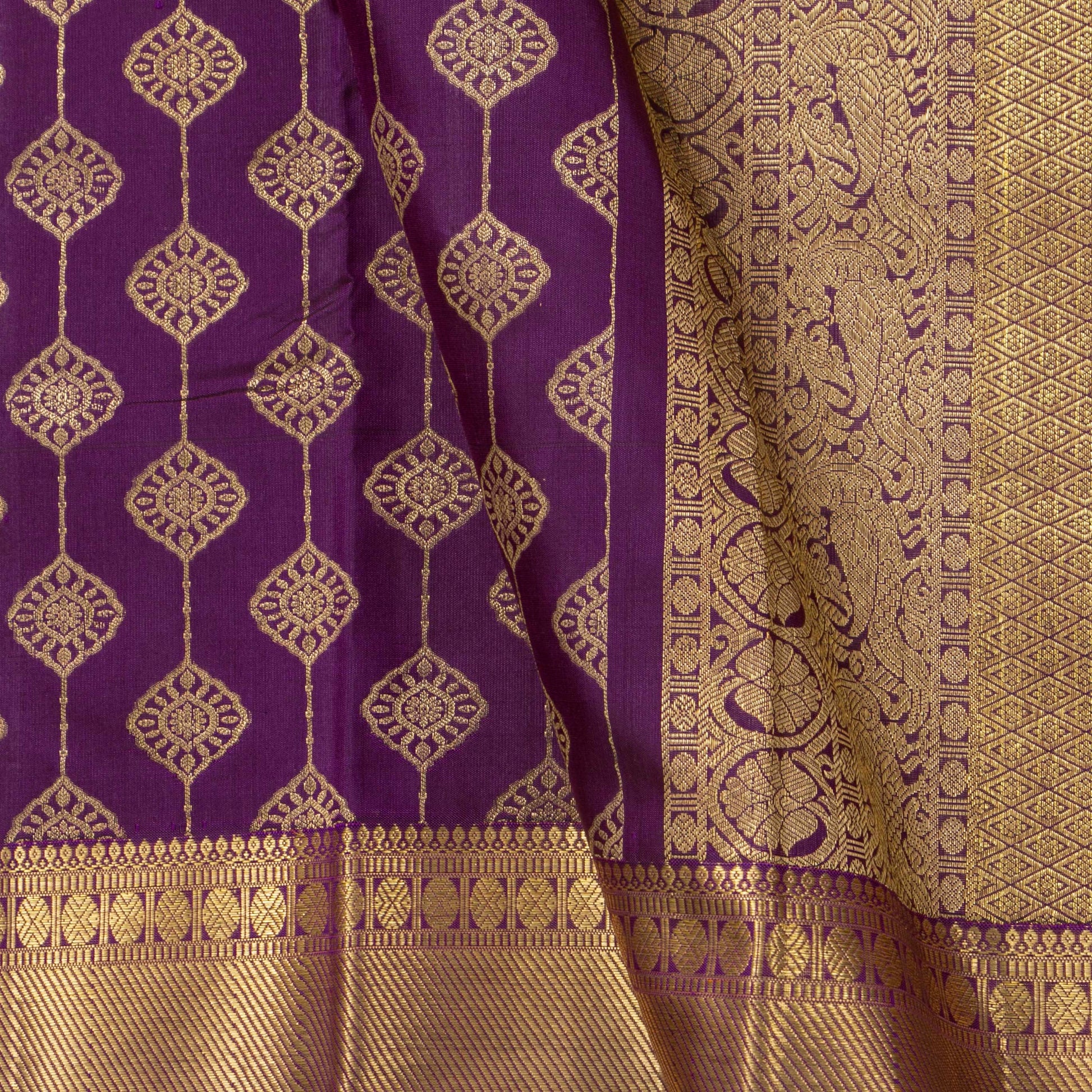 A purple kanchipuram silk saree handwoven in pure silk and pure zari. The body in purple has floral gold zari motifs all over strung on zari stripes with self borders having rich gold zari work in geometric desings with a red selvedge. The pallu has rich gold zari work with diamond and geometric patterns and the attached purple blouse has a zari arm band for the sleeve matching the saree border.
