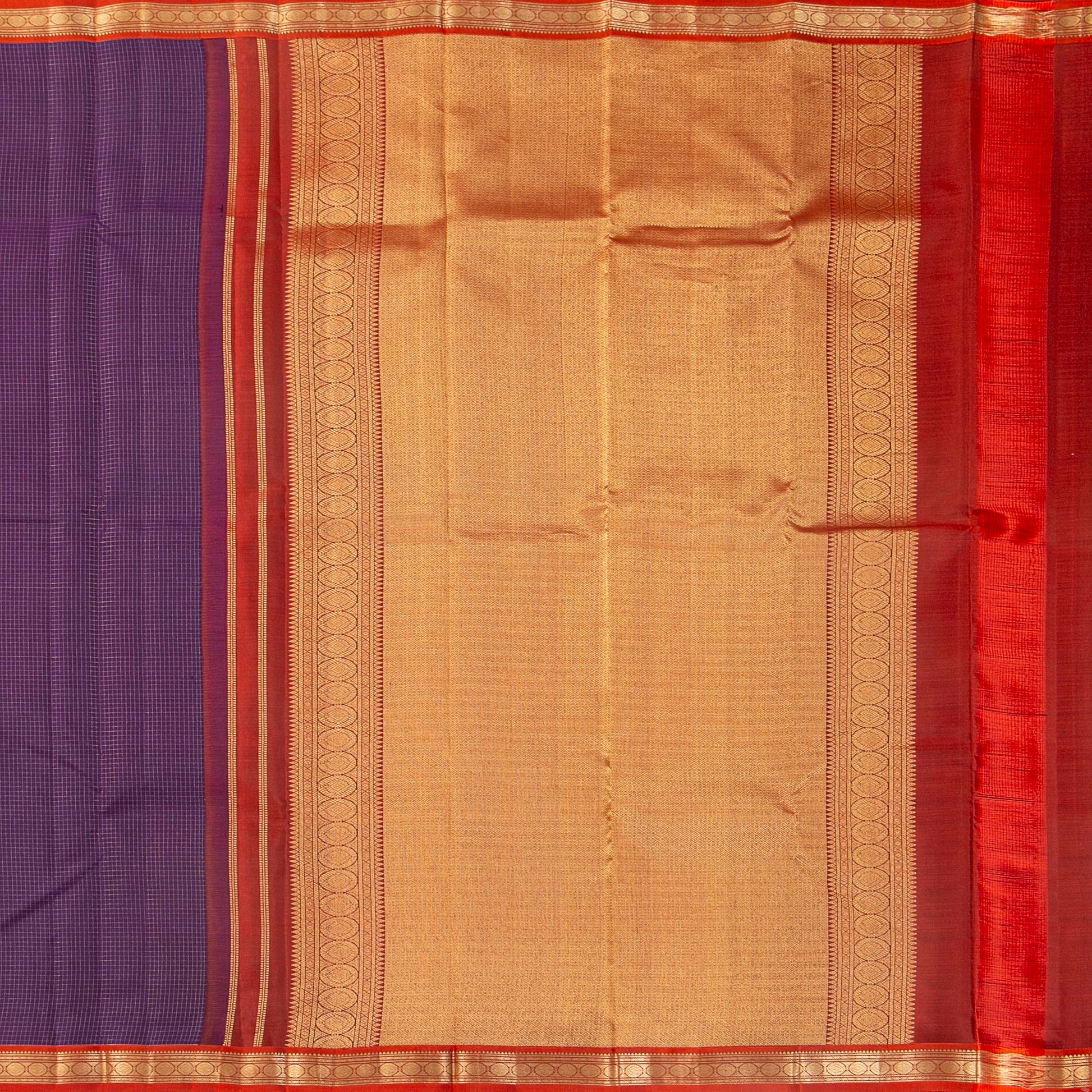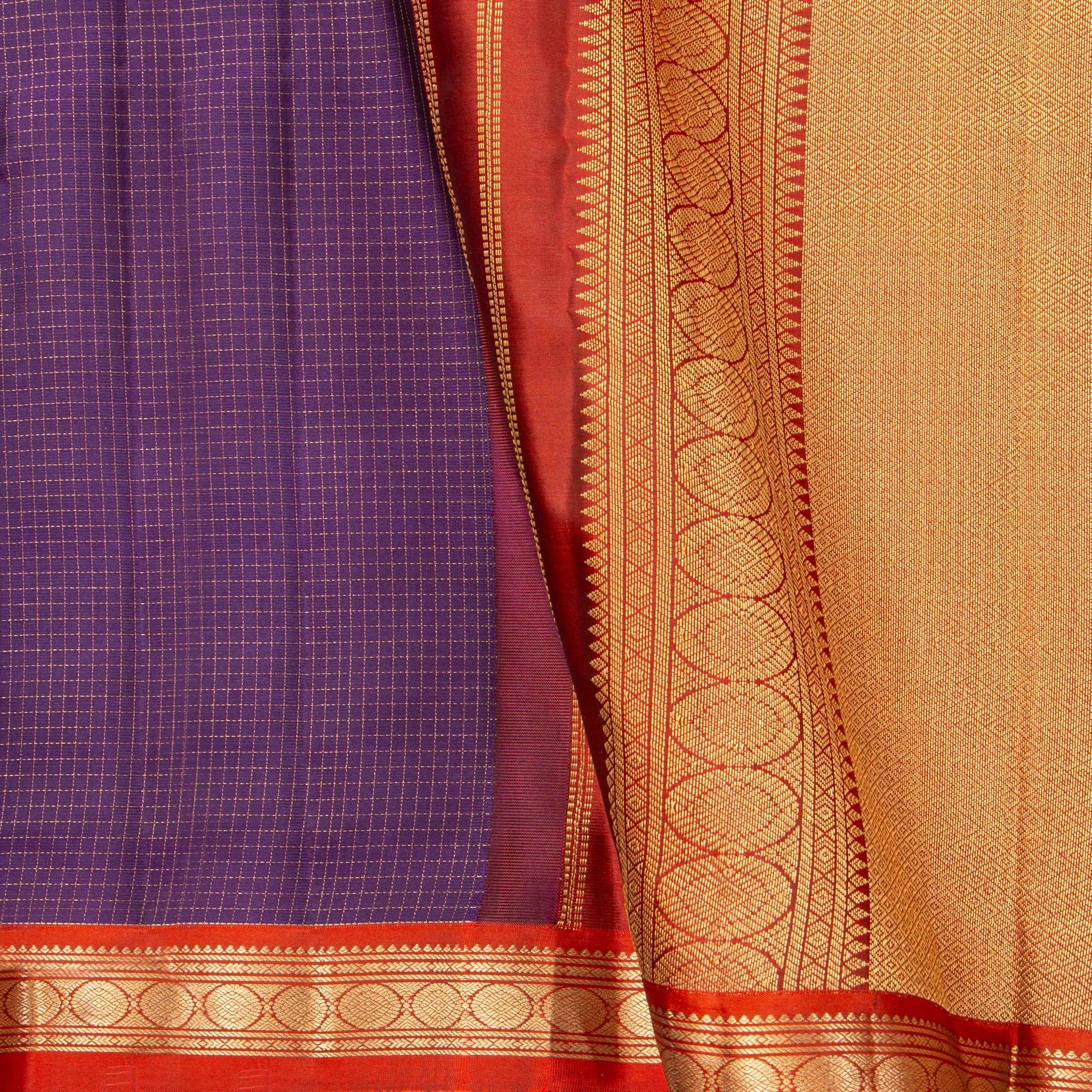 Purple kanchipuram silk saree with fine gold zari checks handwoven in pure silk and pure zari. The body in purple has zari checks all over with contrast borders in red with floral chakram motifs in gold zari. and a maroon pallu with rich gold zari work in diamonds arranged in a geometric pattern with an attached blouse in maroon with a zari arm band matching the saree border.
