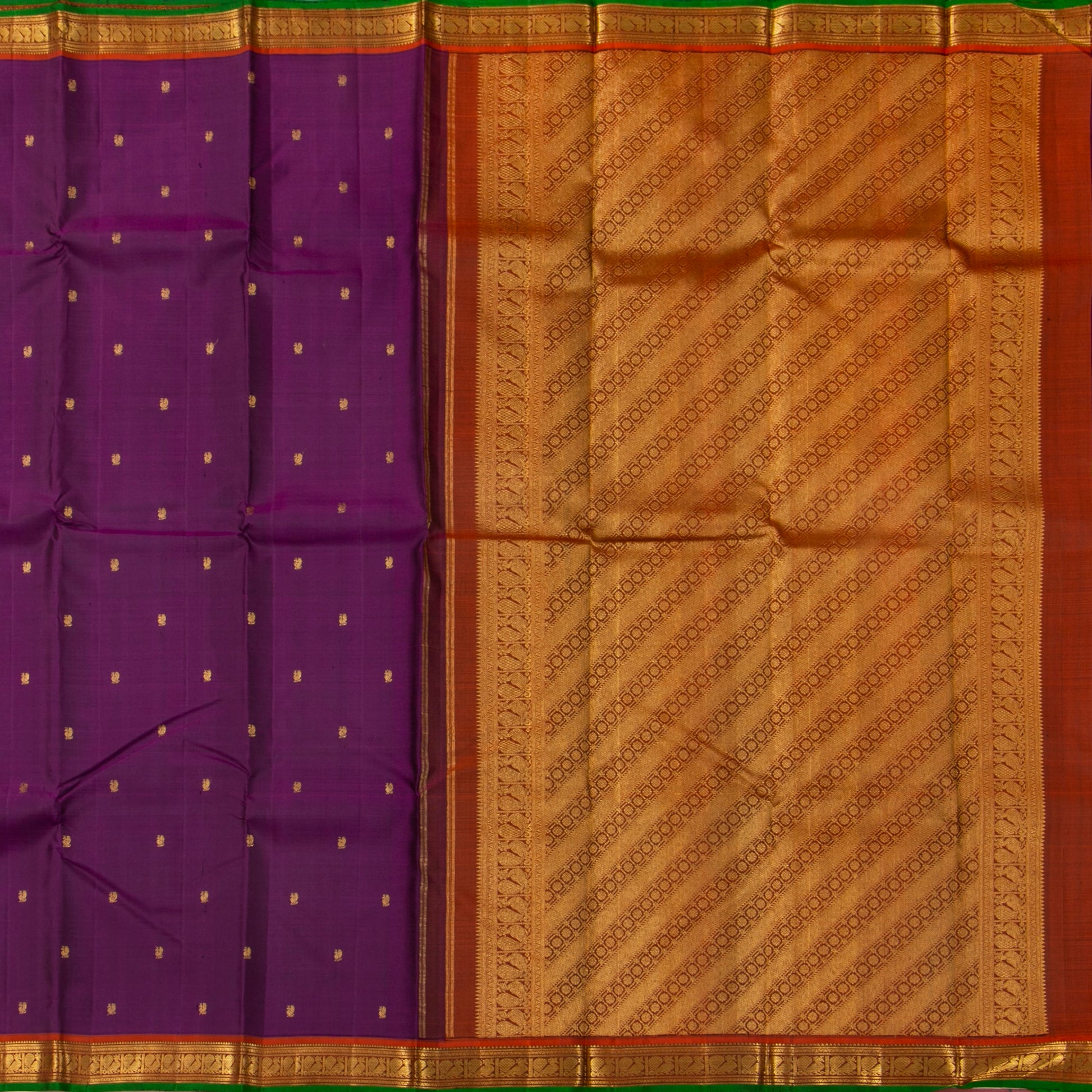 A purple kanchipuram silk saree handwoven in pure silk and pure zari . The body is in purple with peacock motifs in gold zari. The rust border has peacock pettu in gold zari with a green selvedge. The rust palu has floral motifs in gold zari. The attached blouse in rust has a zari band matching the saree border.