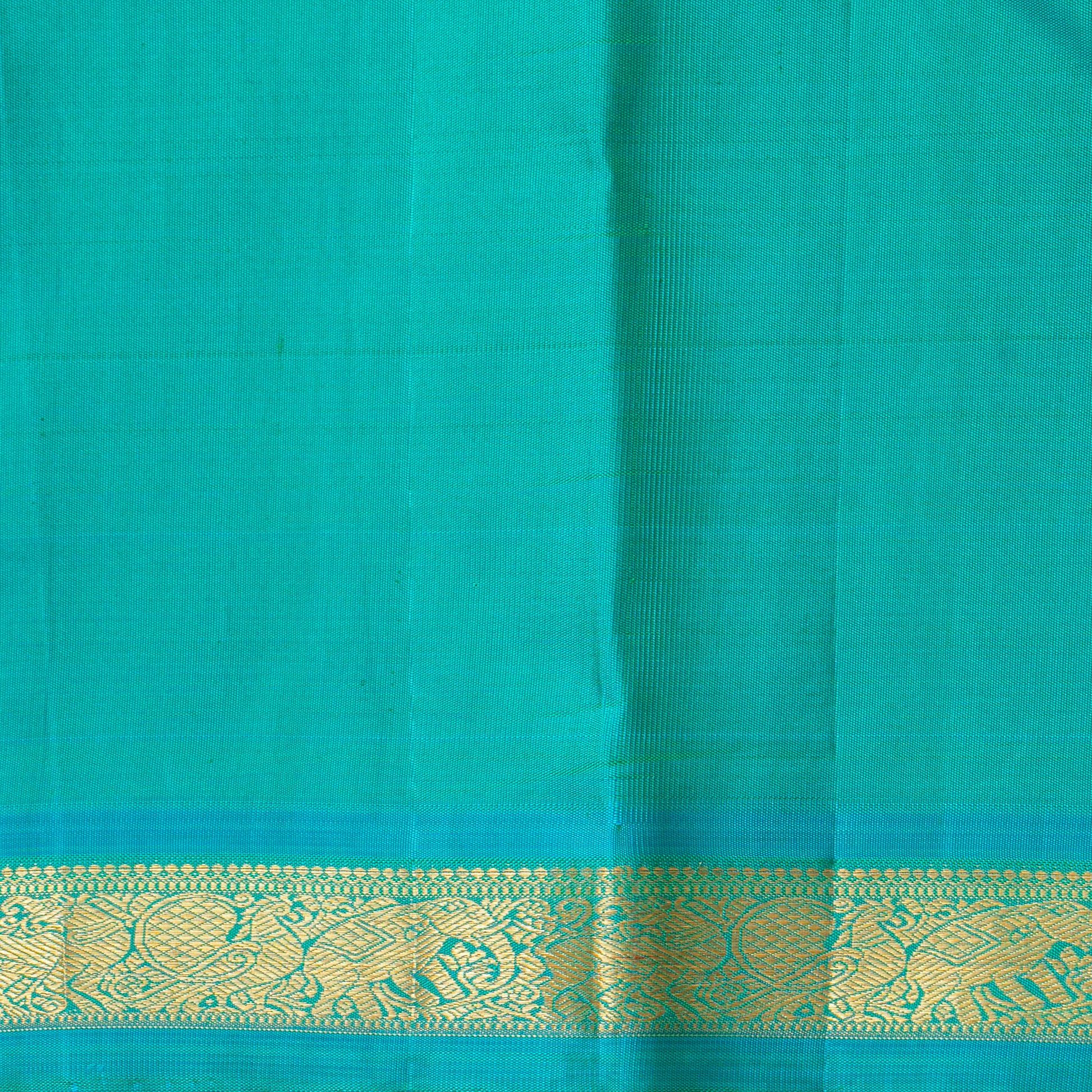 A purple and turquoise green kanchipuram silk saree handwoven in pure silk and pure zari. The body is in deep purple with annapakshi and chakram motifs in gold zari and a turquoise green korvai border with elephant motifs and a turquoise green pallu with rich gold zari work in traditional designs and an attached blouse with a zari band for the blouse sleeve.