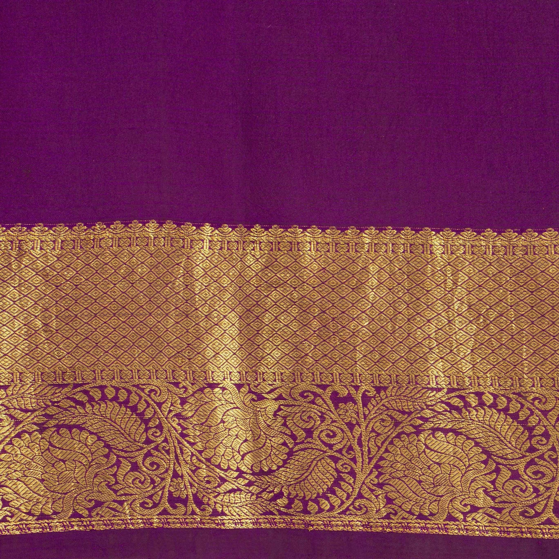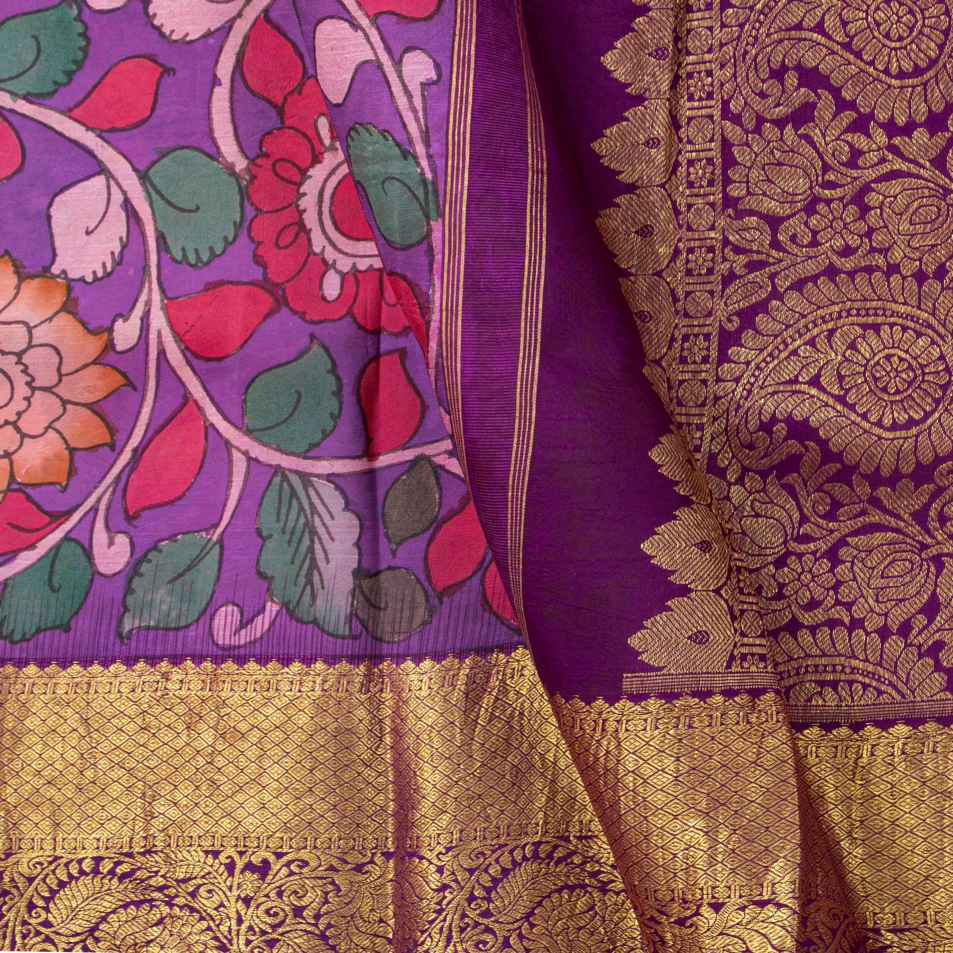 Purple handpainted pen kalamkari work on a kanchipuram pure silk saree with gold zari border. The body is in purple with floral and peacock motifs hand painted using organic vegetable dye. The border has peacock and diamond patterns in gold zari. The purple pallu has paisley and floral patterns in gold zari. The sari comes with an attached blouse.