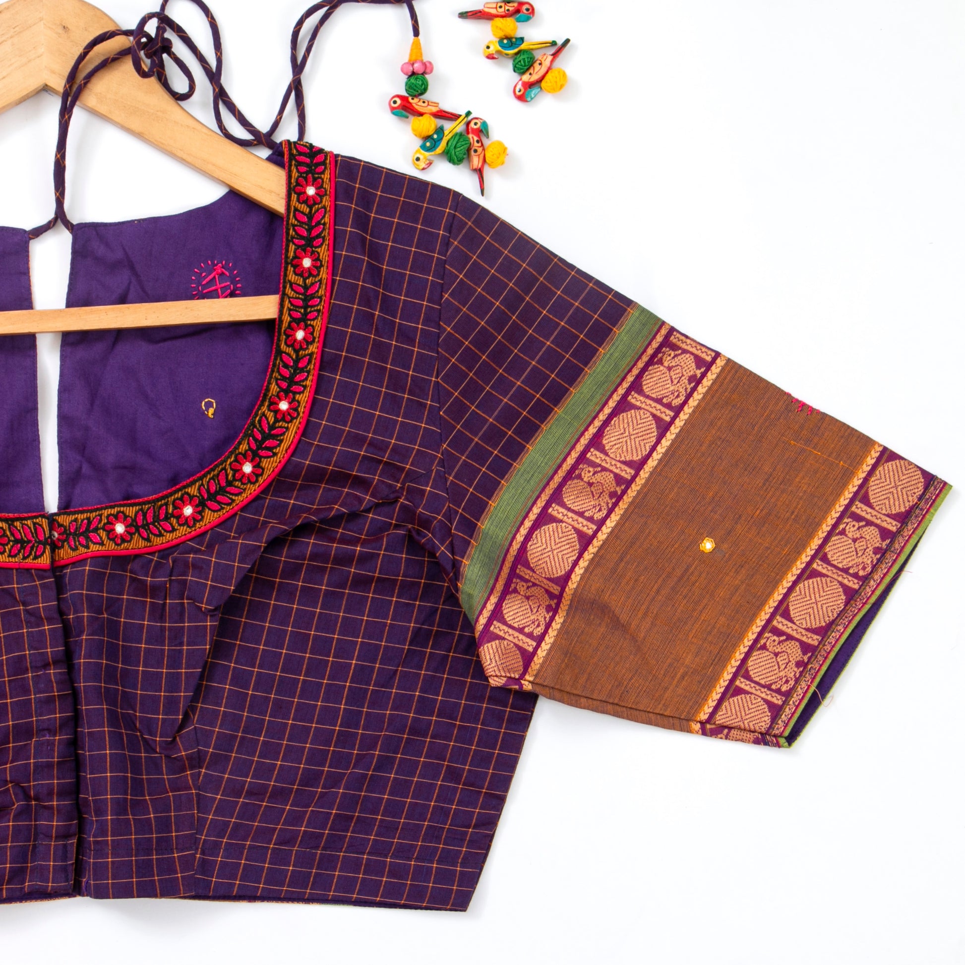Purple kanchi silk readymade blouse with mustard checks and a rettai rudraksha design sleeve and back. The round neck front has hooks in the front and a close neck in the back with a dori.