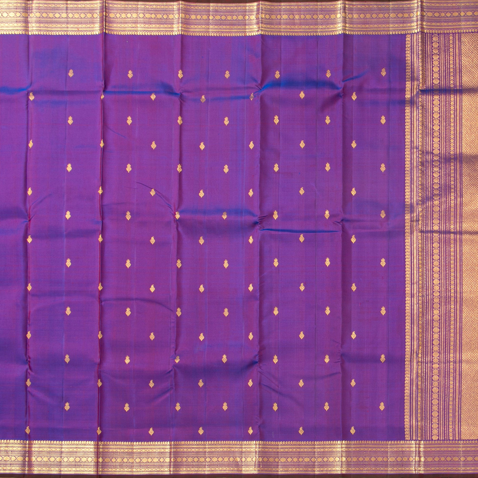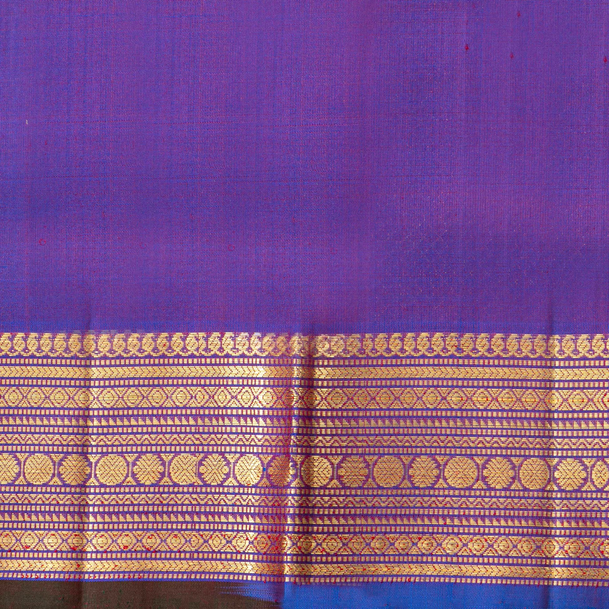 Purple handwoven kanchipuram silk saree woven in pure silk and pure zari. The body is in a dual shade of purple shot magenta with paisley and floral hybrid motifs in gold zari. The borders have rich gold zari in traditional rudraksha chain designs with a brown selvedge and the pallu has rich gold zari work with maiyil kan pattern. The attached blouse in purple haas a zari arm band matching the saree.