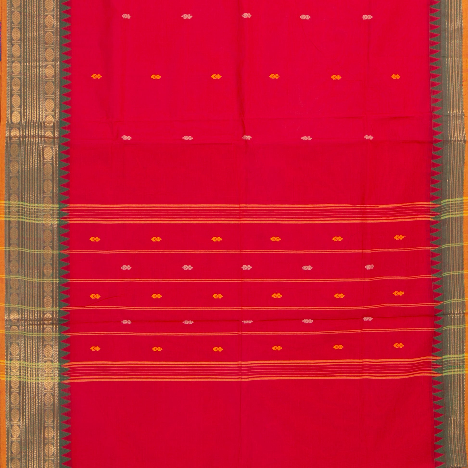 Red kanchi cotton saree with green border on both sides with rich gold zari work and an attached blouse.