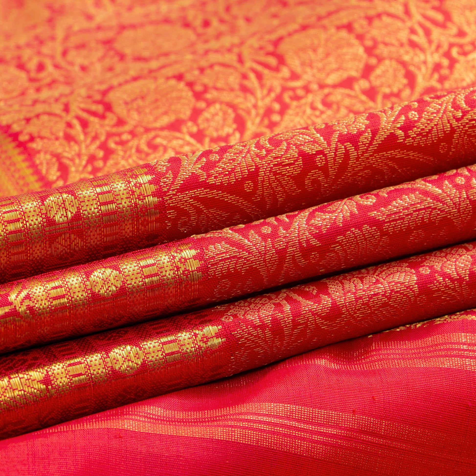 A red original kanchipuram silk saree handwoven in pure silk and pure zari. The body is in red with floral patterns in gold zari. The border has peacock and floral pettu in gold zari . The pallu has peacock, yazhi and diamond patterns in gold zari. The attached blouse is in red with a zari armband matching the sari border.