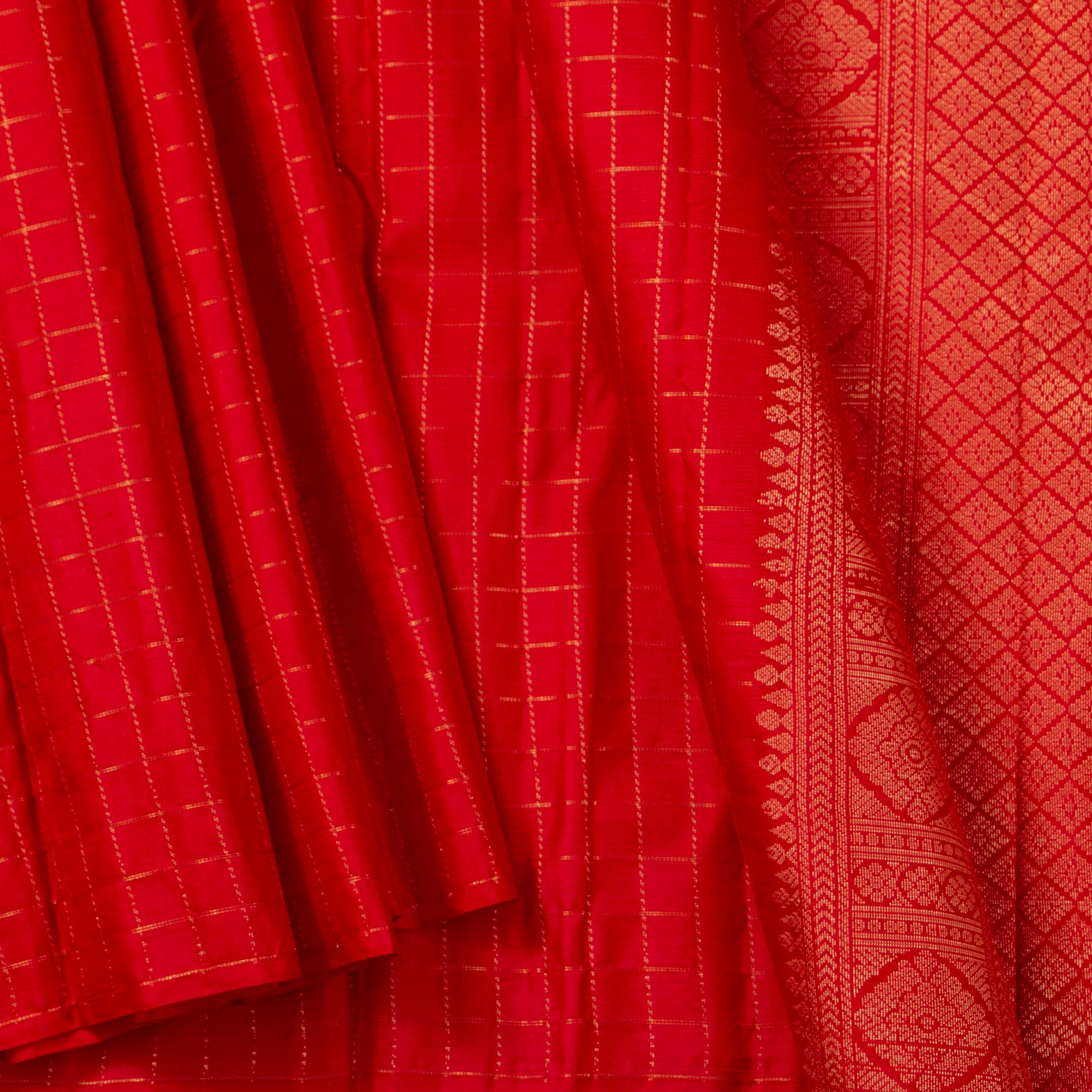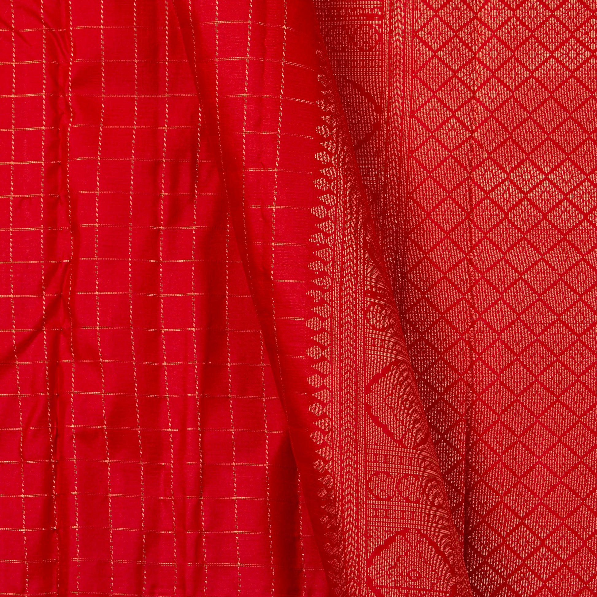 Red kanchipuram silk saree handwoven in pure silk. The body is in red with zari checks across. The red pallu has diamond patterns in antique finish zari. The attached blouse is in red with an armband matching the saree border.