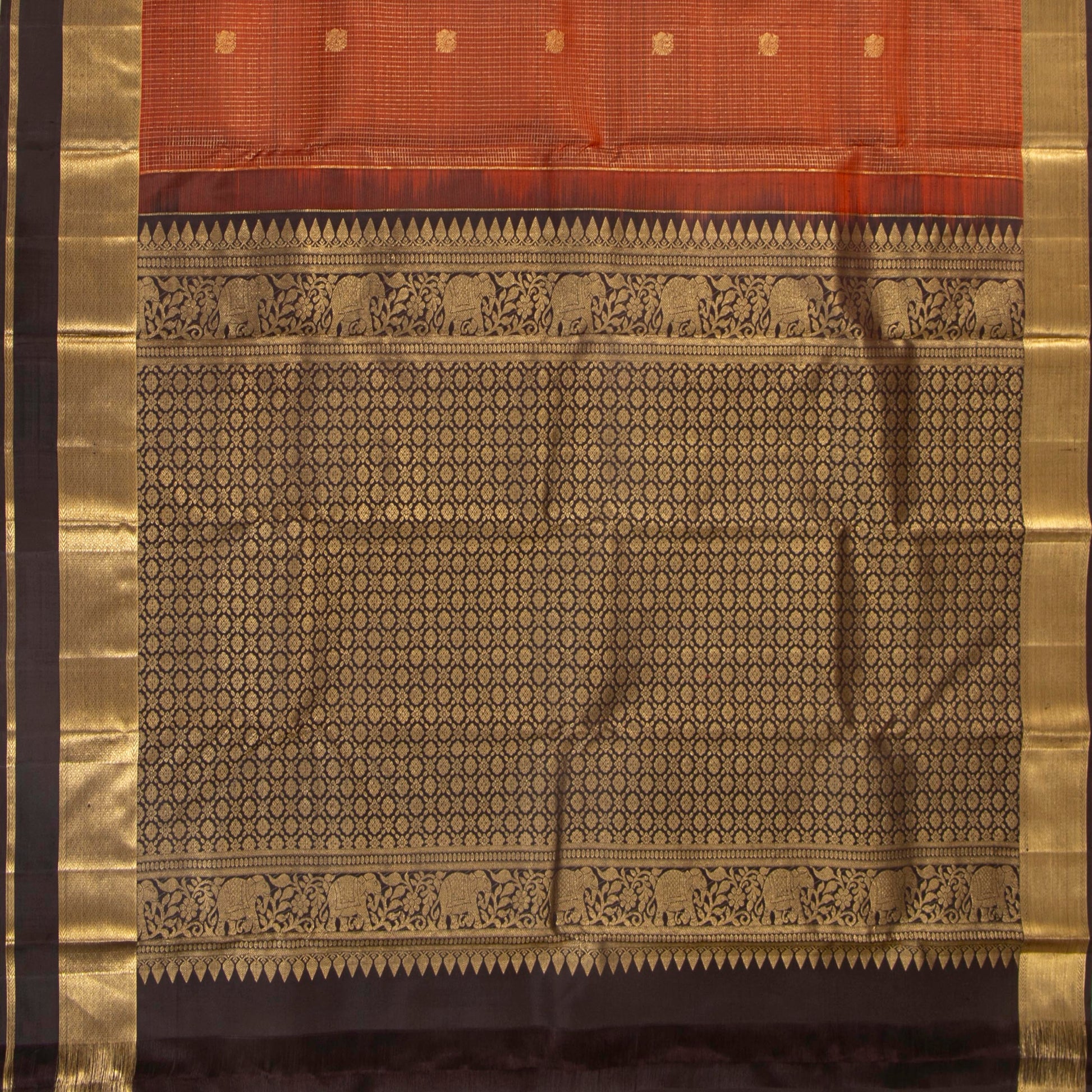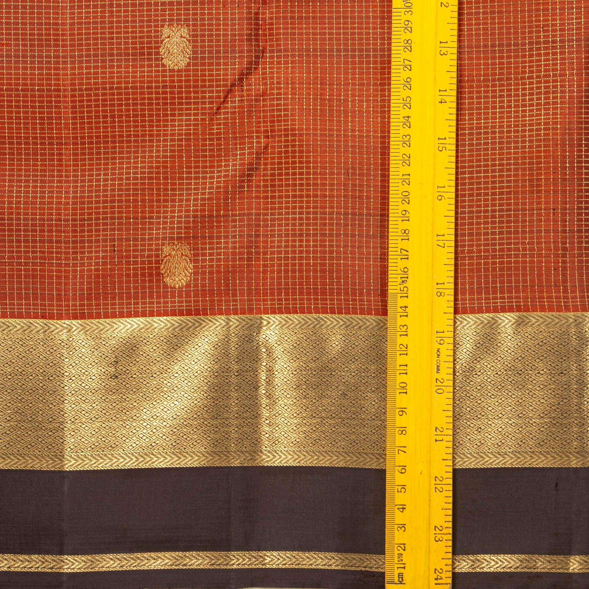 Rust and brown kanchipuram silk saree handwoven in pure silk. The body is in rust with checks, peacock and chakram motifs in gold zari. The brown border has chevron patterns in gold zari. The brown pallu has elephant pettu, floral and diamond patterns in gold zari. The attached blouse is in brown with armband matching the saree border.