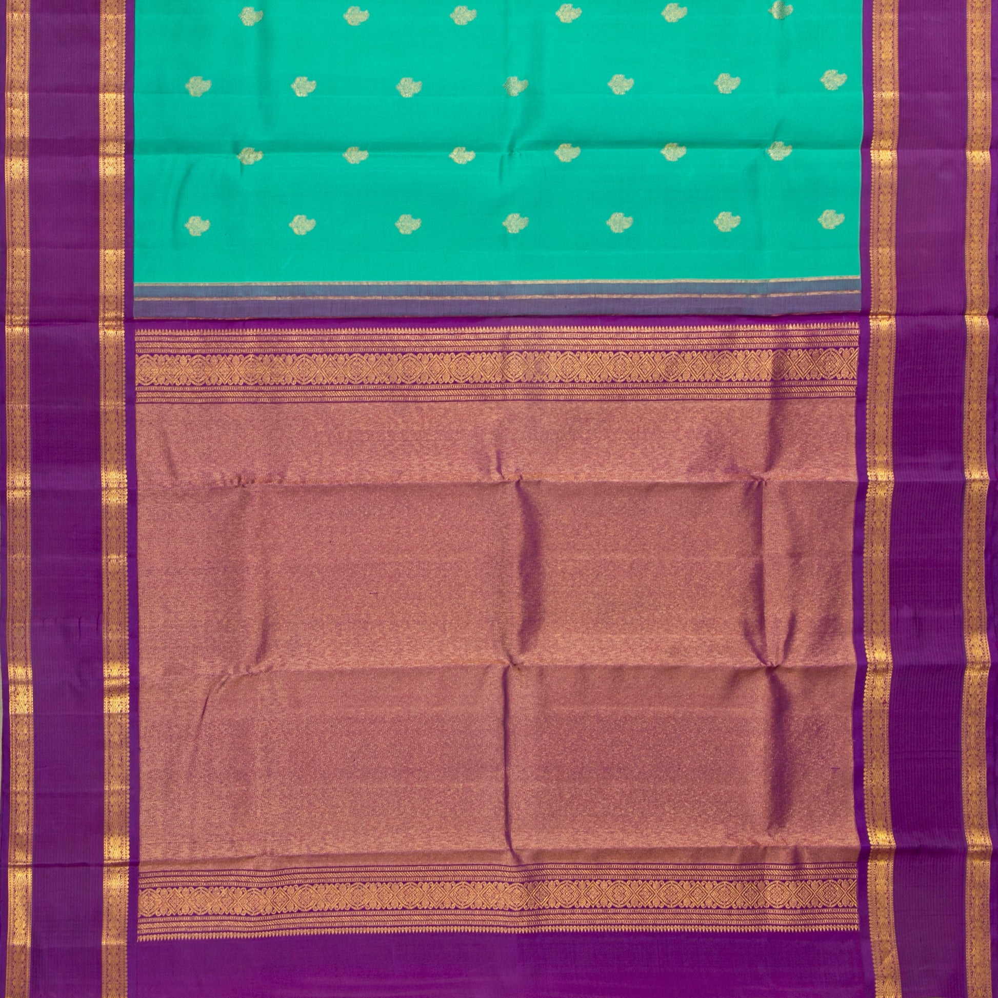 A sea green kanchipuram silk saree handowoven in pure silk and pure zari. The body is in sea green with stylised floral motifs. in gold zari. The purple rettai pettu korvsi borders have gold zari bands in traditional desgins and the pallu in purple has traditional designs in gold zari. The attached blouse has a zari arm band matching htre saree border.