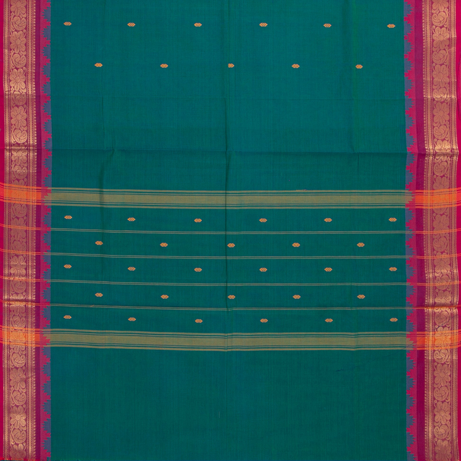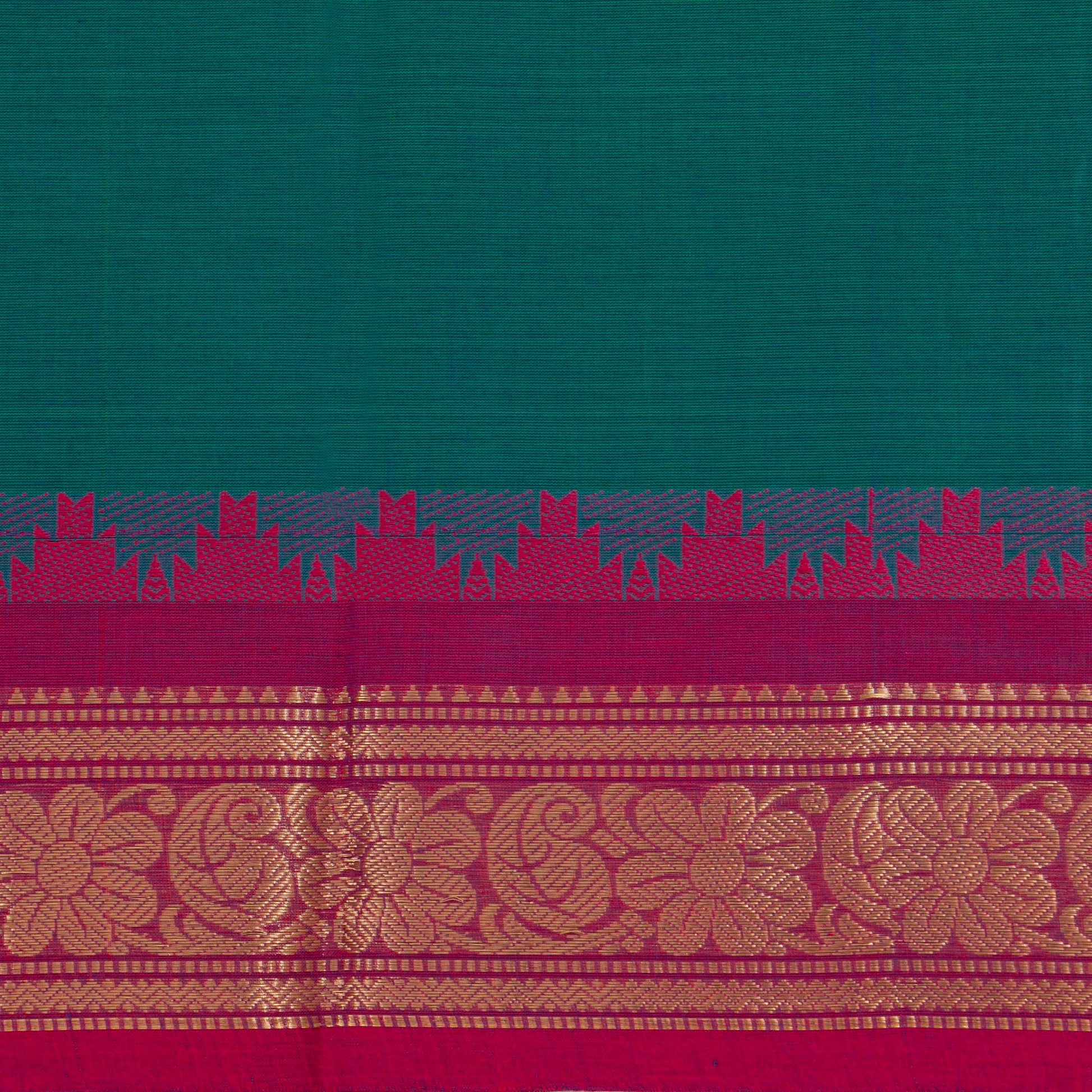Teal kanchi cotton saree with pink borders on both sides with rich gold zari work and an attached blouse.