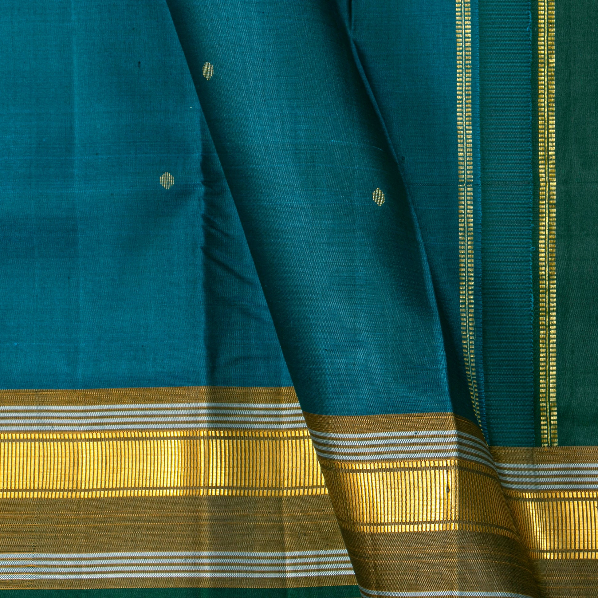 Teal kanchipuram silk saree handwoven in pure silk and pure zari. The body is in teal with a green border having gold zari bands and a dark green pallu with gold zari work and an attached blouse in green with a zari arm band matching the saree border.