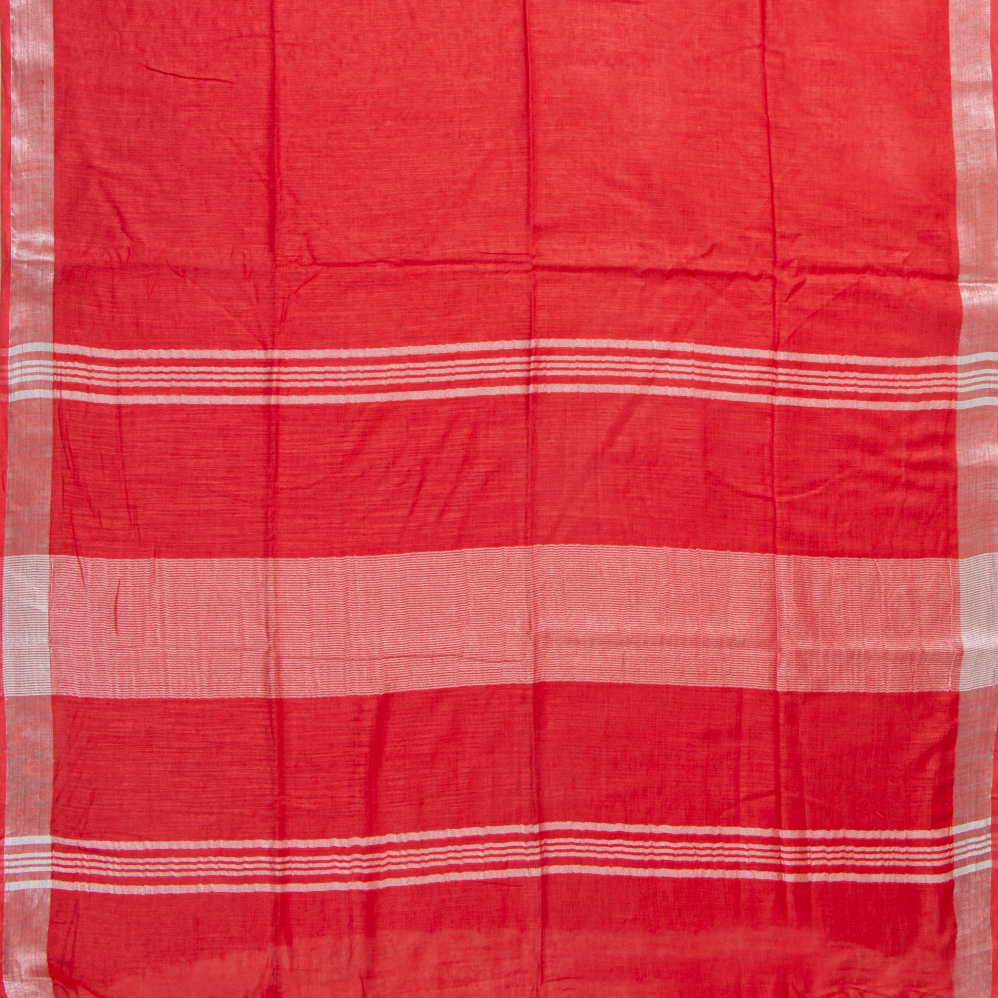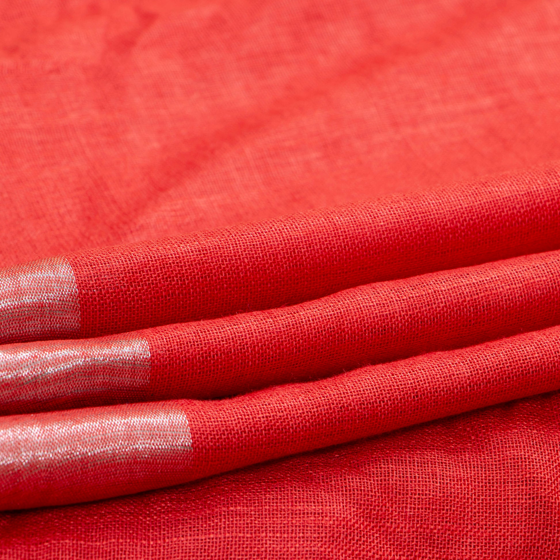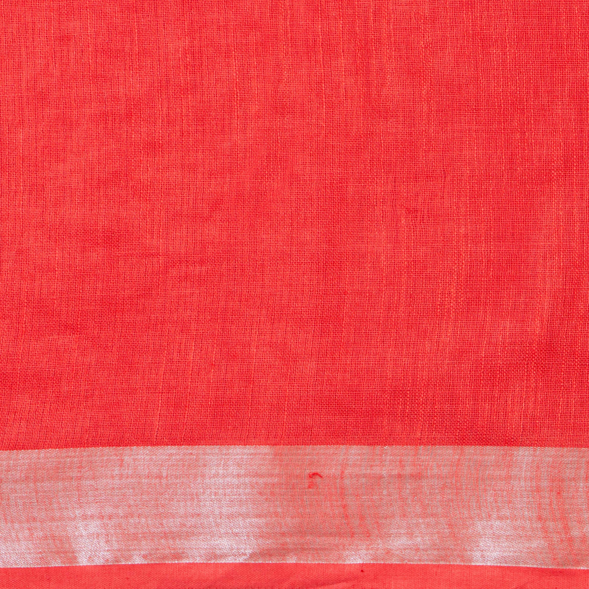 Handwoven linen saree in tomato red with a silver zari border.