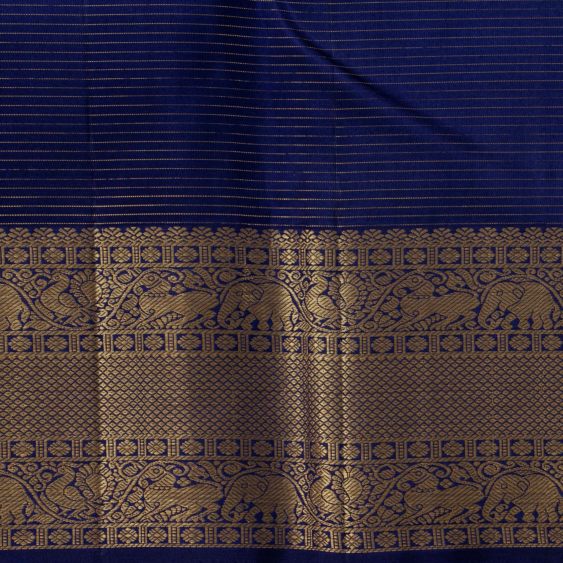 A turquoise and dark blue kanchipuram silk saree handwoven in pure 4 ply mulberry silk and pure zari. The body is in turquoise with fine vaira oosi gold zari stripes and floral motifs in gold zari. The contrast borders and pallu are in dark blue, with traditional designs featuring a central band of maiyil kann motifs flanked by yazhi and elephant motifs hemmed in with kodi visiri designs in gold zari. The pallu has gold zari bands in diamond designs flanked by paisleys in gold zari. The attached blouse is in dark blue with a zari arm band matching the saree border for the blouse sleeve.