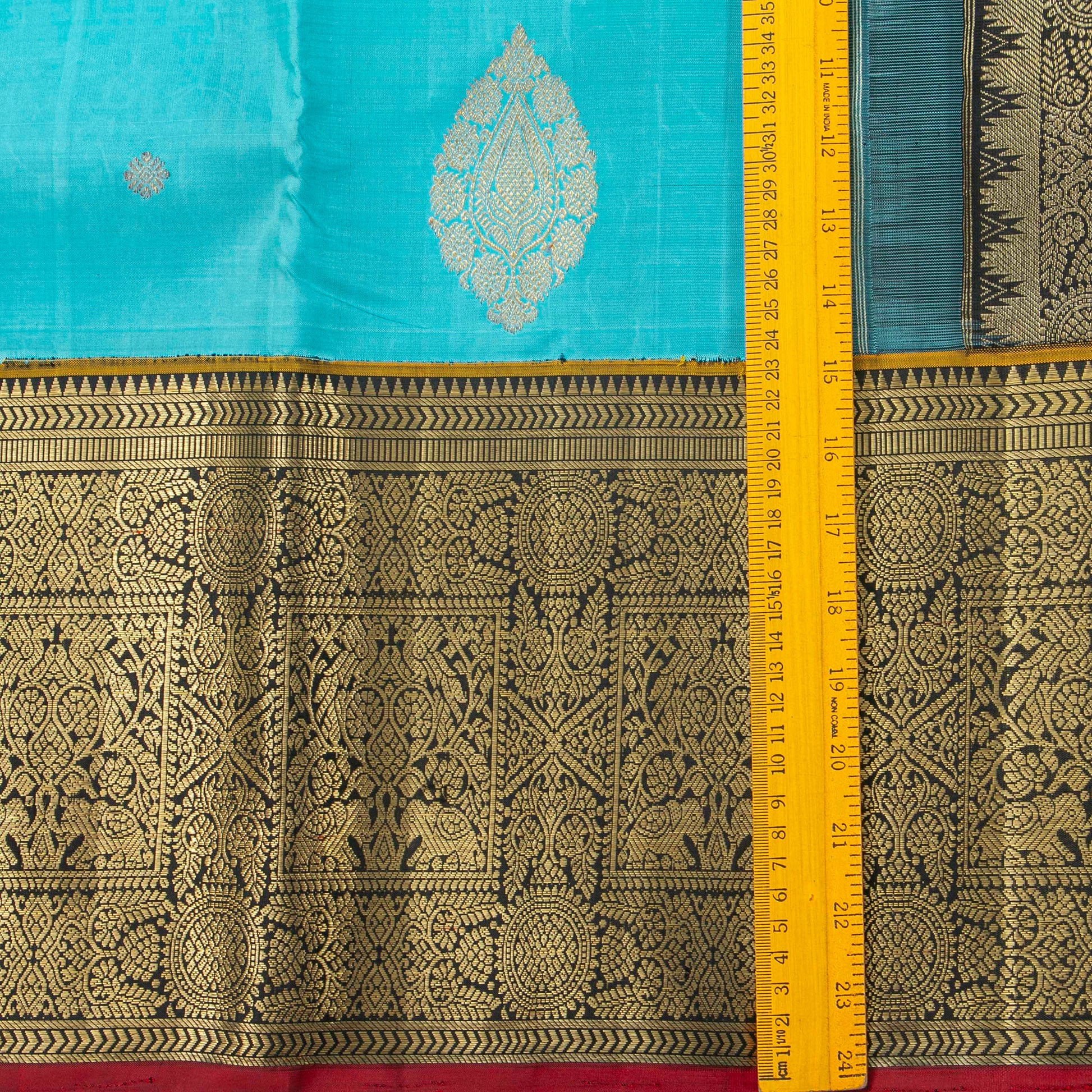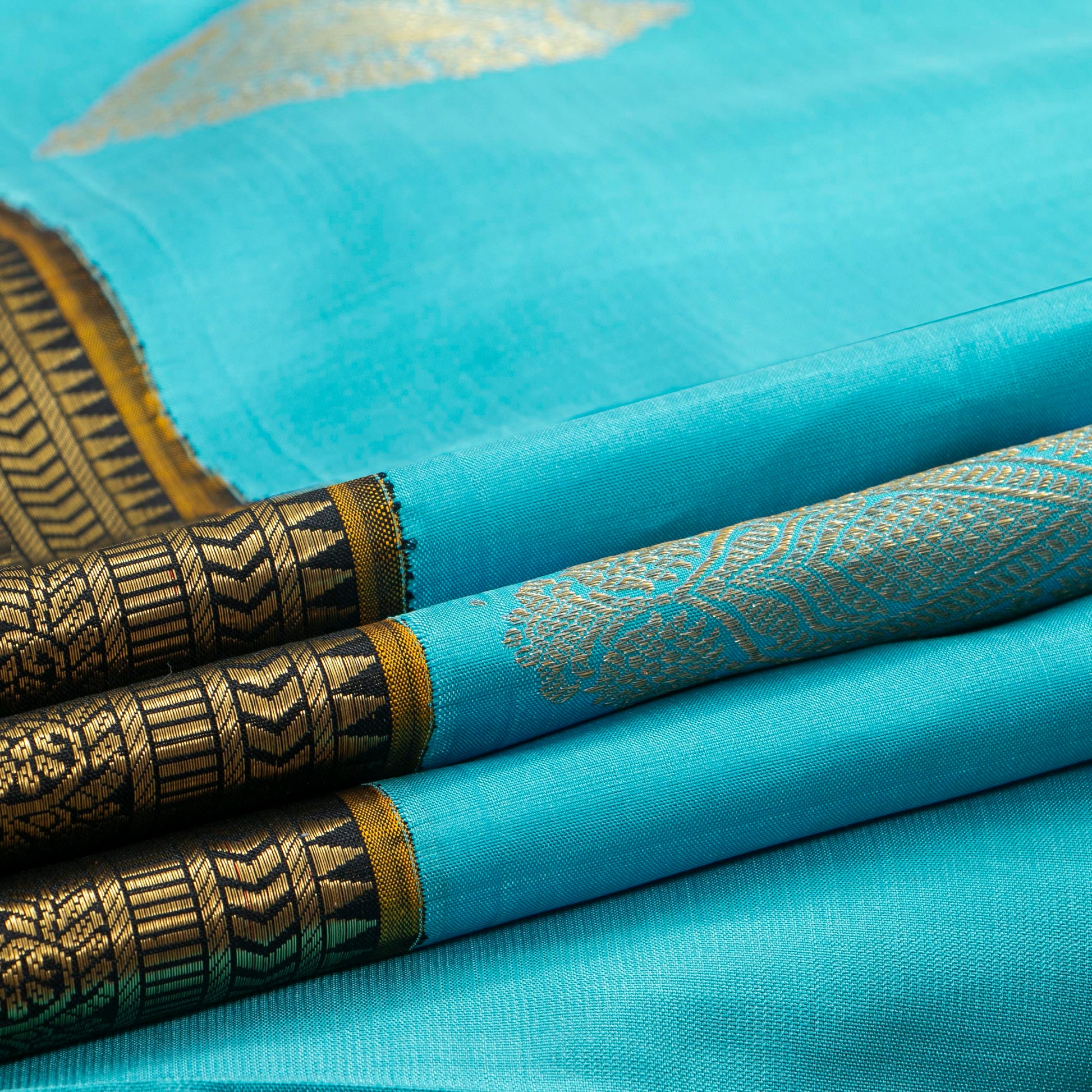 A turquoise blue and black kanchipuram silk saree handwoven in pure silk and pure zari. The body is in turquoise blue with large floral motifs in gold zari and small zari buttas. The morning evening korvai contrast borders are in black with a mustard band inner edge and a red selvedge, with traditional geometric designs in gold zari. The black pallu has rich gold zari work in traditional desings and the attached blouse in black has a zari arm band for the sleeve matching the saree border.