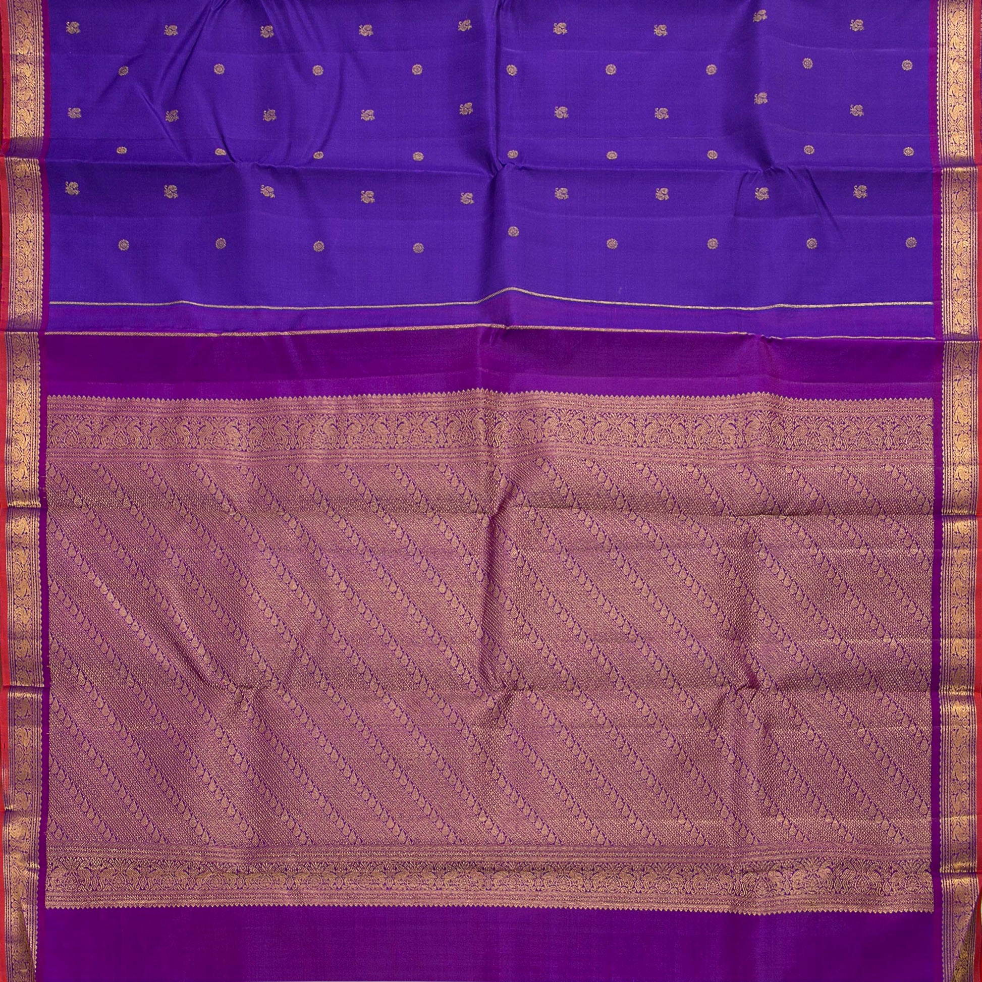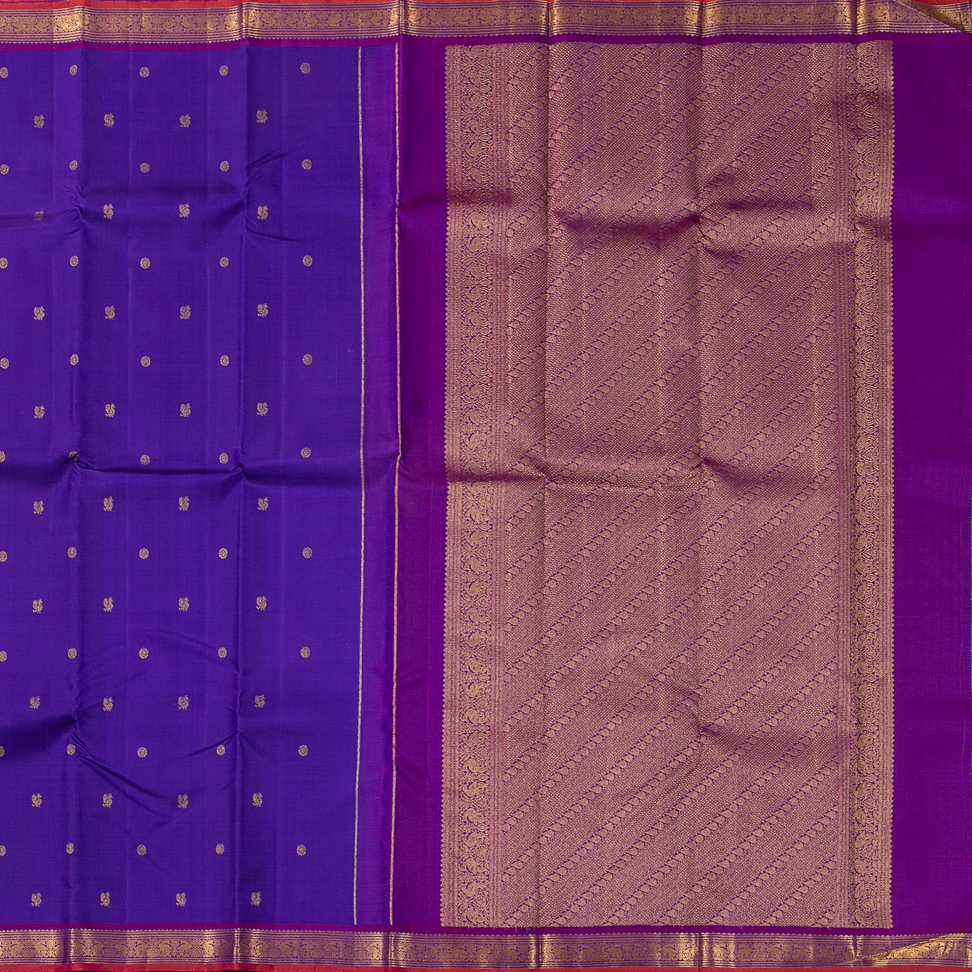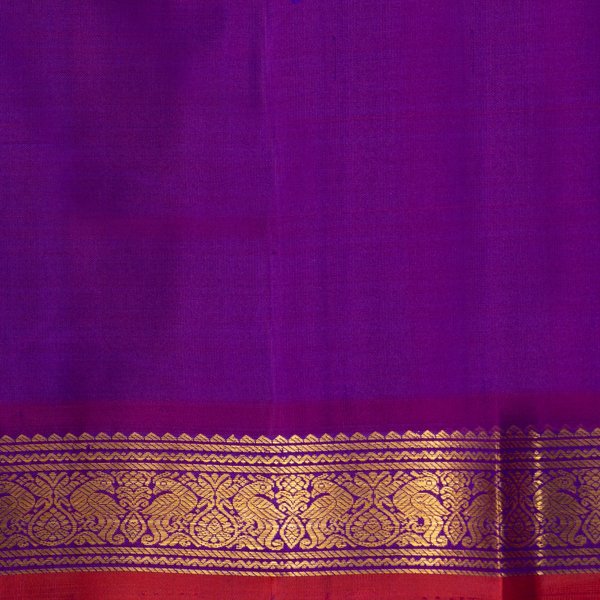 A violet kanchipuram silk saree handwoven in pure silk and pure zari . The body is in violet with annam and chakram motifs in gold zari with a magenta border with traditional patterns in gold zari with a gheva selvedge. The magenta pallu has traditional patterns in gold zari. The attached blouse in magenta has a zari band matching the saree border.