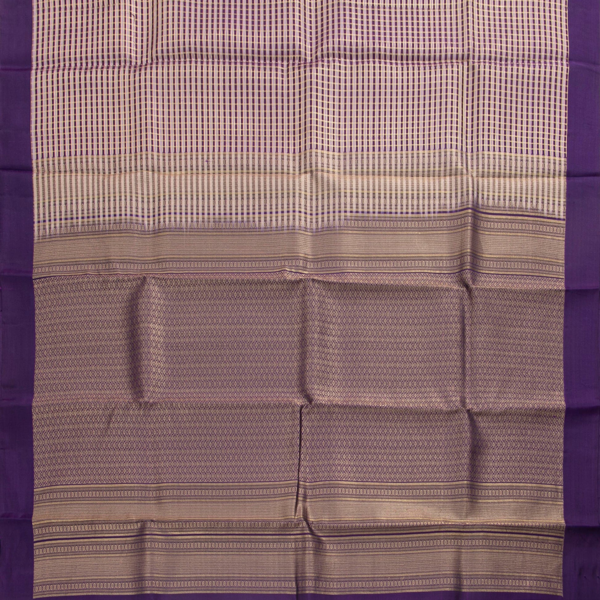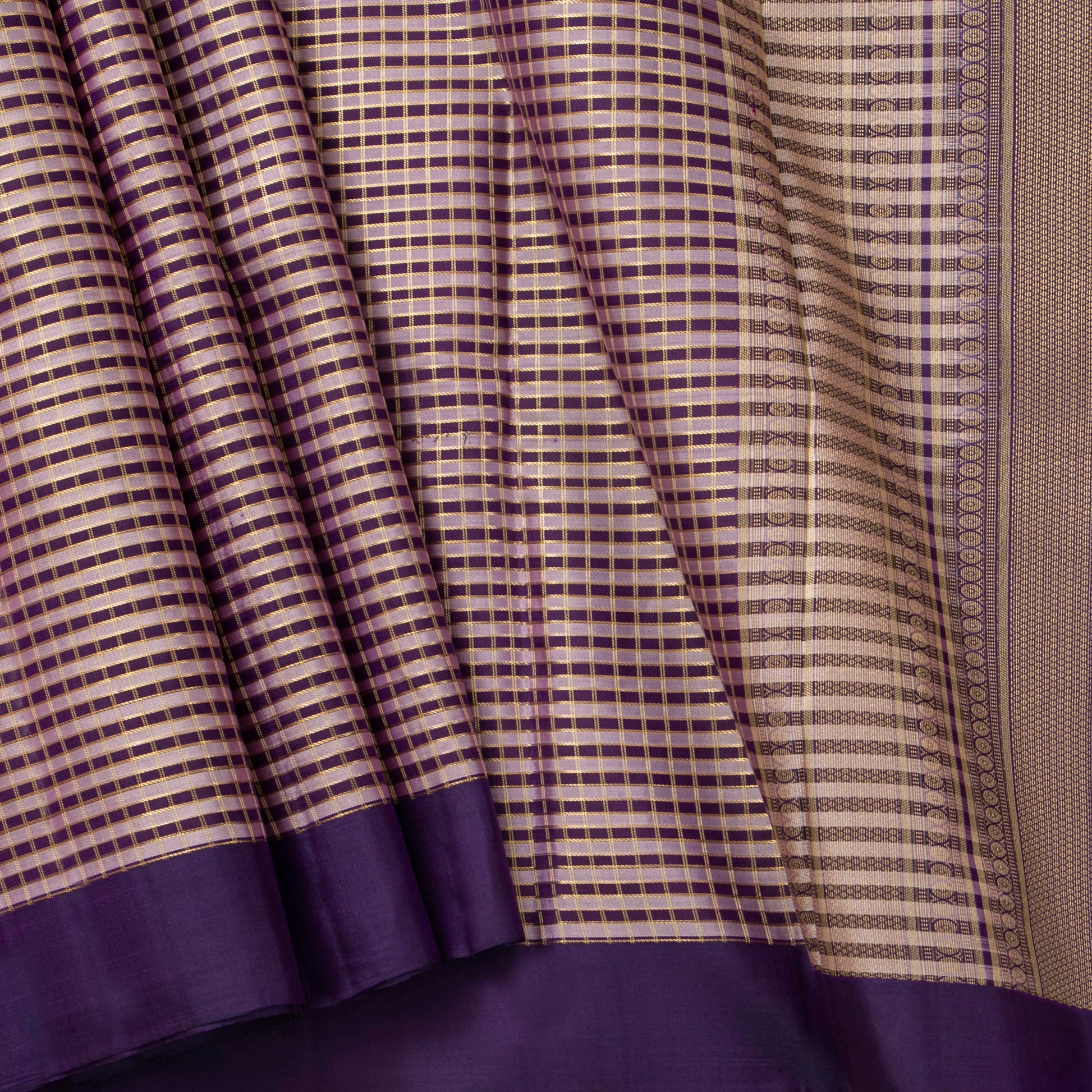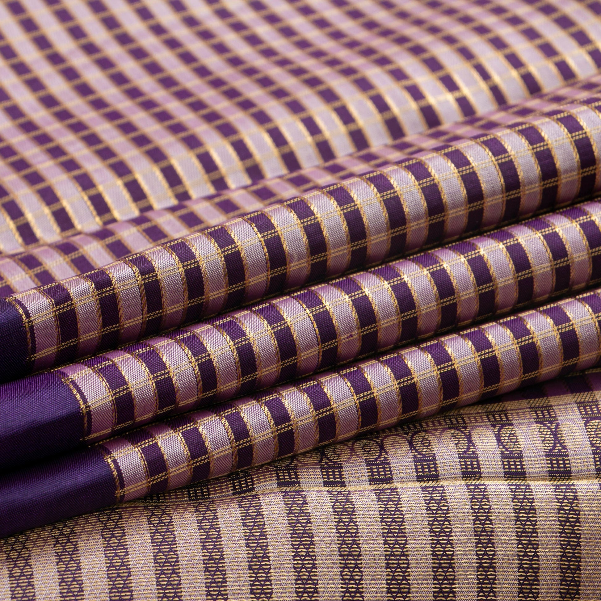 A violet and mauve original kanchipuram silk saree handwoven in pure silk and pure zari. The body has violet and mauve vazhaipoo stripes and muthu checks in gold zari with a violet border. The violet pallu has traditional patterns in gold zari. The attached blouse in violet has a zari band matching the saree border.